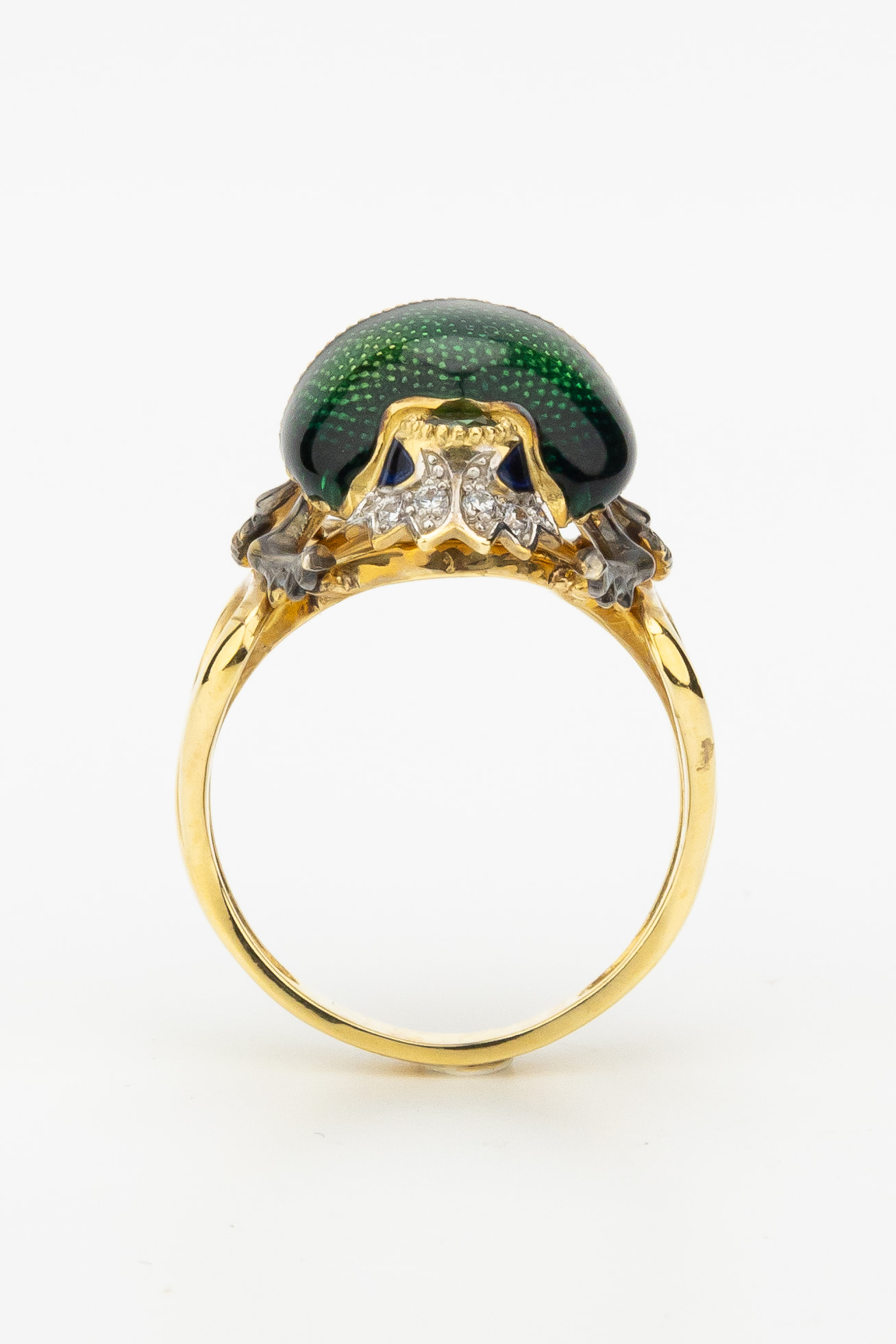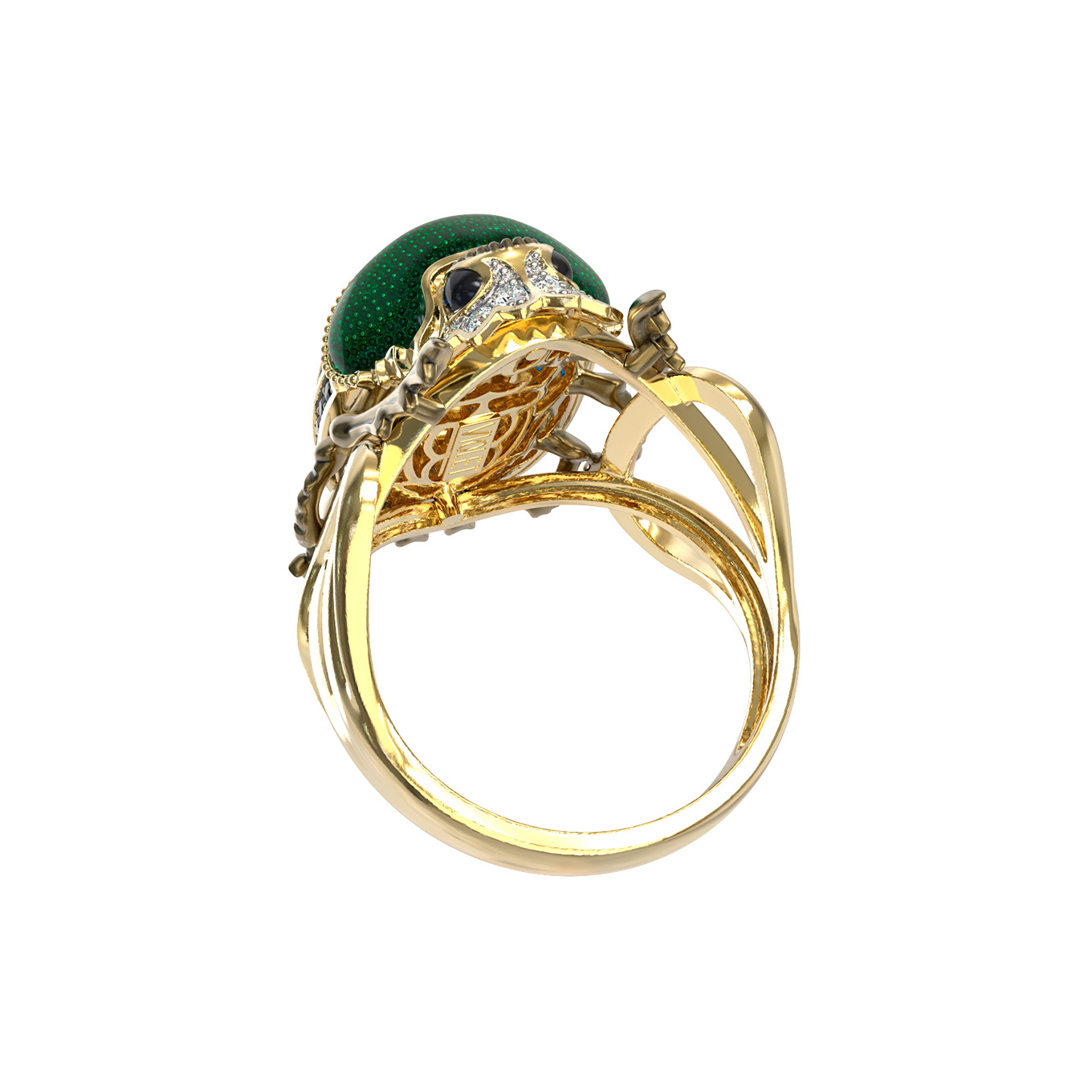 Представляем вашему вниманию уникальное кольцо из лимонного золота 585 пробы, которое станет центральным элементом любого образа. Данное украшение, вдохновленное мистическим дизайном насекомых, входит в De Luxe — Скарабеи. Ювелиры воплотили в этом аксессуаре идею скарабея, создав изделие, которое одинаково эффектно смотрится на женской и мужской руке.