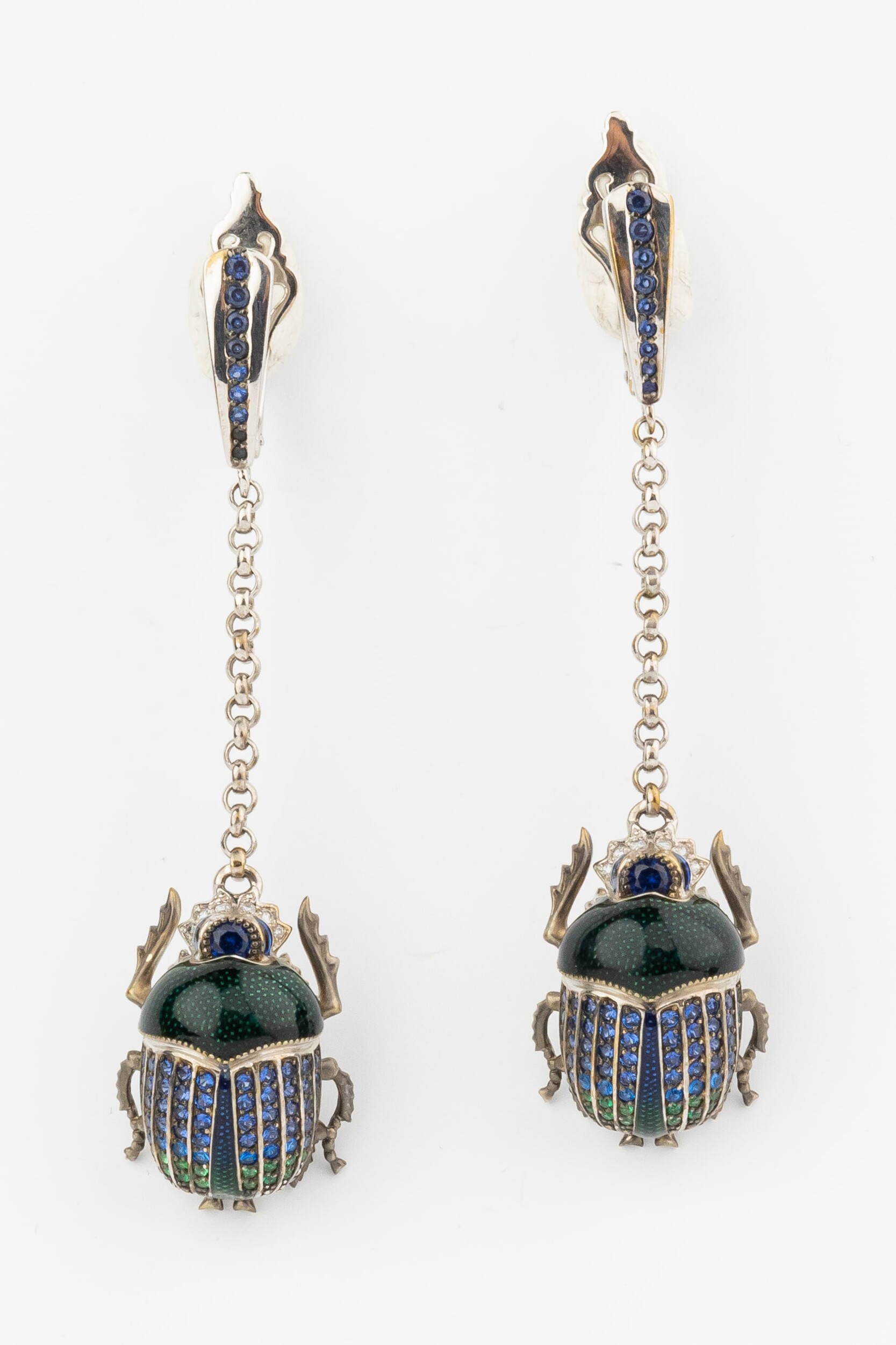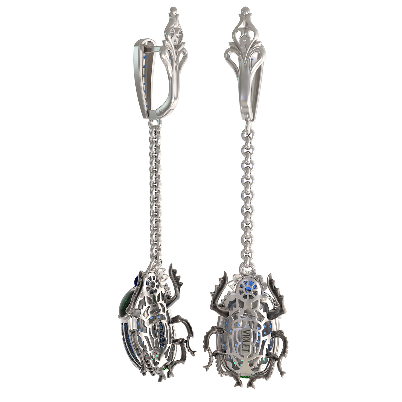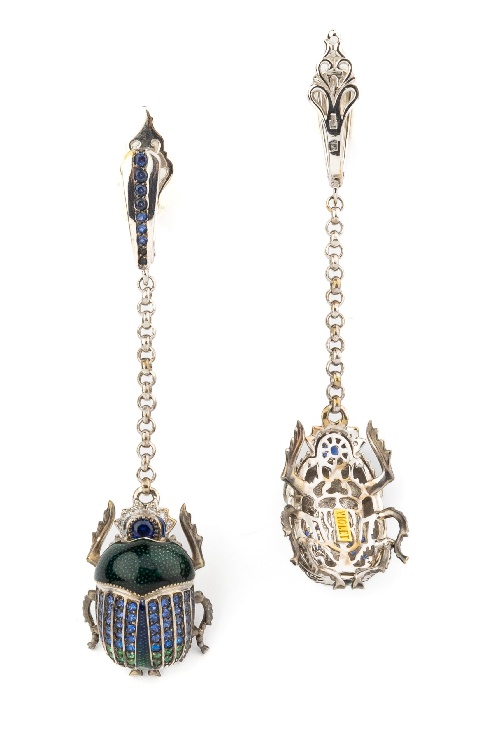 Откройте для себя магию высокой ювелирной эстетики с серьгами из коллекции De Luxe — Скарабеи. Эти роскошные украшения выполнены из благородного белого золота 585 пробы и представляют собой настоящий шедевр ювелирного искусства. Дизайн изделия вдохновлен миром насекомых: центральным элементом композиции является изящная фигурка скарабея, которая приковывает к себе восхищенные взгляды.