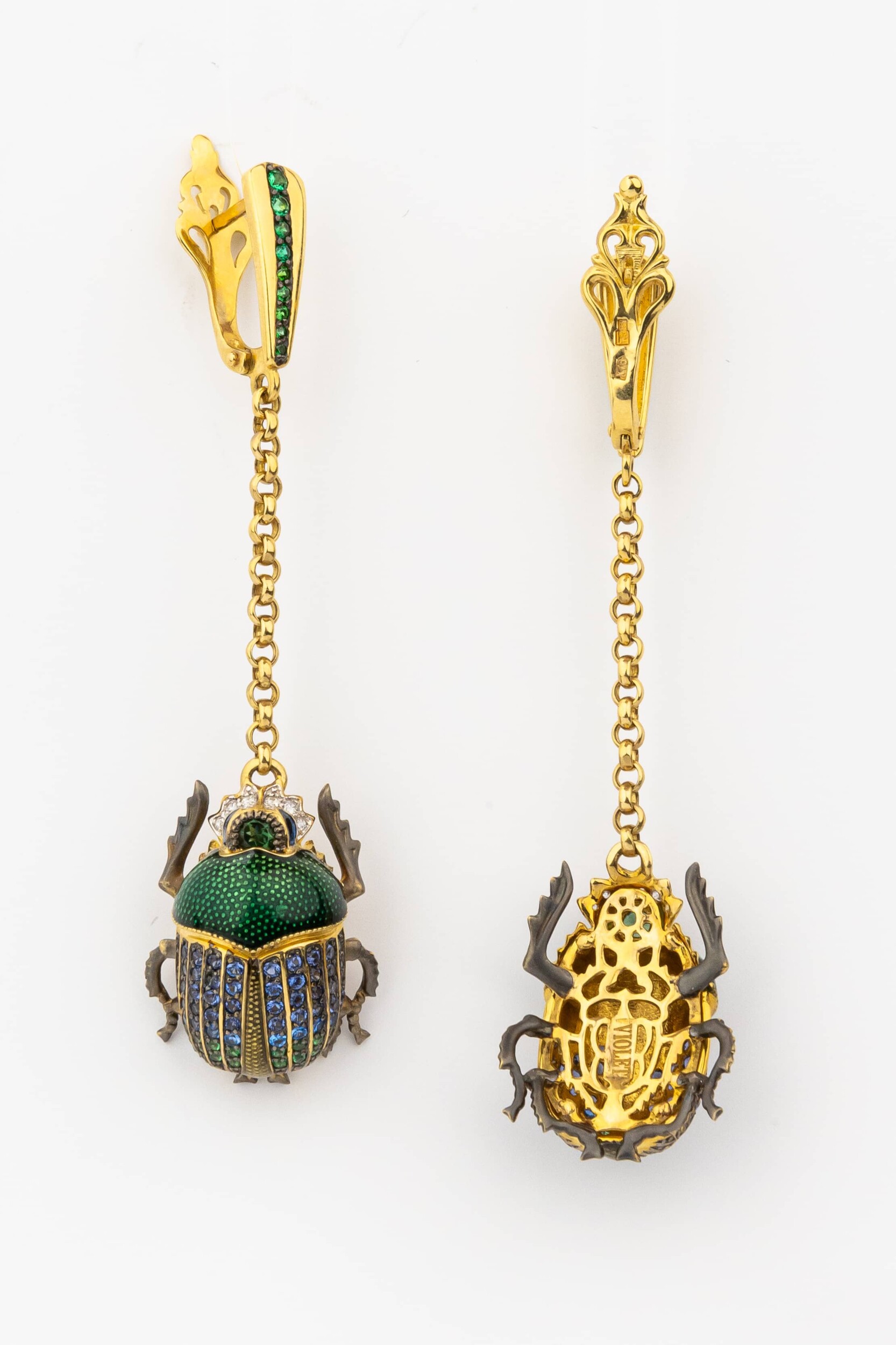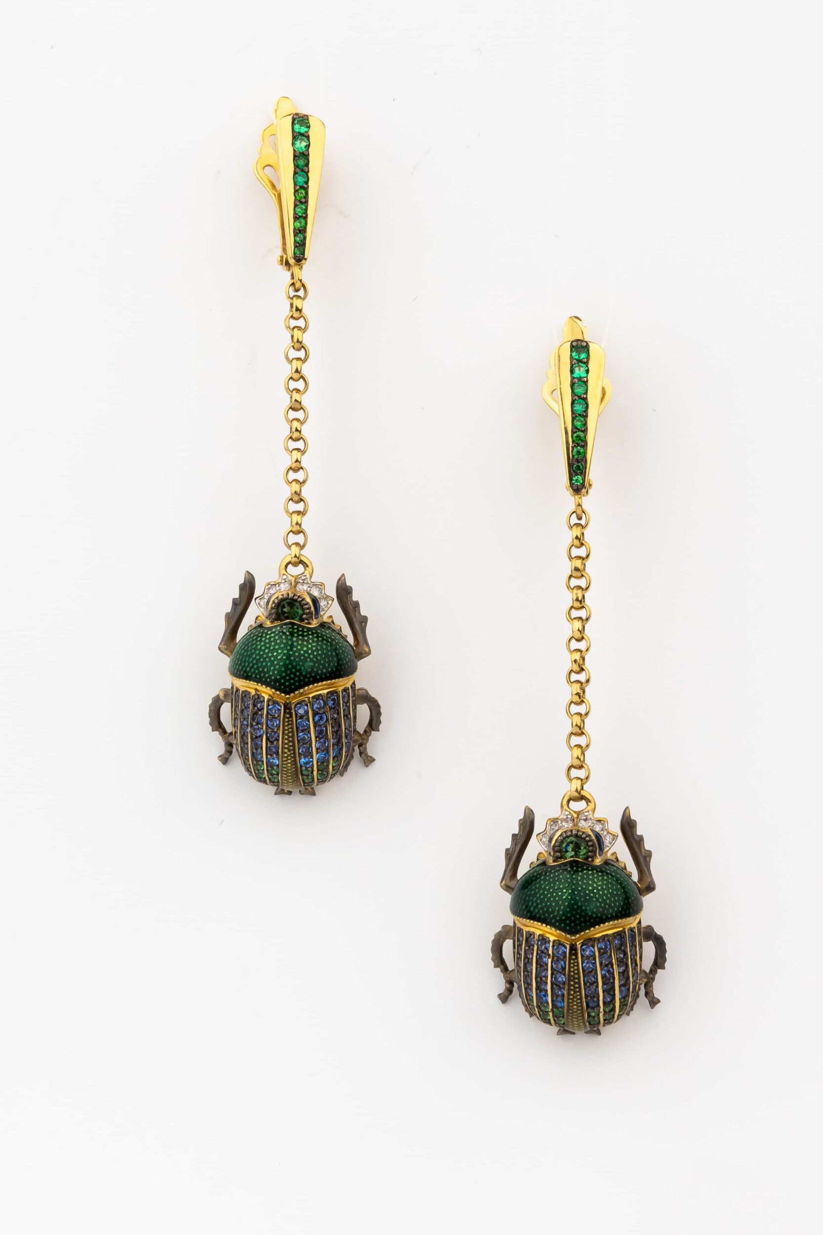 Детально проработанная фигурка насекомого инкрустирована россыпью из 160 драгоценных и полудрагоценных камней. Изысканное сочетание сапфира, турмалина и сверкающего фианита создает завораживающий перелив синего и зелёного цветов. Вставки круглой формы гармонично дополнены высококачественной эмалью, придающей скарабею реалистичность и глубину.