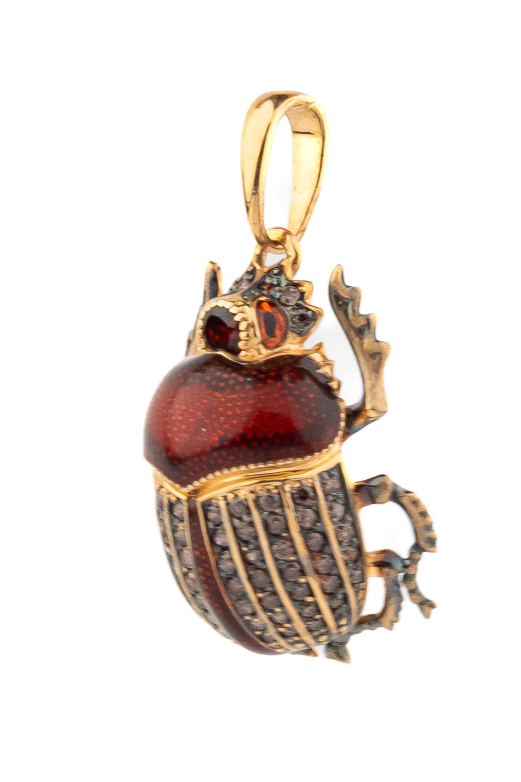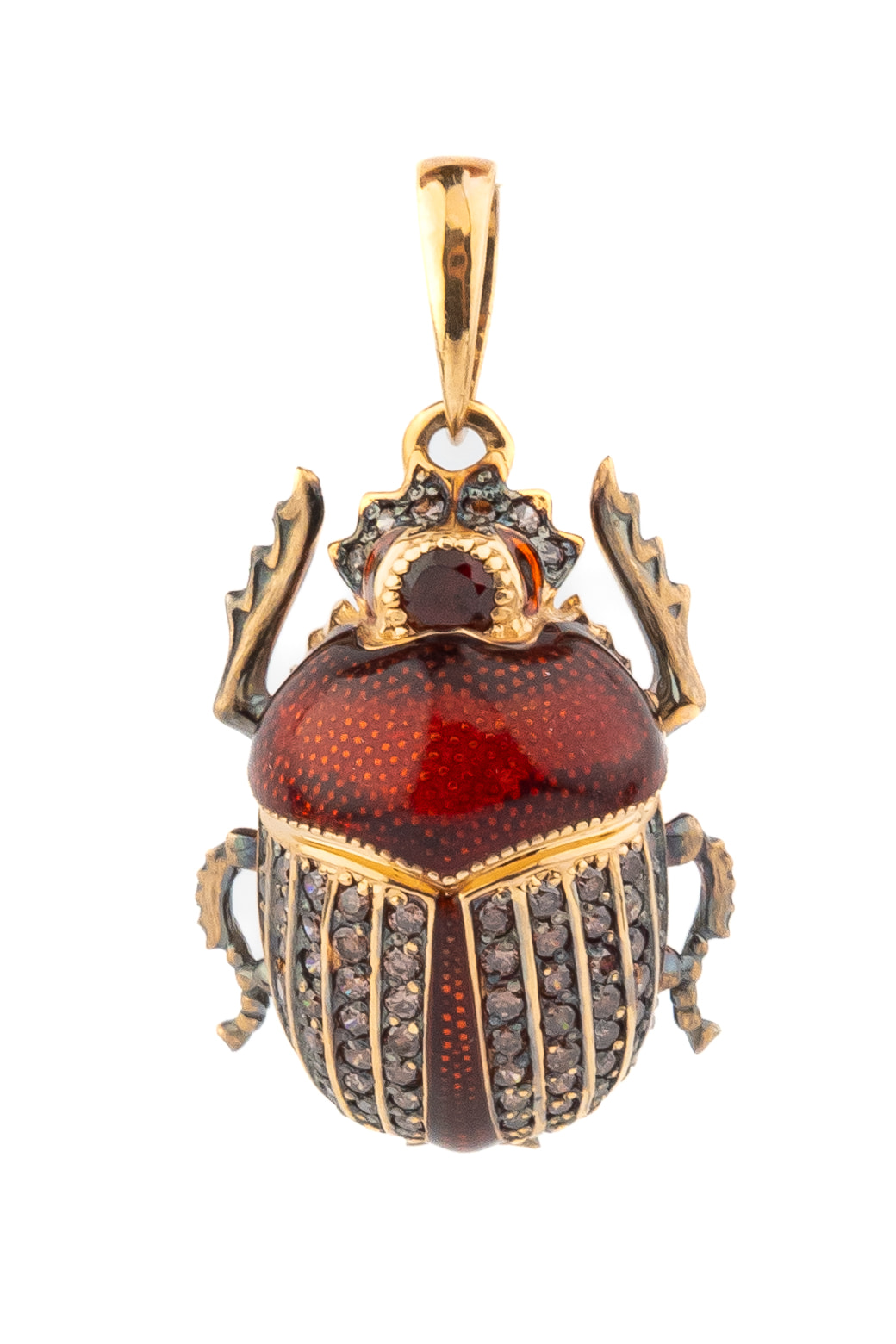 Модель выполнена из красного золота 585 пробы, чей теплый оттенок идеально подчеркивает художественный замысел. Внешний вид украшения завораживает проработкой деталей: спинка скарабея декорирована глубокой эмалью коричневого цвета, которая гармонично сочетается с насыщенным красным цветом вставок. Композицию дополняет богатая россыпь из 71 вставки — сочетание благородного граната и сияющего фианита в круглой огранке придает изделию роскошный и завершенный вид.
