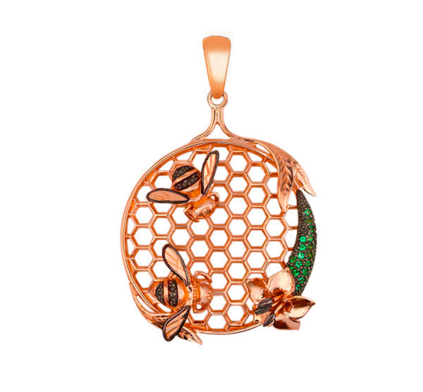 Элегантная подвеска из красного золота 585 пробы из коллекции De Luxe — Пчёлы станет изысканным акцентом вашего образа. Дизайн украшения выполнен в оригинальной тематике осы/пчелы, создающей неповторимый природный мотив. Детально проработанные соты обрамлены драгоценным металлом теплого красного оттенка, а центральным элементом композиции выступают фигурки пчел, инкрустированные черными фианитами. Всего в изделии использовано 38 вставок круглой формы, которые придают украшению глубину и выразительность.