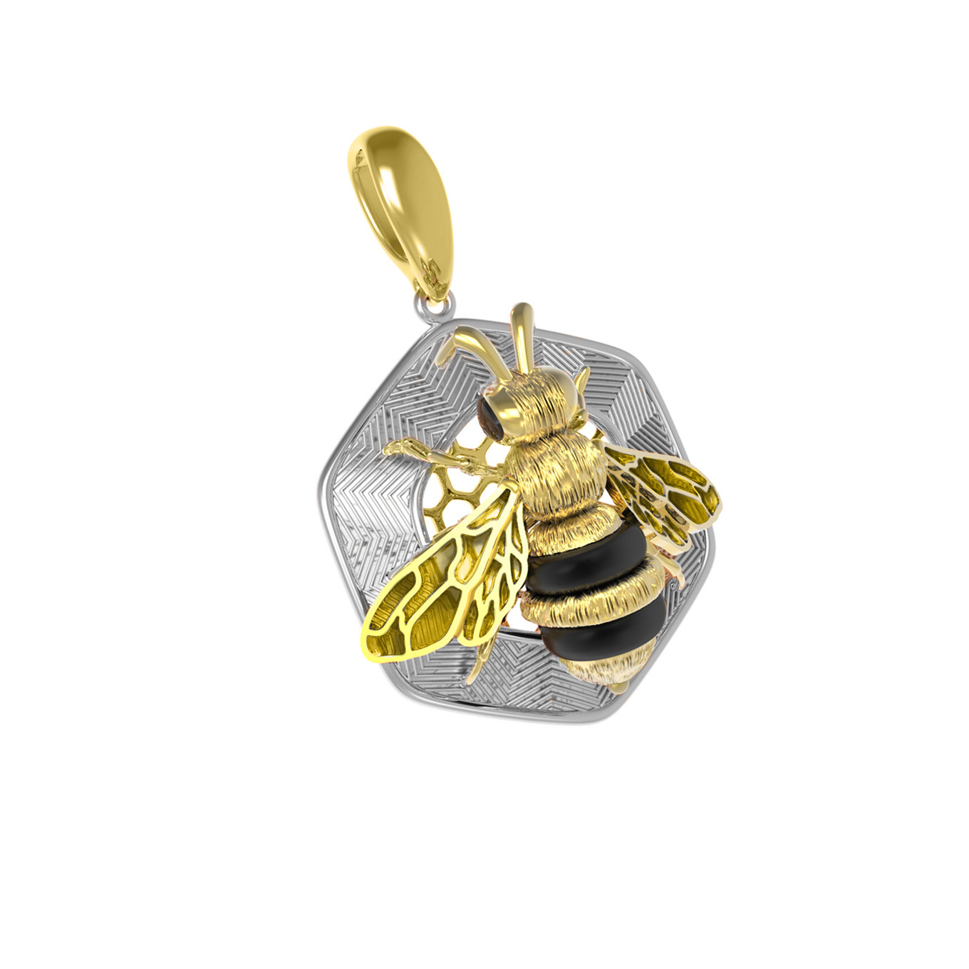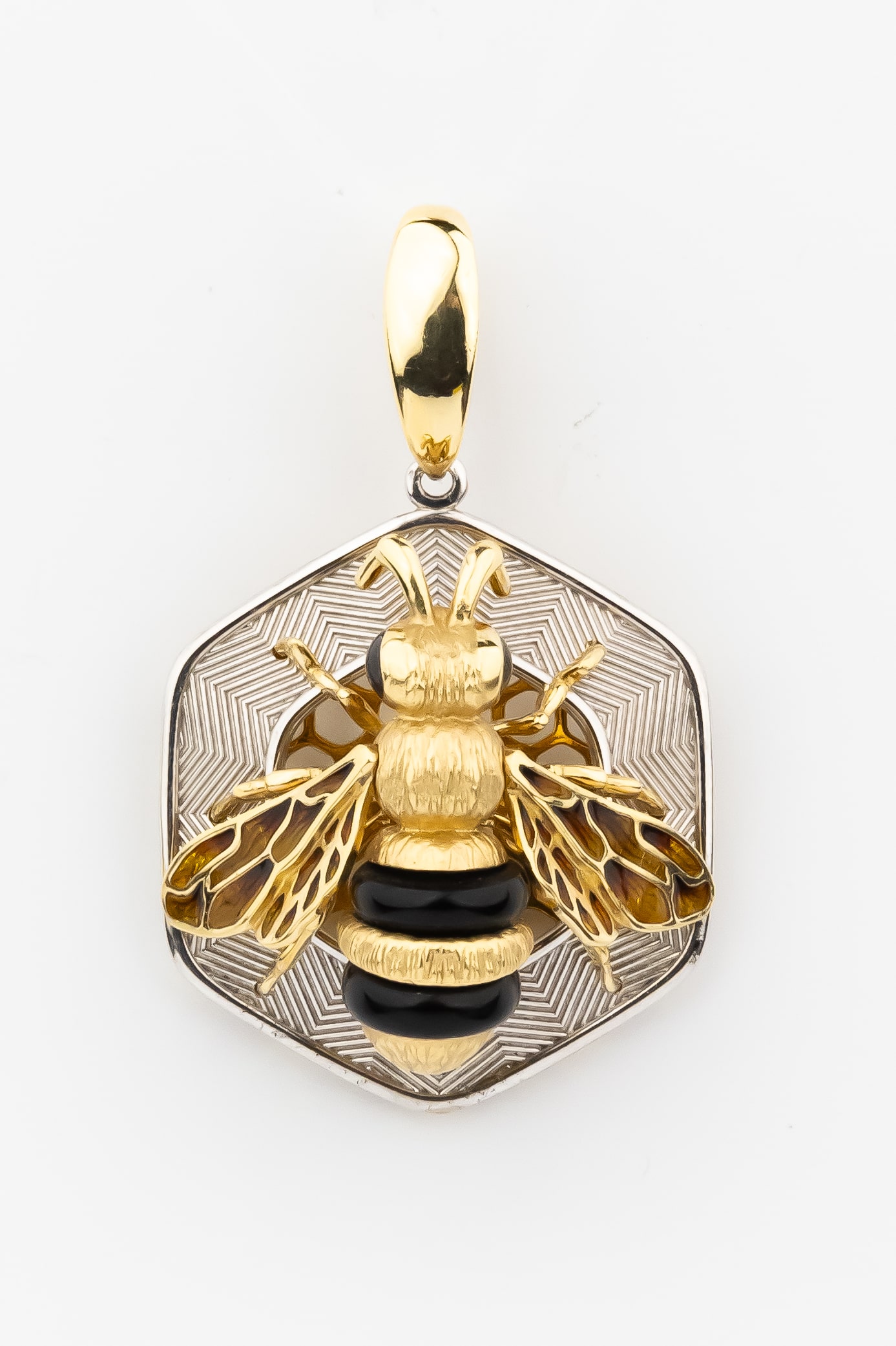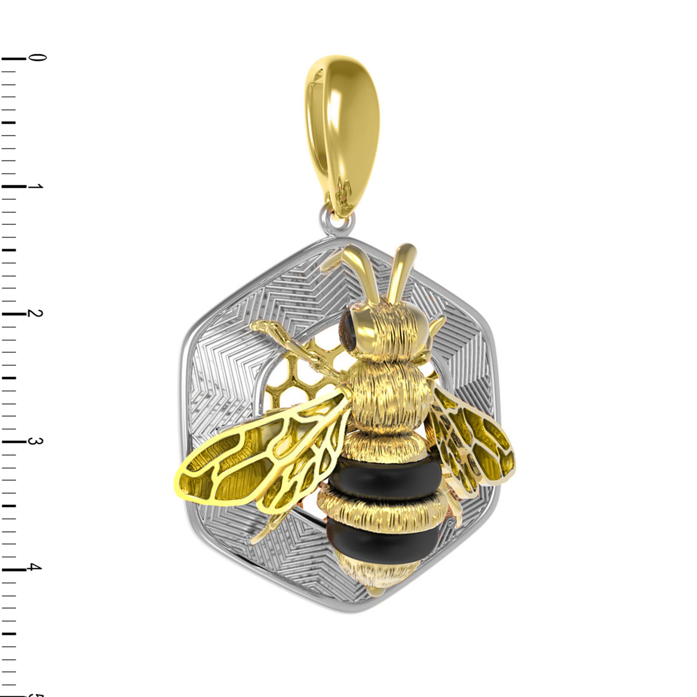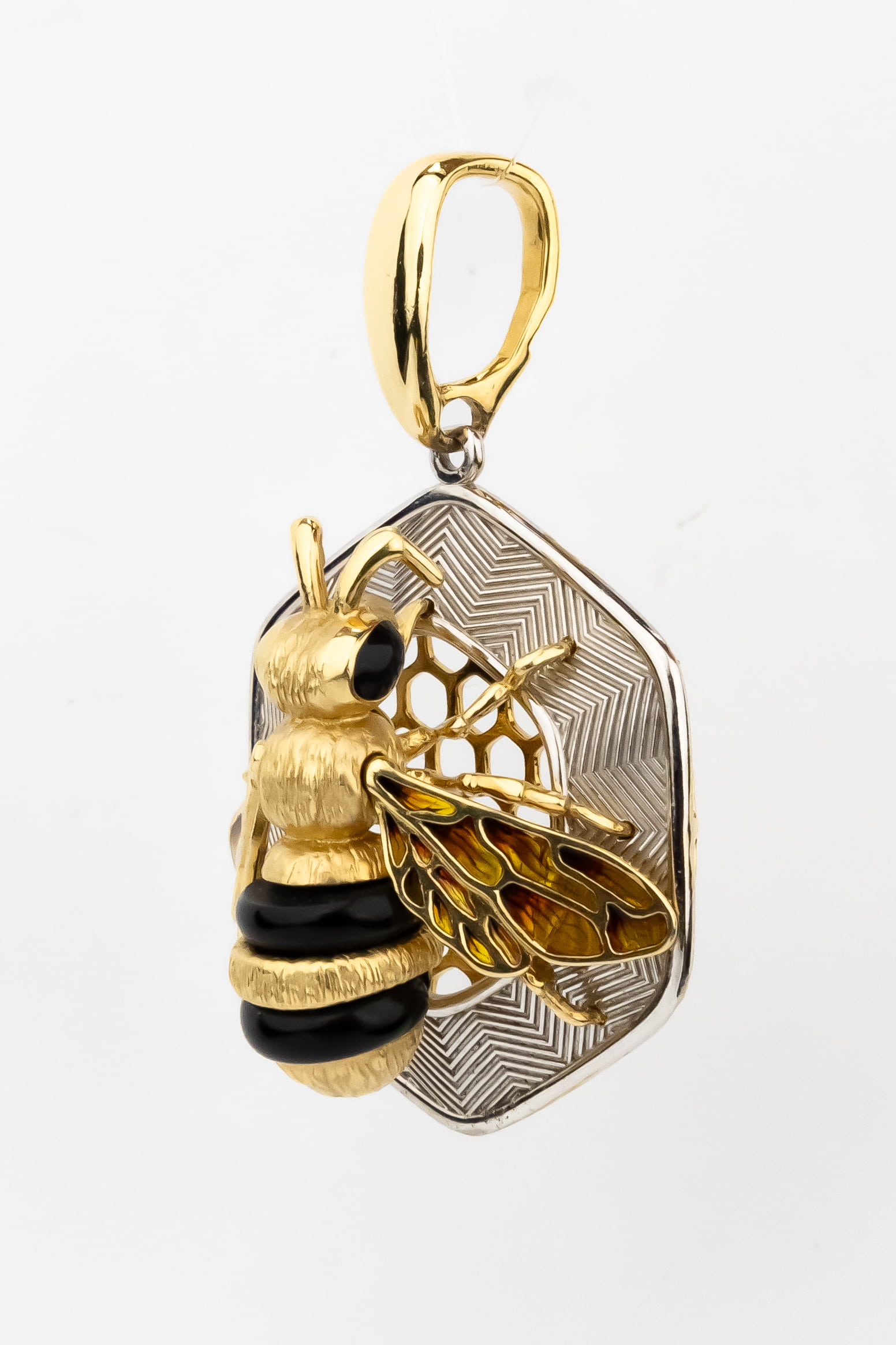Ювелиры искусно дополнили подвеску вставками из оникса и разноцветной эмали. Глубокий черный цвет оникса гармонично сочетается с лимонным золотом, подчеркивая текстуру изделия. Две вставки, выполненные в форме бусины, создают интересный визуальный контраст. Детально проработанные крылья пчелы с элементами эмали добавляют украшению выразительности и динамики.
