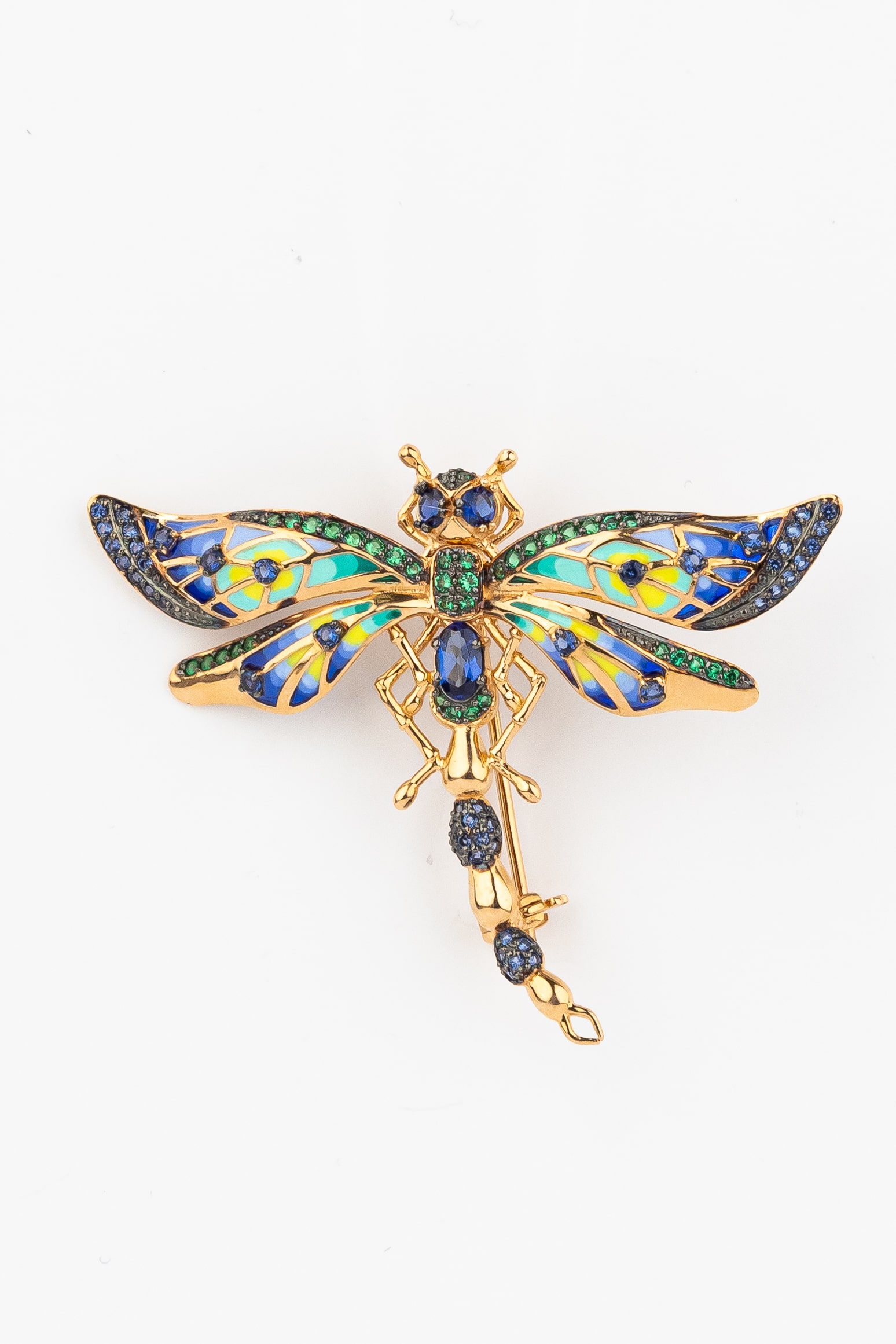 Композицию дополняют 89 вставок: благородный сапфир и сверкающие фианиты. Использование камней круглой и овальной формы разных цветов — зеленого, синего и разноцветного — делает брошь невероятно выразительной. Яркое сочетание драгоценных материалов и эмали превращает аксессуар в настоящий объект искусства.