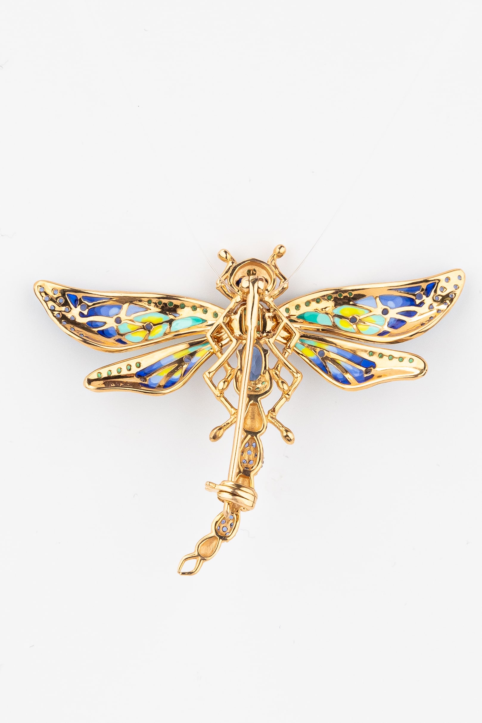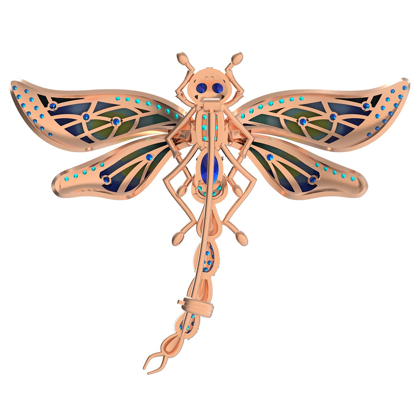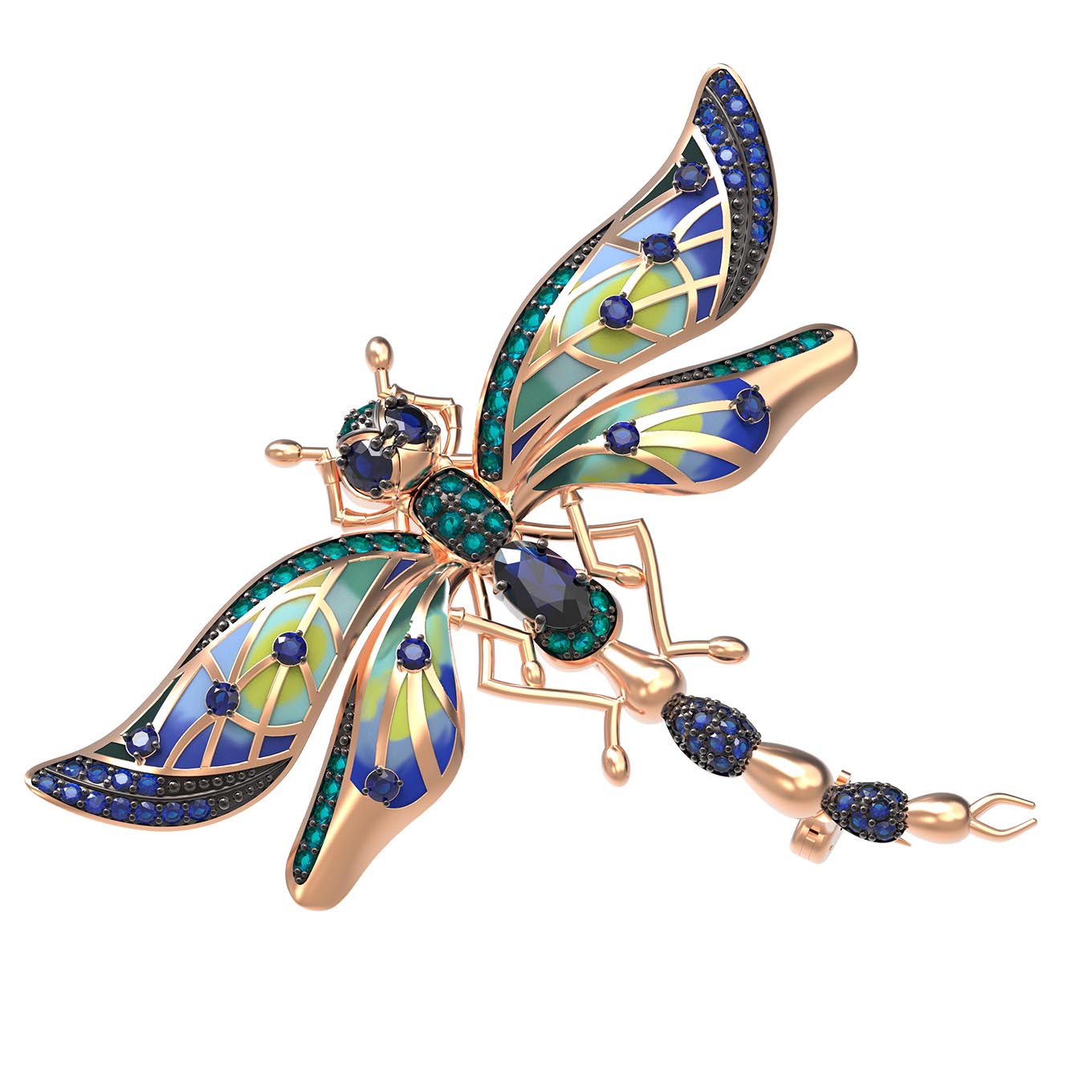 Роскошная брошь в виде стрекозы из коллекции De Luxe — Стрекозы станет акцентным украшением вашего образа. Это утонченное ювелирное изделие выполнено из красного золота 585 пробы и отличается сложным дизайном, вдохновленным красотой насекомых. Тонкая работа ювелиров подчеркивает изящные линии крыльев, которые украшены художественной эмалью зеленых и синих оттенков, создавая эффект переливающегося оперения.