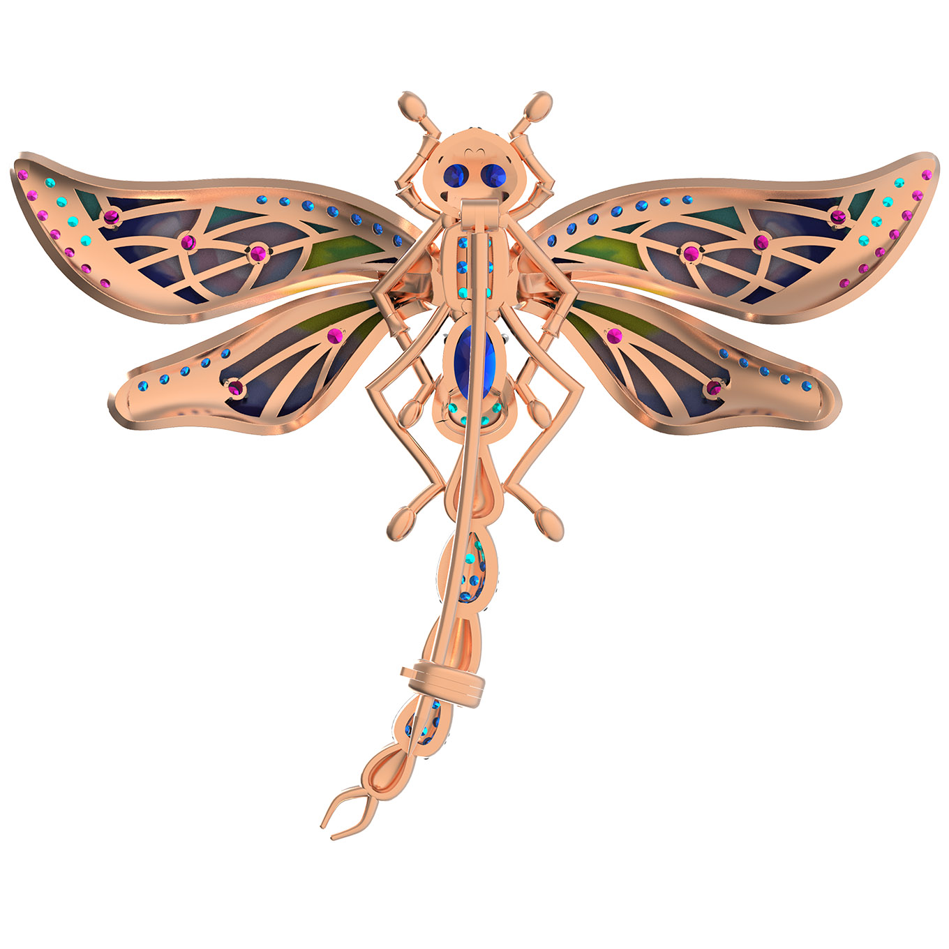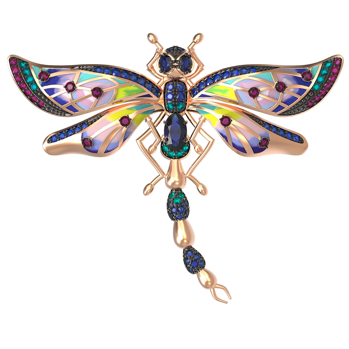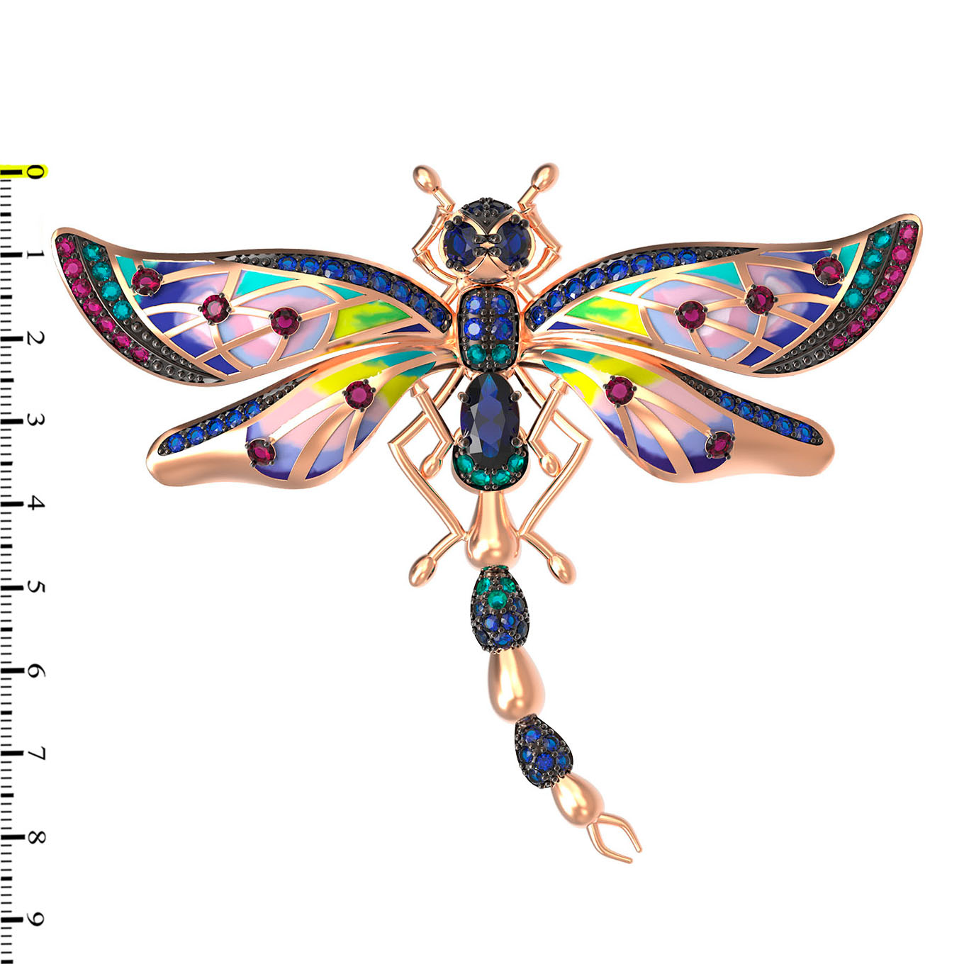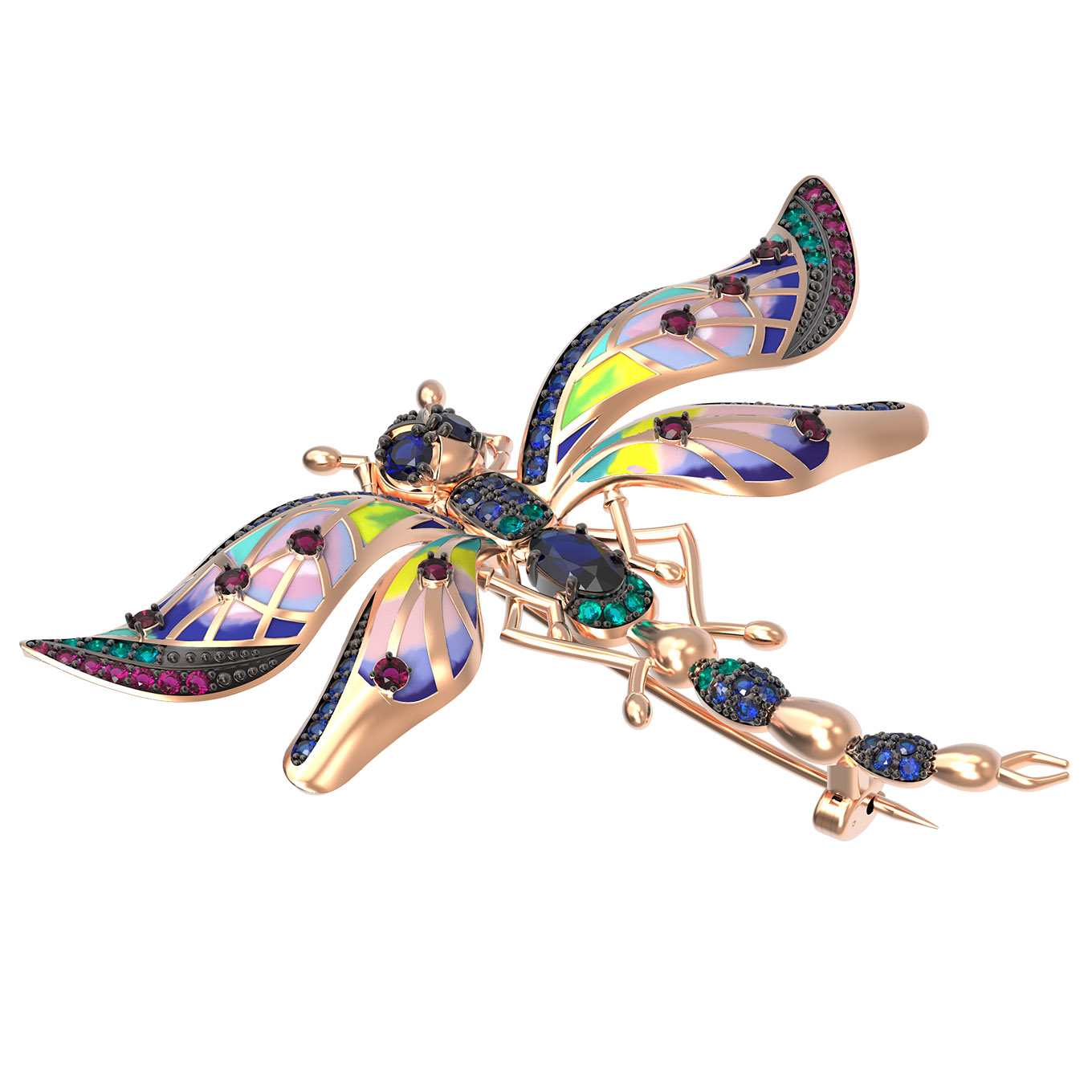 Центральным элементом композиции является искусная работа с эмалью, создающая эффект переливающихся крыльев стрекозы. Ювелиры использовали 89 вставок, среди которых роскошные рубины красного цвета, глубокие сапфиры синего оттенка и сверкающие фианиты. Разноцветная палитра камней, имеющих круглую и овальную форму, гармонично сочетается с насыщенным цветом золотой оправы. Каждая деталь броши проработана с особой тщательностью, превращая украшение в настоящий шедевр ювелирного искусства.