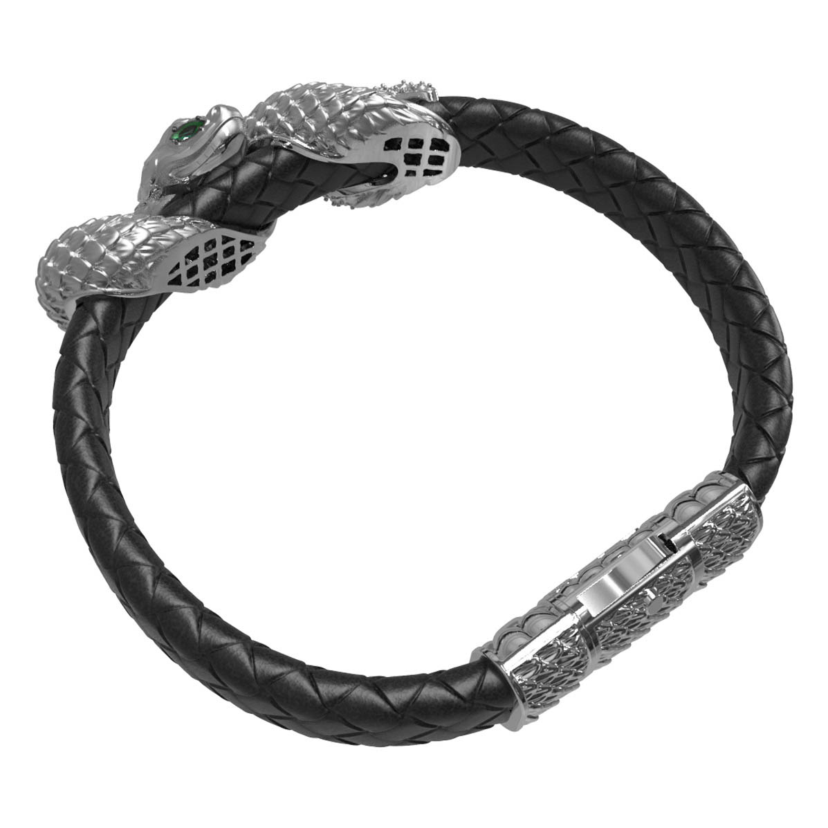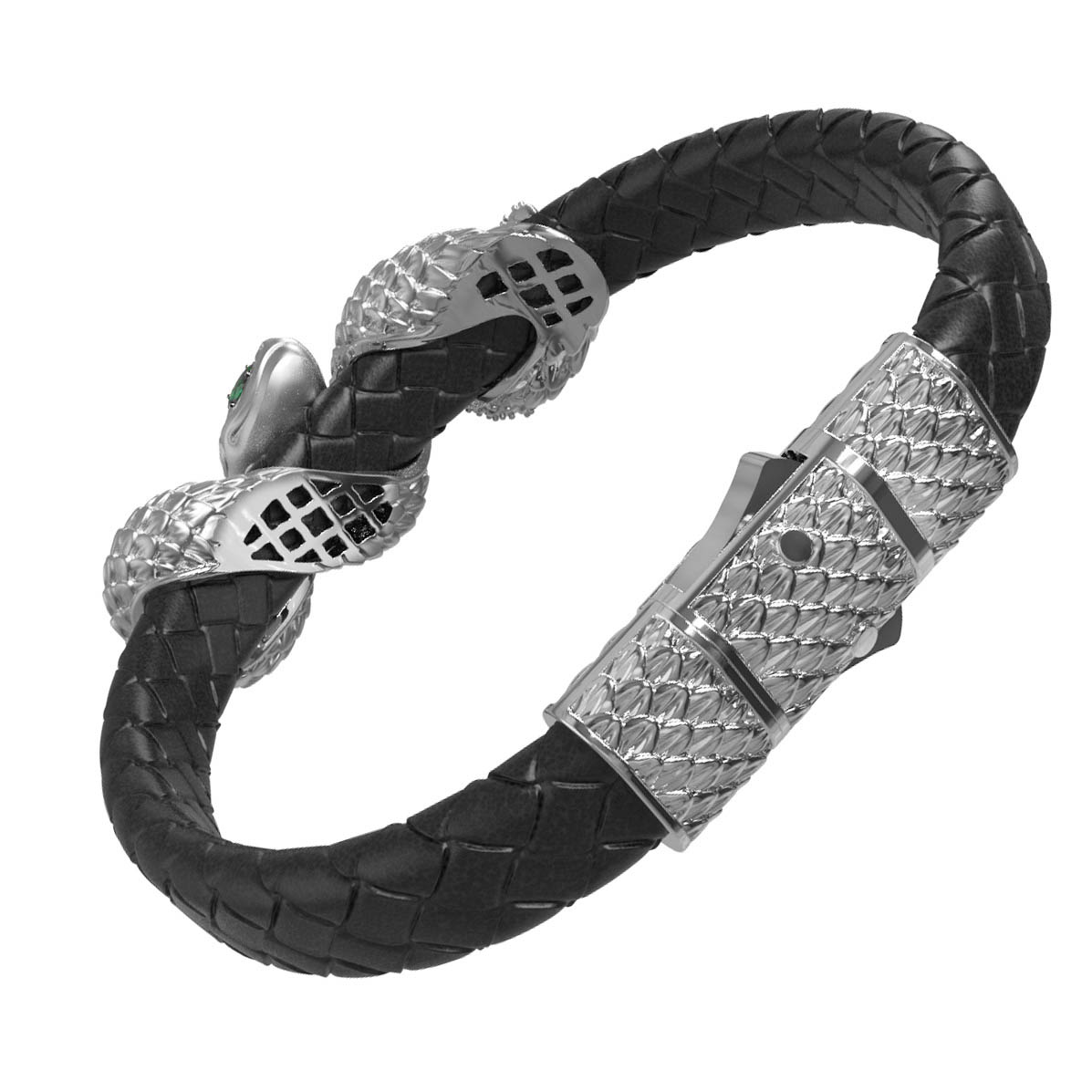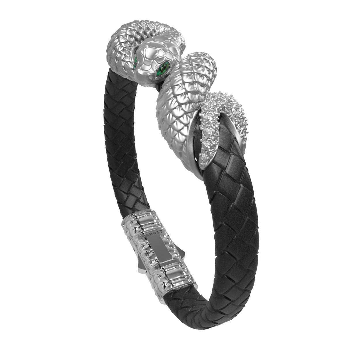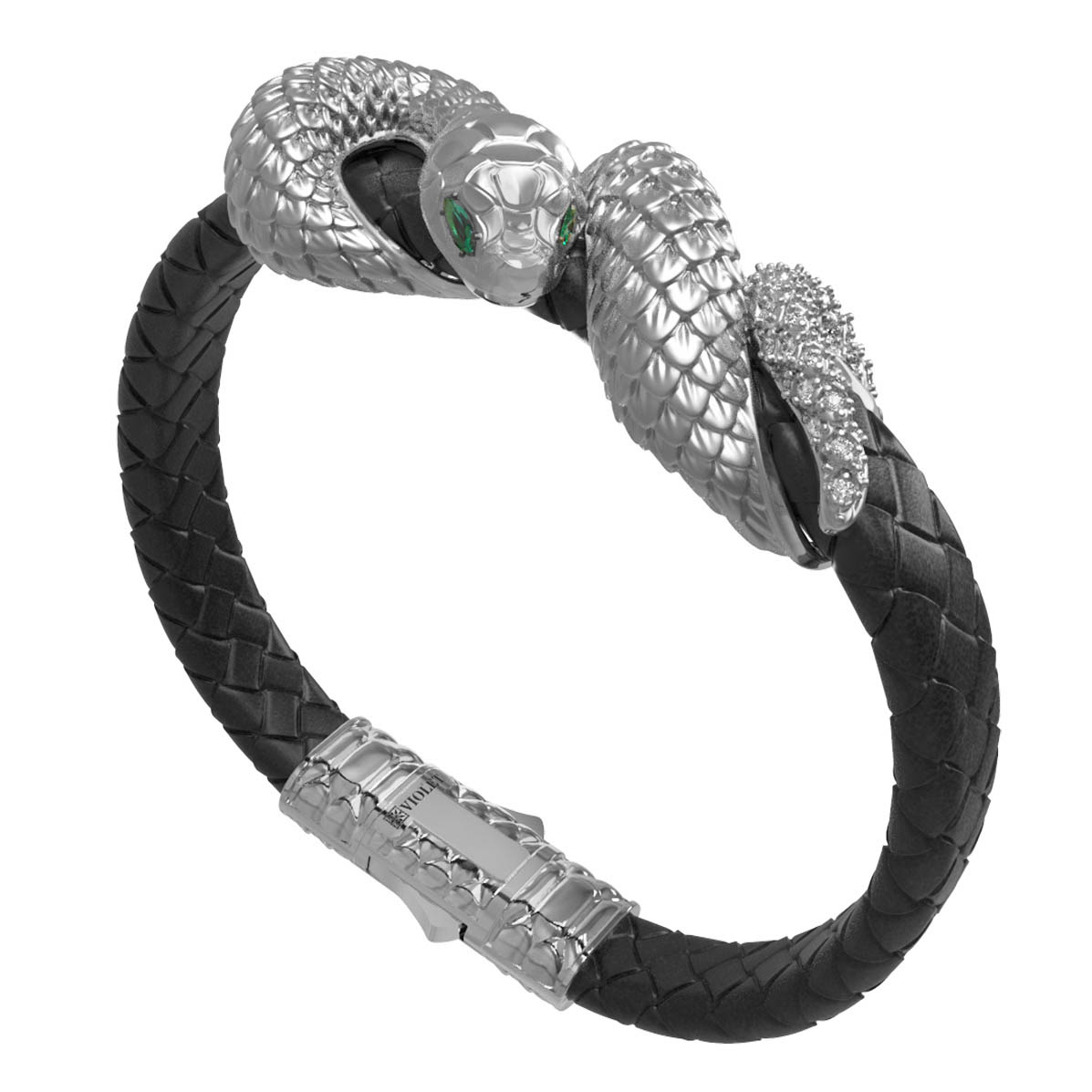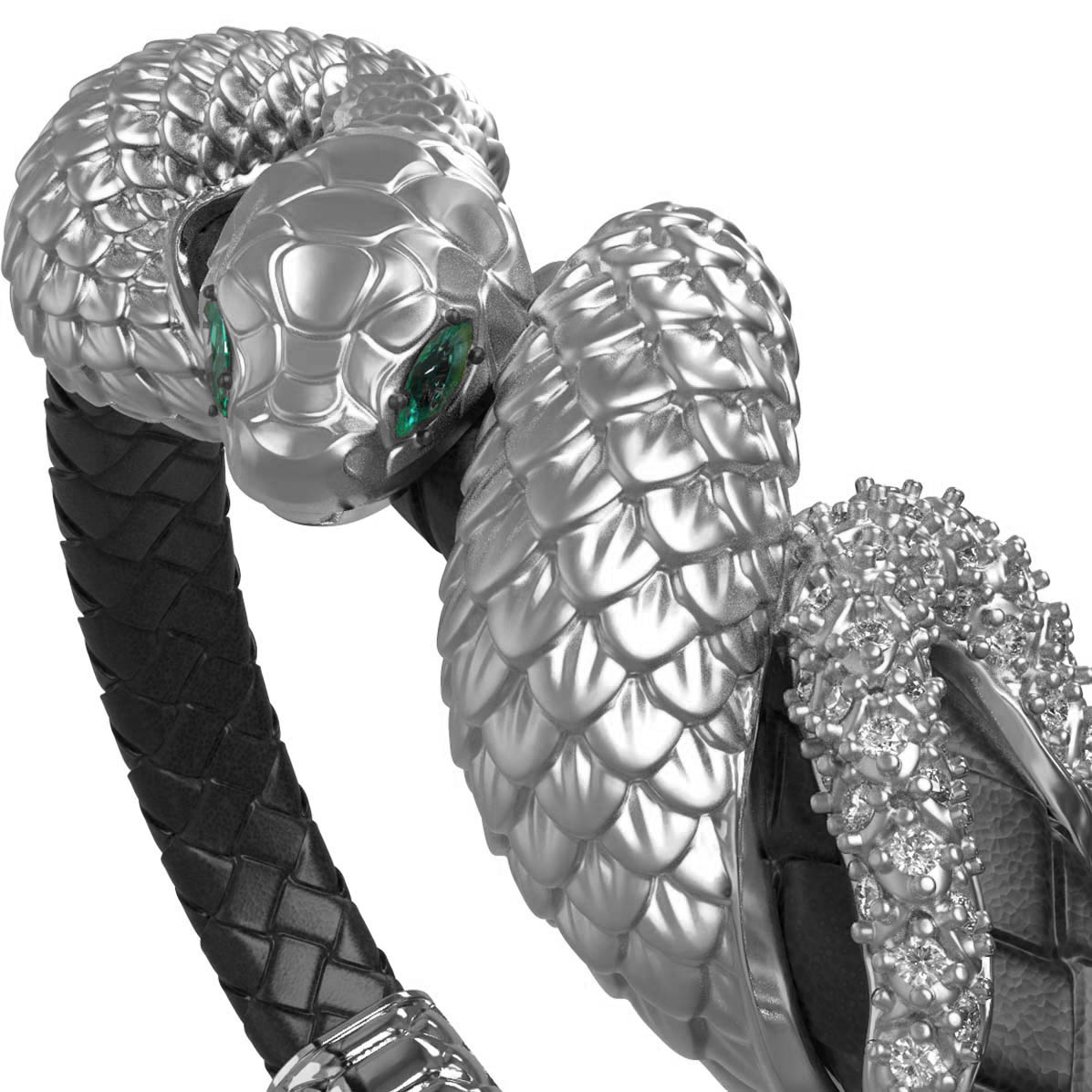Детально проработанные головы змей из белого золота инкрустированы 280 вставками, среди которых сияющие бриллианты и яркие изумруды. Сочетание огранок круглой, маркиз и овальной формы придают изделию особую динамику и блеск. Глаза змеи, выделенные насыщенным зеленым цветом вставок, придают украшению мистический шарм.