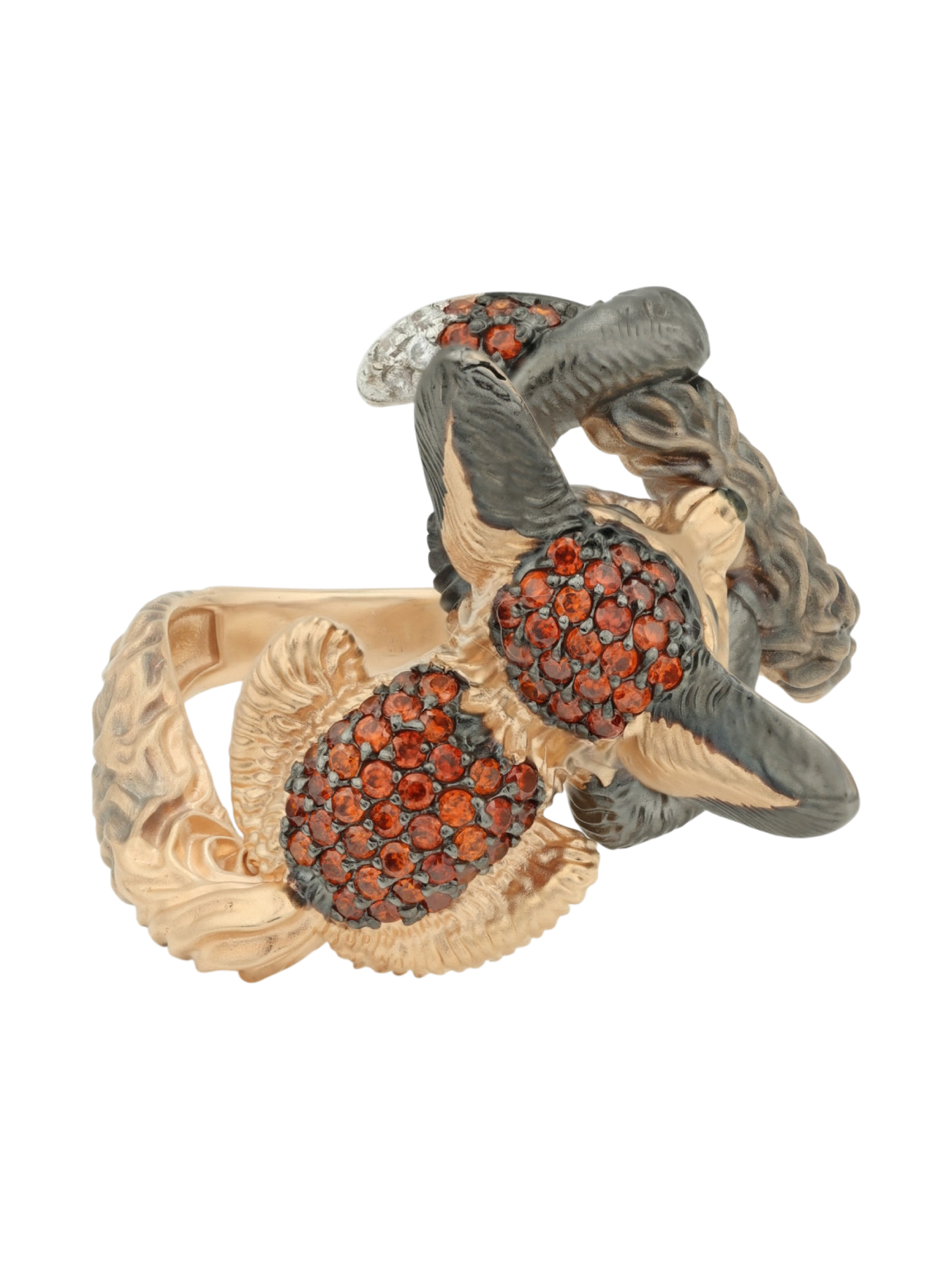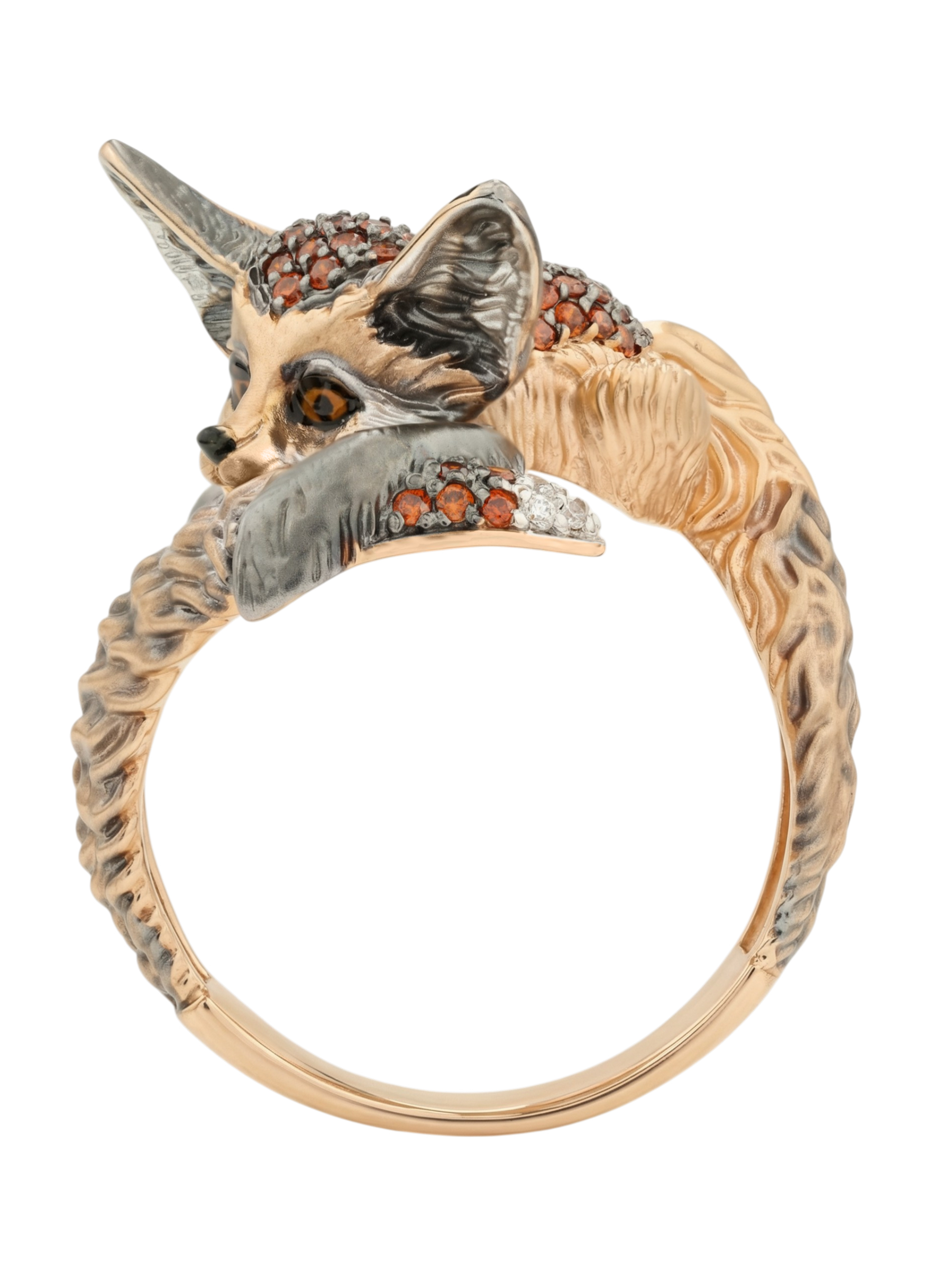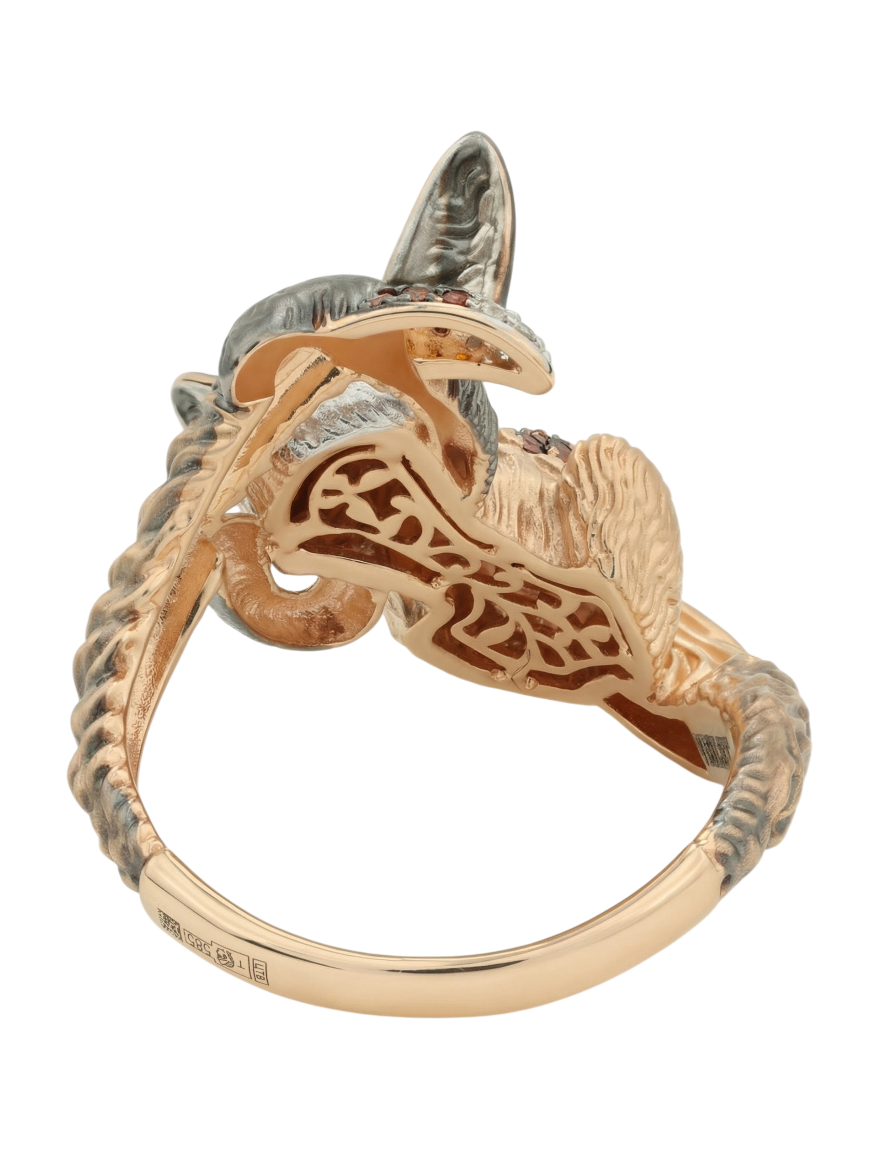 Ювелирное изделие декорировано 70 вставками фианитов круглой формы — сверкающие камни коричневого и оранжевого цвета эффектно перекликаются с глубокими тонами эмали. Сочетание классического красного золота и цветных акцентов придает украшению художественную выразительность и глубину. Это кольцо подходит как для женщин, так и для мужчин, предпочитающих необычные и запоминающиеся аксессуары.