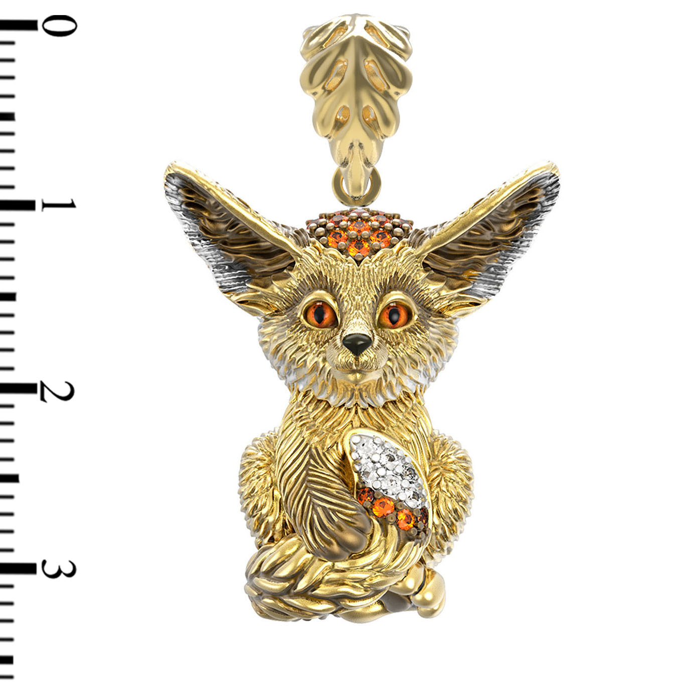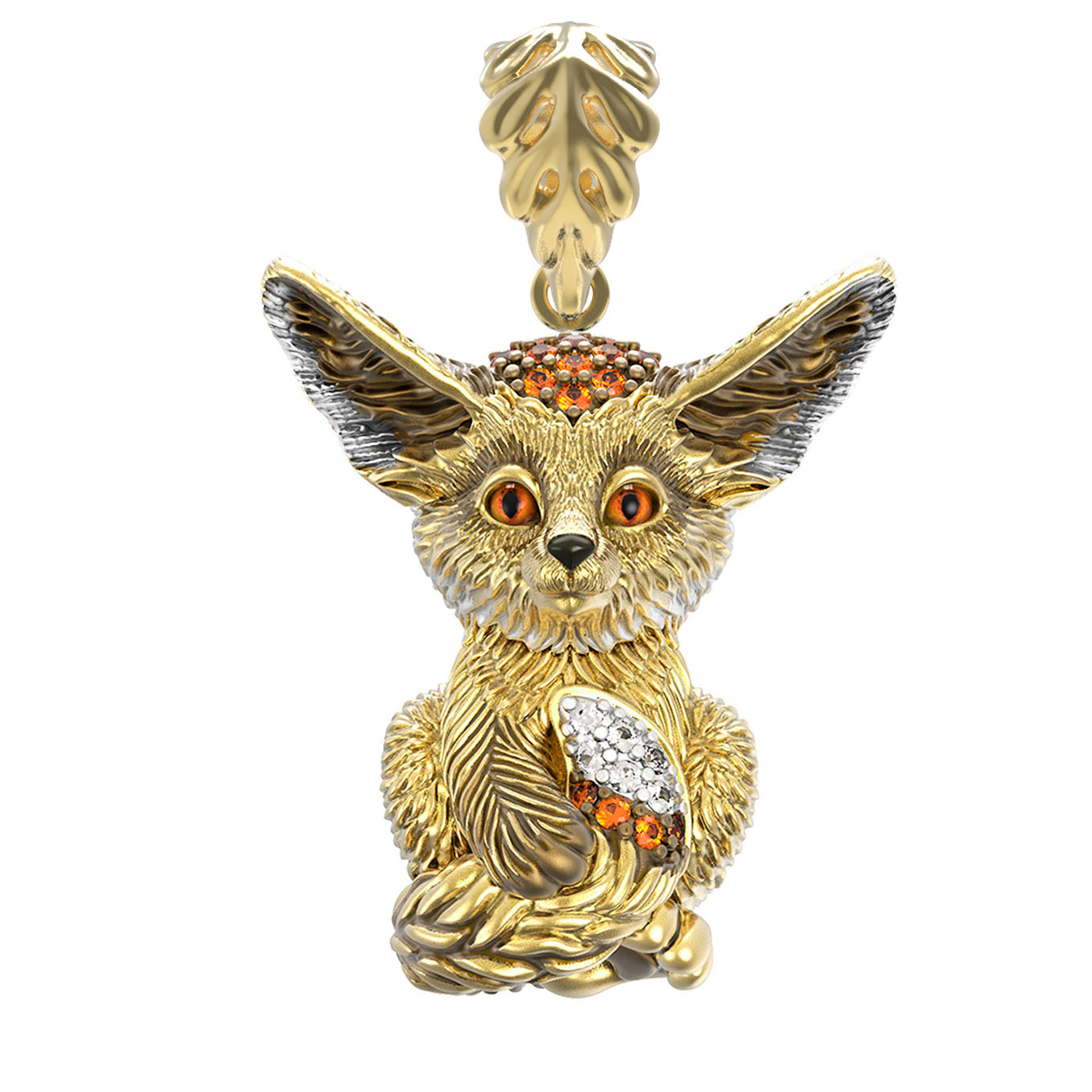 Особую художественную ценность украшению придает инкрустация 32 вставками. Камни круглой формы — фианиты коричневого и оранжевого цветов — создают игру света, имитирующую естественный окрас зверька. Теплый оттенок лимонного золота гармонично дополняет выбранную палитру, придавая подвеске благородное сияние. Благодаря детальной проработке, изделие выглядит живым и притягательным.
