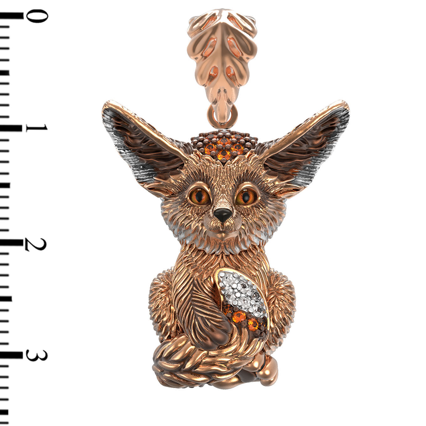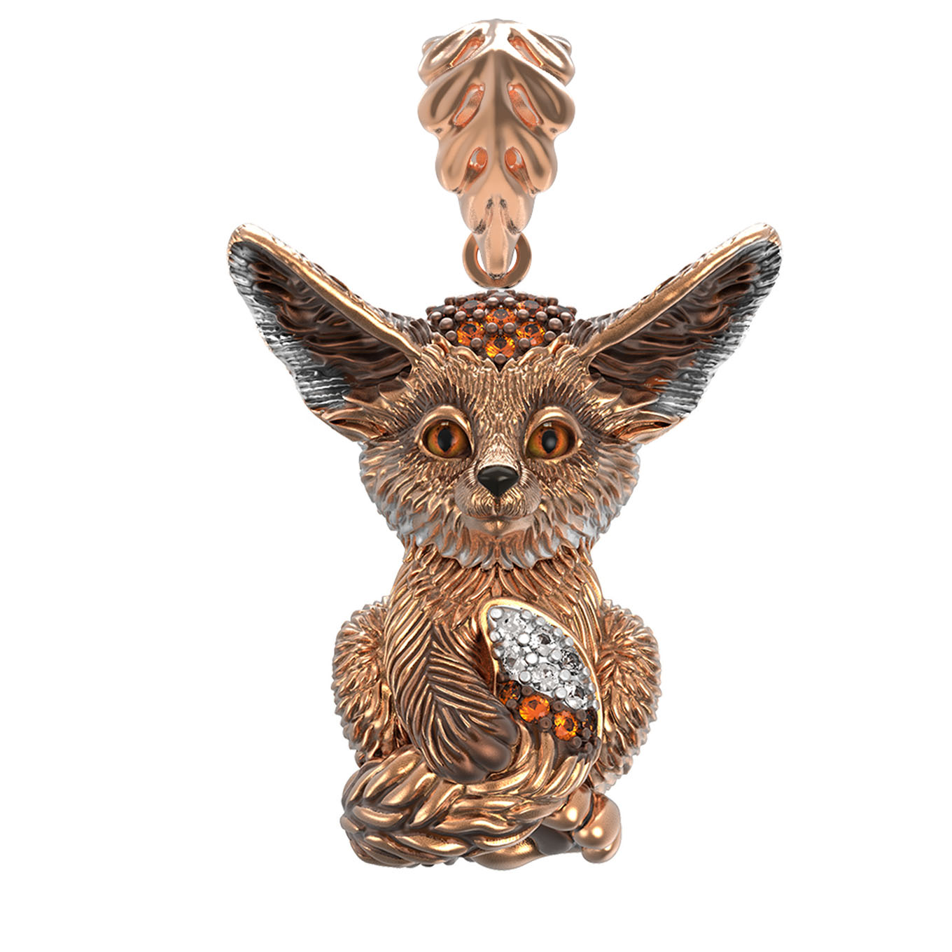 Изделие инкрустировано 32 вставками, среди которых эффектно сочетаются фианит и ювелирная эмаль. Камни круглой формы в коричневых и оранжевых тонах придают украшению глубину и теплое сияние, создавая интересный контраст с красным золотом. Дизайн в виде лисы выглядит стильно и самобытно, привлекая восхищенные взгляды.