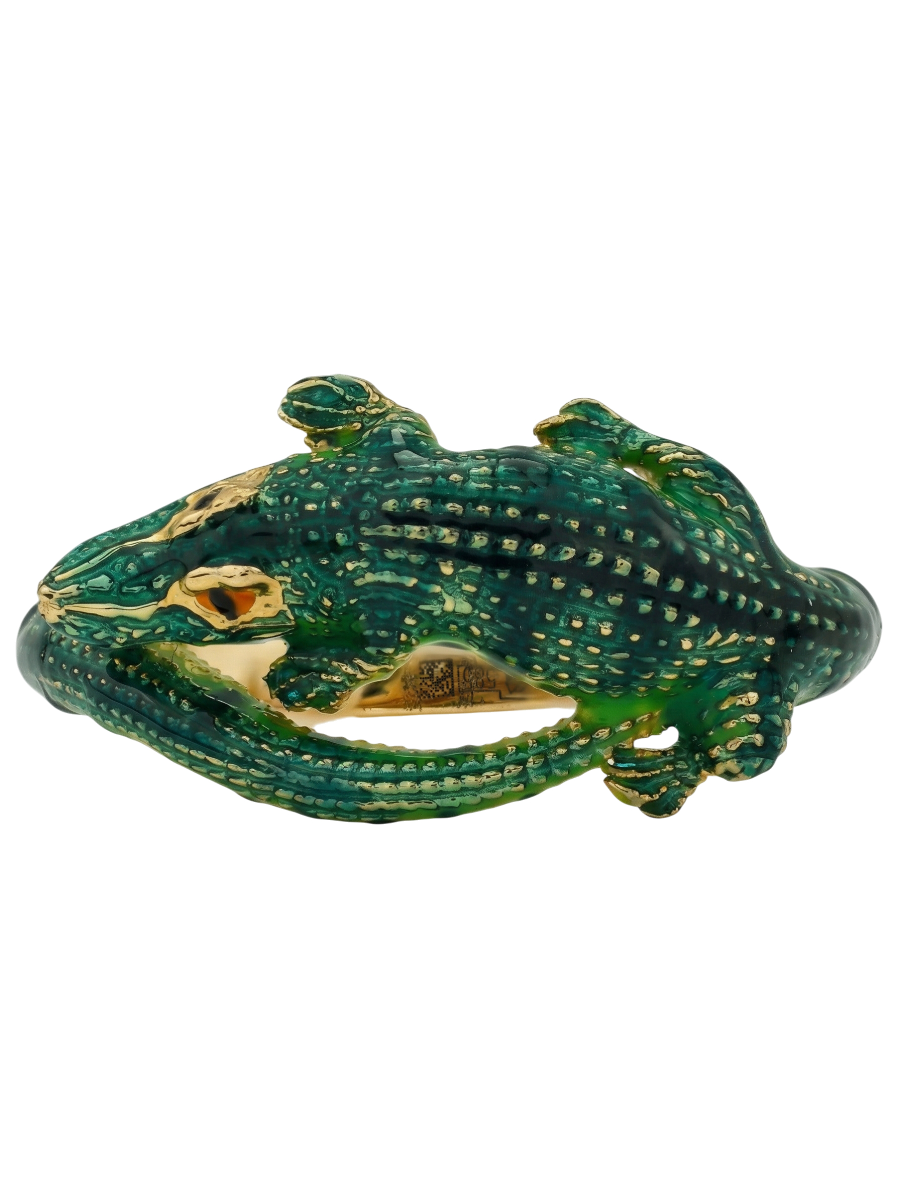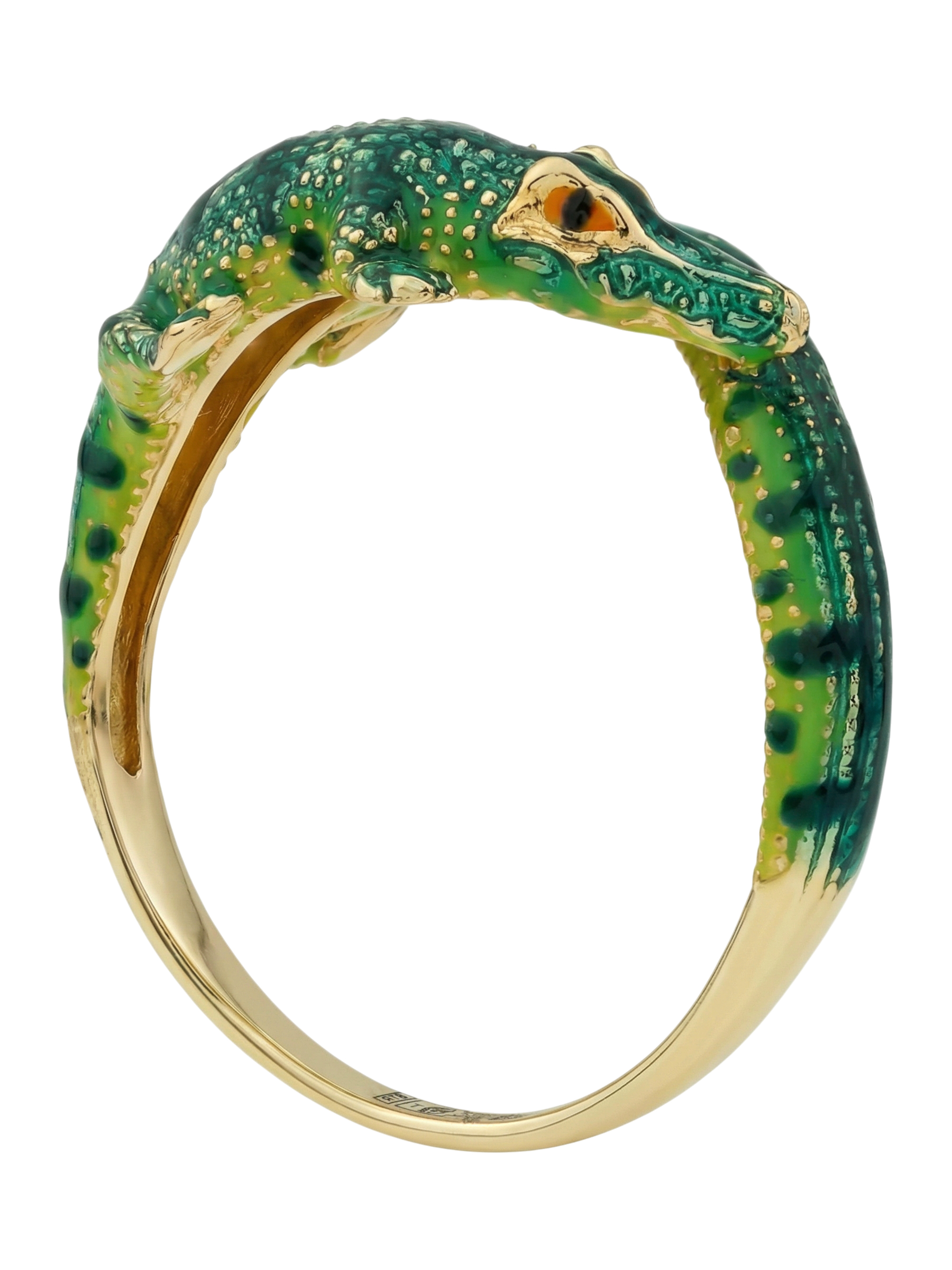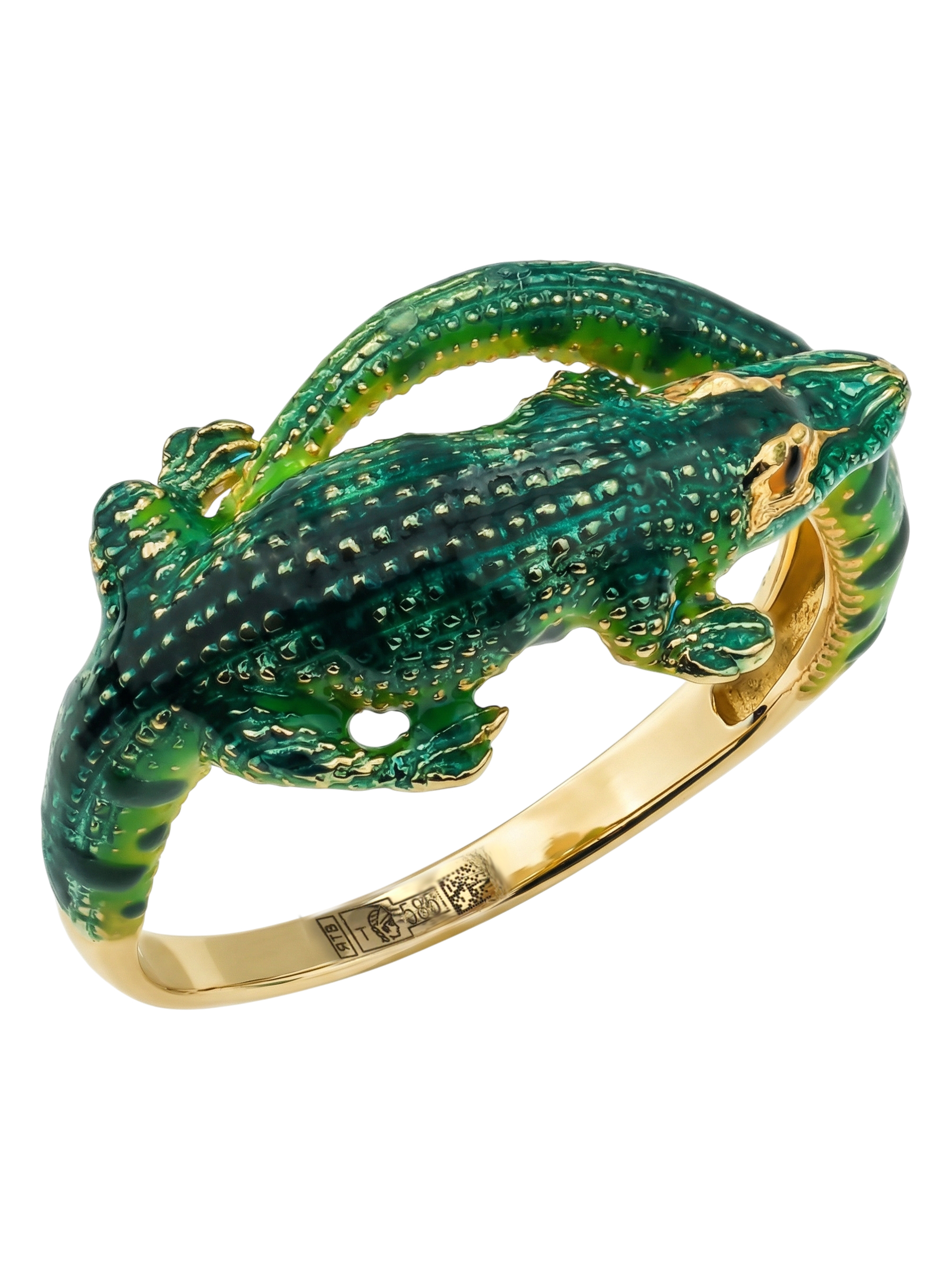 Мастерство ювелиров позволило оживить образ с помощью сложной работы с разноцветной эмалью. Насыщенный зеленый цвет, которым покрыто тело хищника, контрастирует с драгоценным металлом, делая аксессуар по-настоящему заметным. Это кольцо станет идеальным выбором как для женщин, так и для мужчин, которые предпочитают оригинальные и запоминающиеся украшения в своем гардеробе.