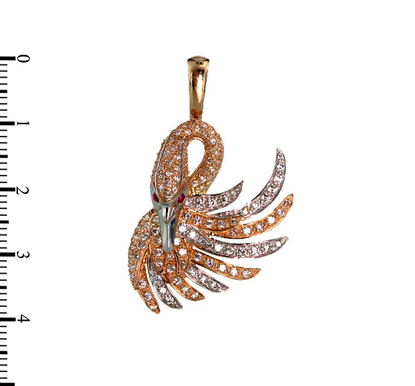 Роскошное ювелирное изделие инкрустировано 130 фианитами круглой формы, которые создают завораживающее сияние при каждом вашем движении. Особое внимание привлекают вставки красного цвета, которые служат эффектным акцентом в оформлении образа птицы, придавая подвеске глубину и выразительность. Сочетание красного золота и мерцающих камней подчеркивает высокий статус владельца.
