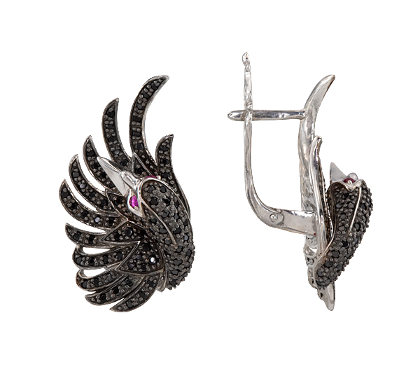 Главным акцентом украшения служит россыпь из 196 фианитов, создающих неповторимую игру света на поверхности благородного металла. Особую глубину композиции придают вставки красного цвета круглой формы, эффектно контрастирующие с холодным блеском белого золота. Данные серьги отличаются сложной, детальной проработкой оперения, что делает их настоящим произведением ювелирного искусства.