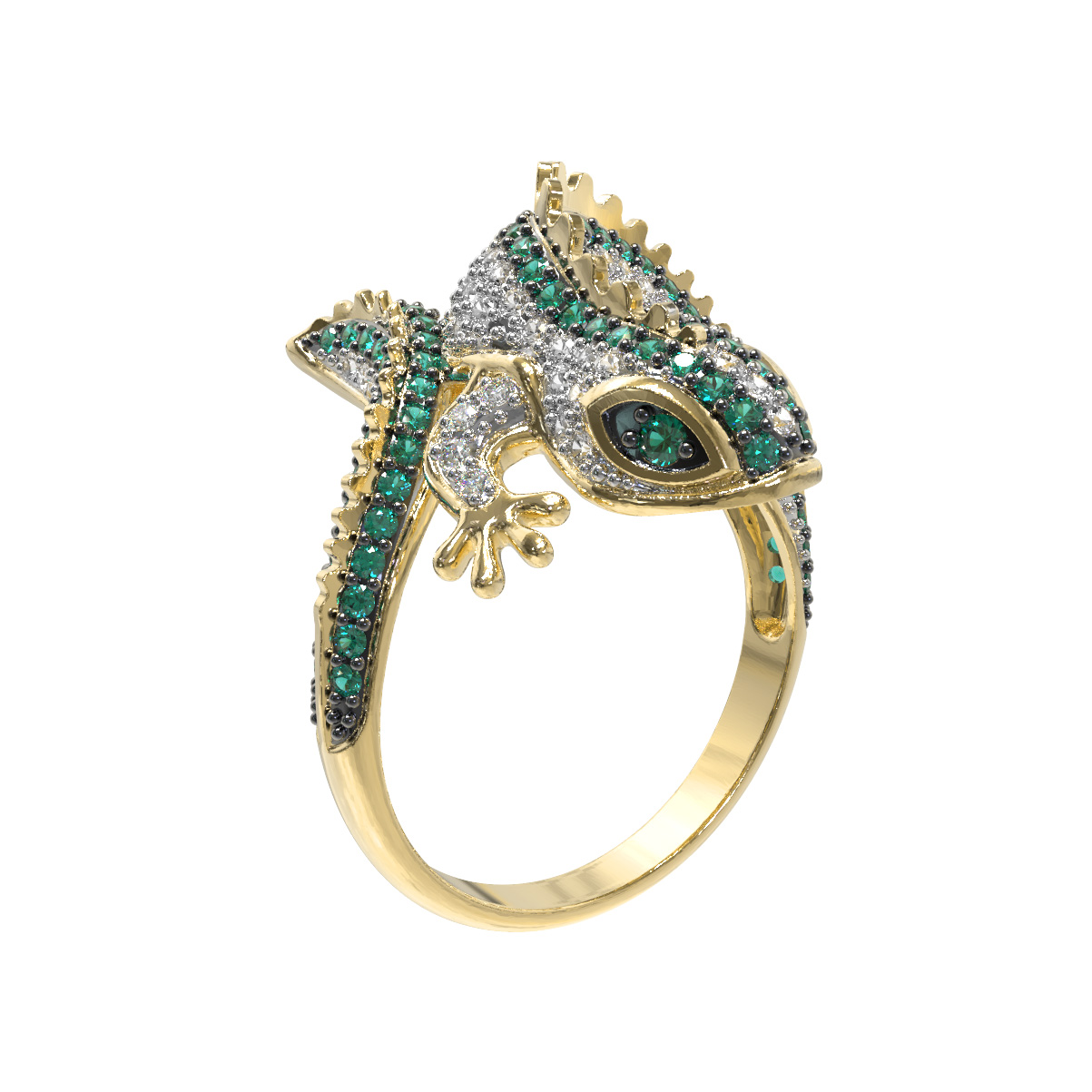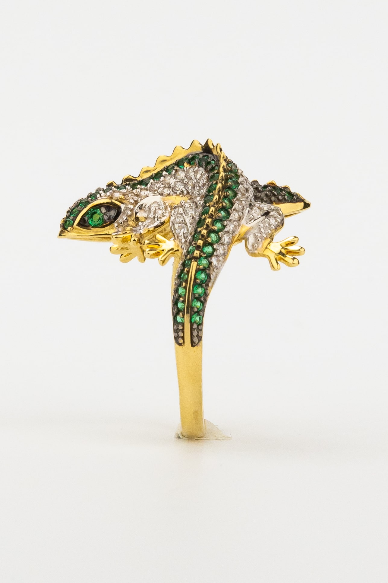 Роскошь изделия подчеркивается богатой инкрустацией: кольцо украшают 174 фианита круглой формы. Контрастное сочетание сияющих камней и благородного оттенка лимонного золота дополняется вставками насыщенного зелёного цвета, которые придают украшению особый шарм и выразительность. Тщательная проработка деталей делает это кольцо настоящим произведением ювелирного искусства.