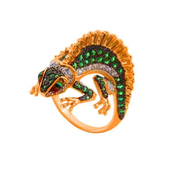Кольцо из красного золота 585 пробы из коллекции De Luxe — Саламандры — это ювелирный шедевр, воплощающий смелый дизайн в виде саламандры. Аксессуар привлекает внимание своей детализацией и ярким исполнением, становясь центральным элементом любого образа. В качестве декоративного покрытия использована художественная эмаль, придающая изделию особую глубину цвета.