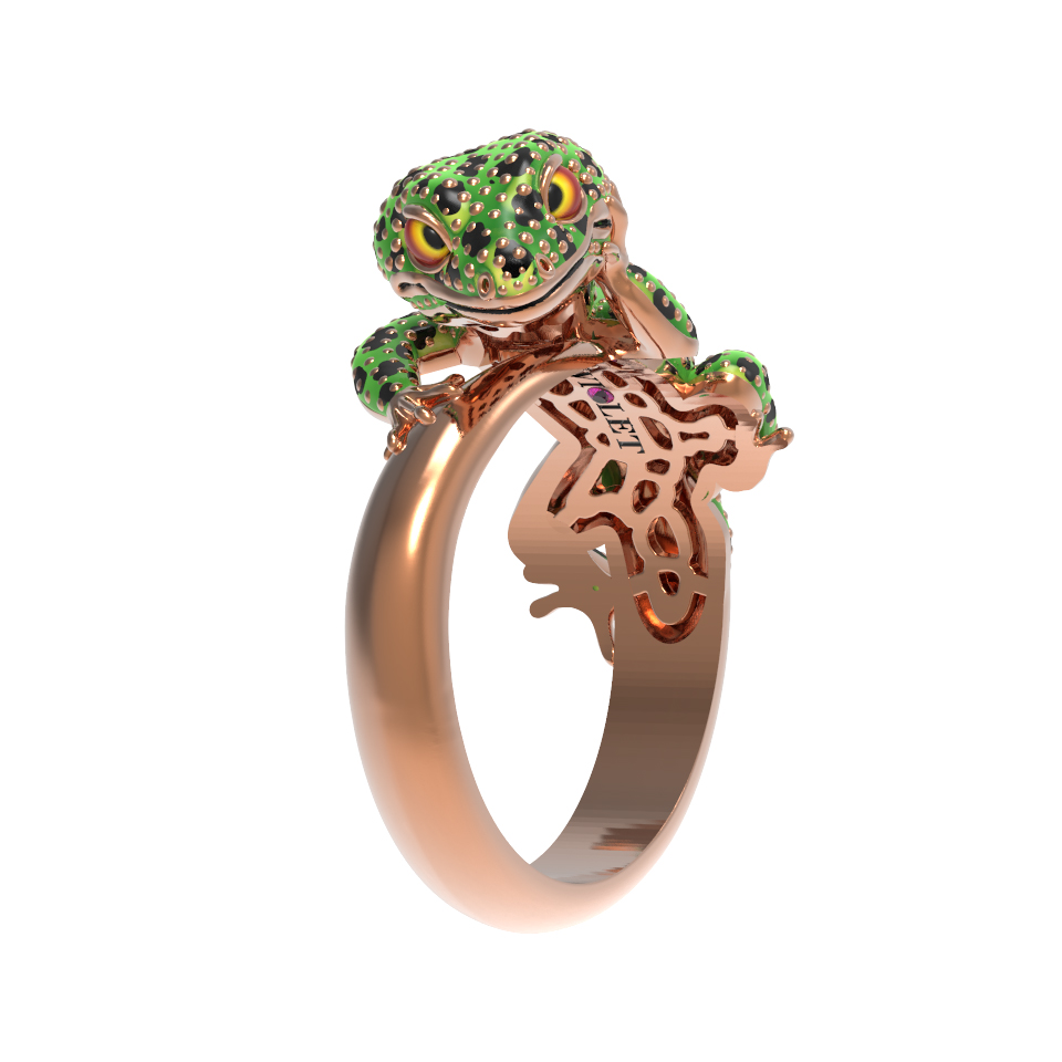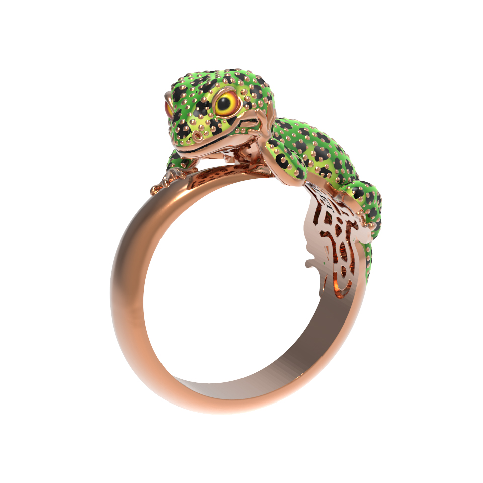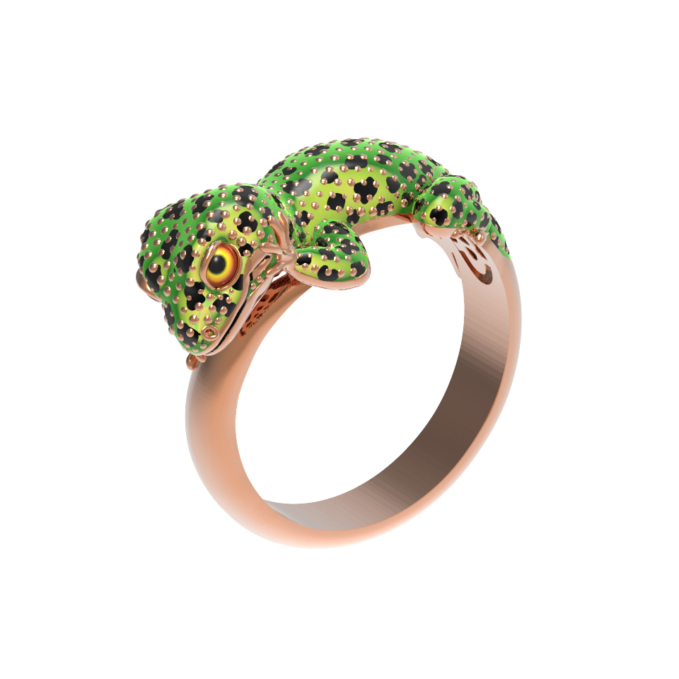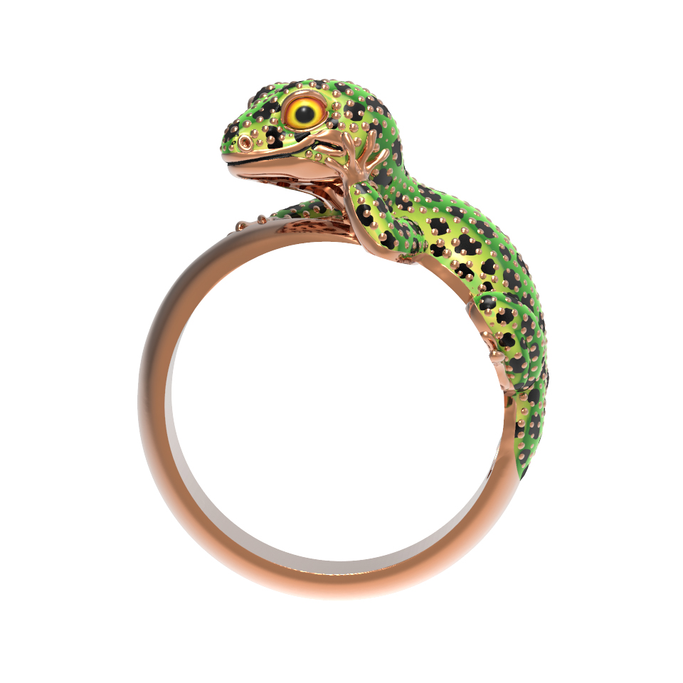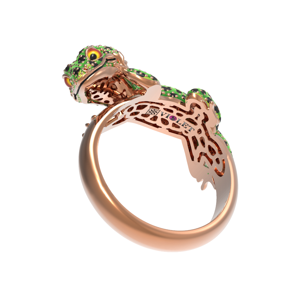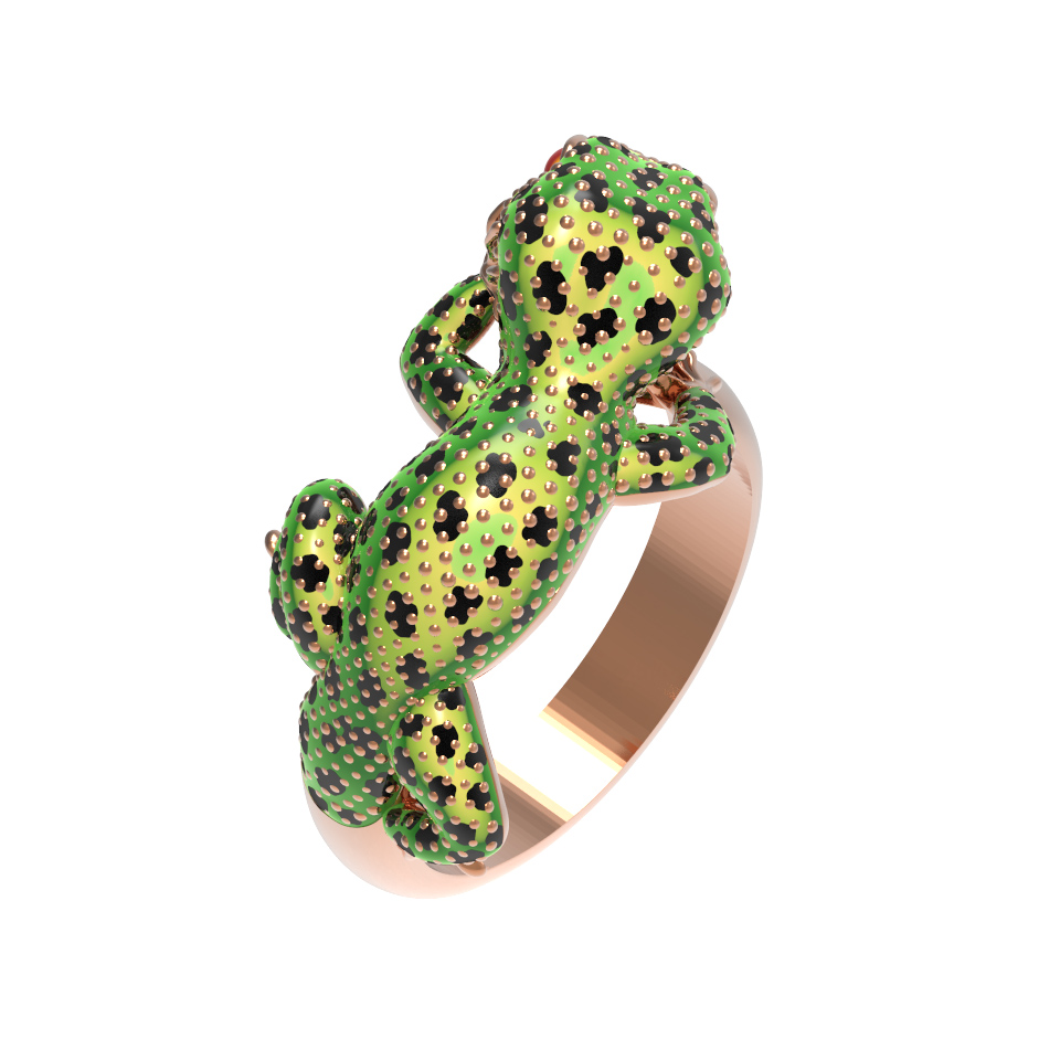 Центральным элементом дизайна является искусная эмаль разноцветного окраса, создающая детальный и реалистичный узор на спинке ящерицы. Особый акцент украшению придает круглая вставка из натурального рубина красного цвета, который служит ярким глазом саламандры. Высокая детализация делает это кольцо не просто аксессуаром, а полноценным арт-объектом.
