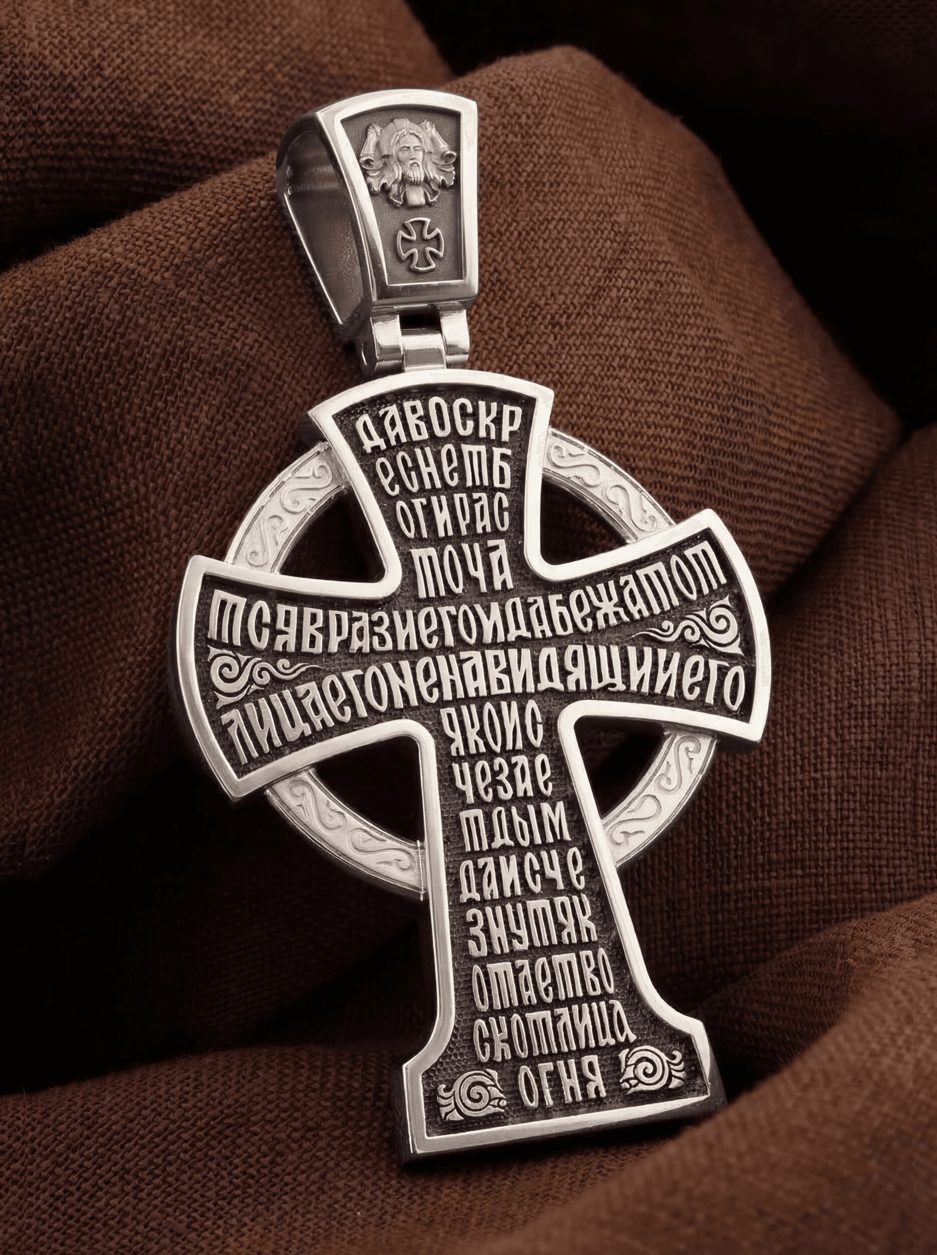 На обороте написан начальный стих оградительной молитвы Честному Кресту Господню: «Да воскреснет Бог, и расточатся врази Его, и да бежат от лица Его ненавидящии Его. Яко исчезает дым, да исчезнут; яко тает воск от лица огня, тако да погибнут беси от лица любящих Бога и знаменующихся крестным знамением, и в веселии глаголющих: радуйся, Пречестный и Животворящий Кресте Господень, прогоняй бесы силою на тебе пропятаго Господа нашего Иисуса Христа, во ад сшедшаго и поправшаго силу диаволю, и даровавшаго нам тебе Крест Свой Честный на прогнание всякаго супостата. О, Пречестный и Животворящий Кресте Господень! Помогай ми со Святою Госпожею Девою Богородицею и со всеми святыми во веки. Аминь».