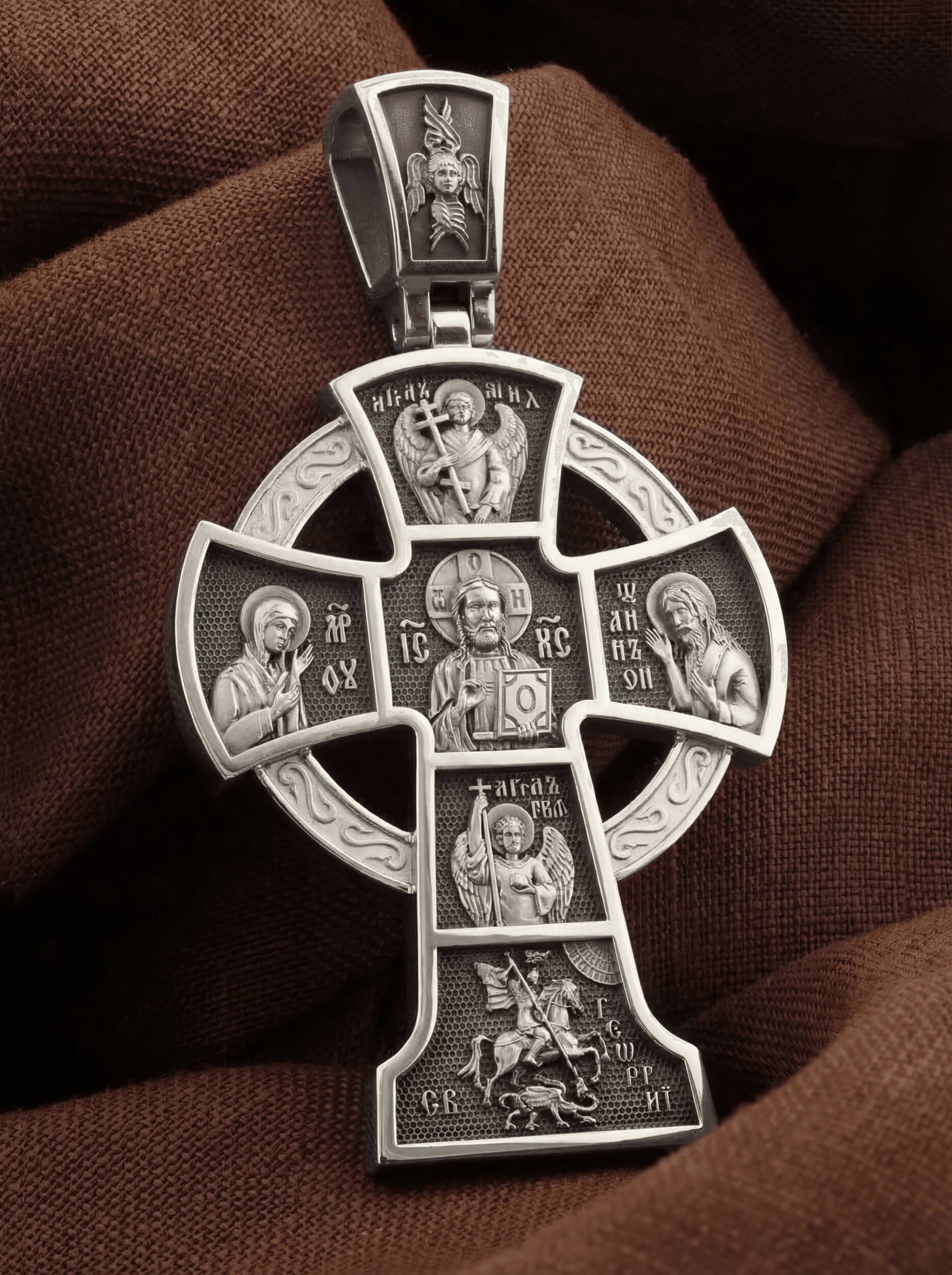 Вверху и внизу от спасителя предстоят два архангела, Михаил (Первый служитель Божественной славы, страж и защитник) и Гавриил (служитель Божественной крепости и изъявитель сокровенных Божьих тайн). Внизу помещен образ свт. Георгия Победоносца. Святой при жизни прославился не только как храбрый воин и твердый исповедник веры, но и как сострадательный, милосердный целитель и чудотворец. Святому молятся о покровительстве воинам и армии, о защите государства, сохранении и спасения России.