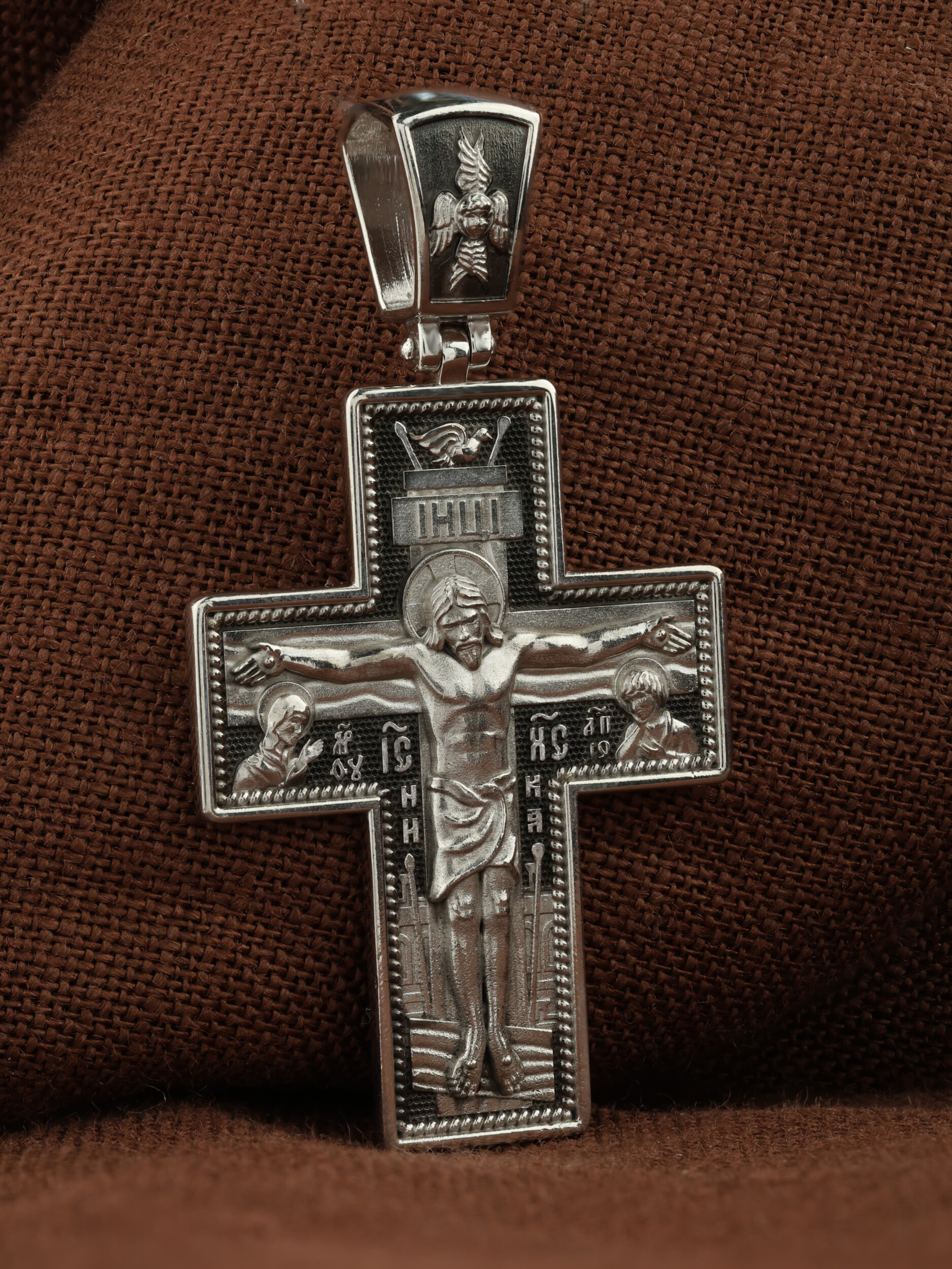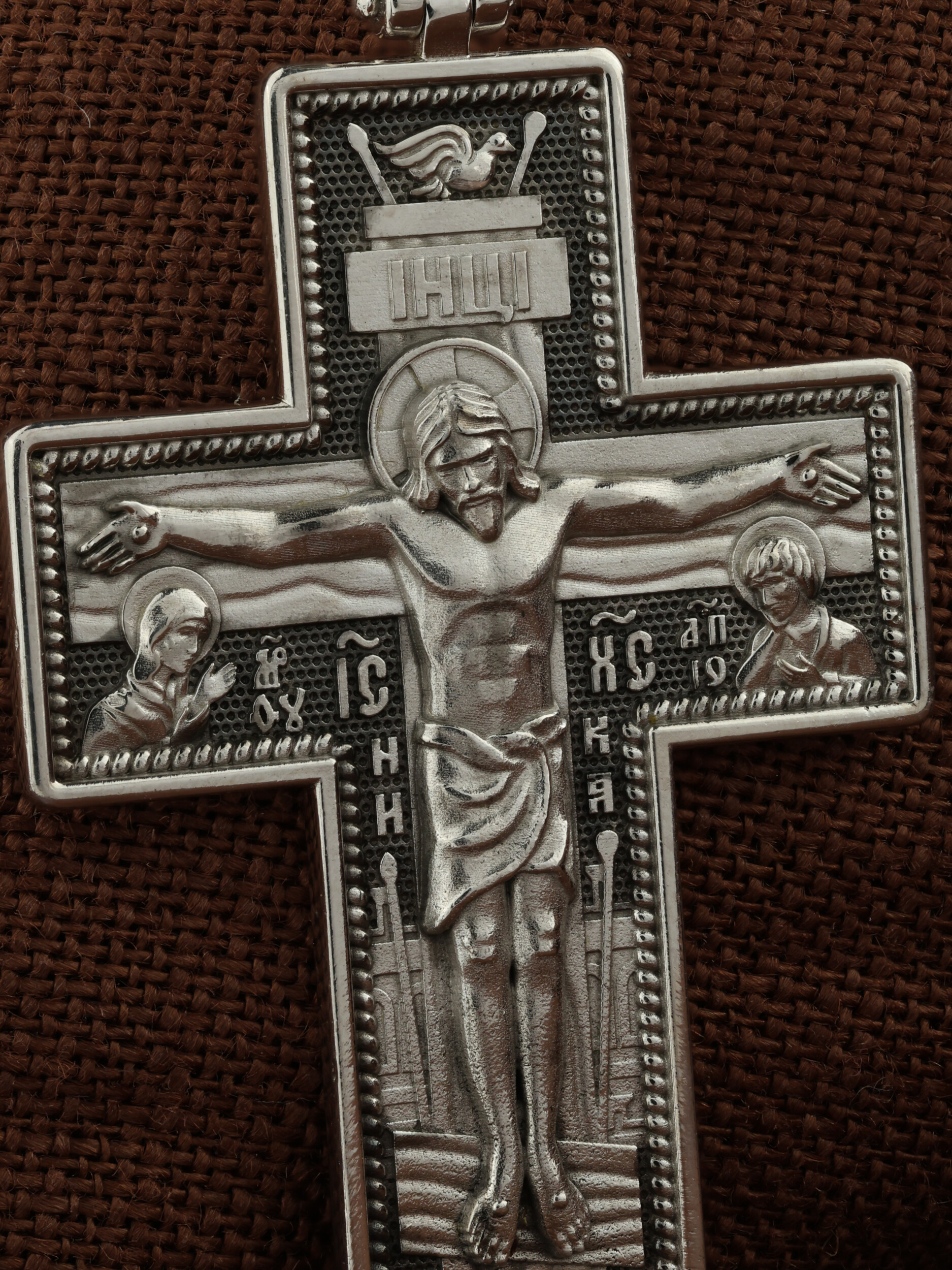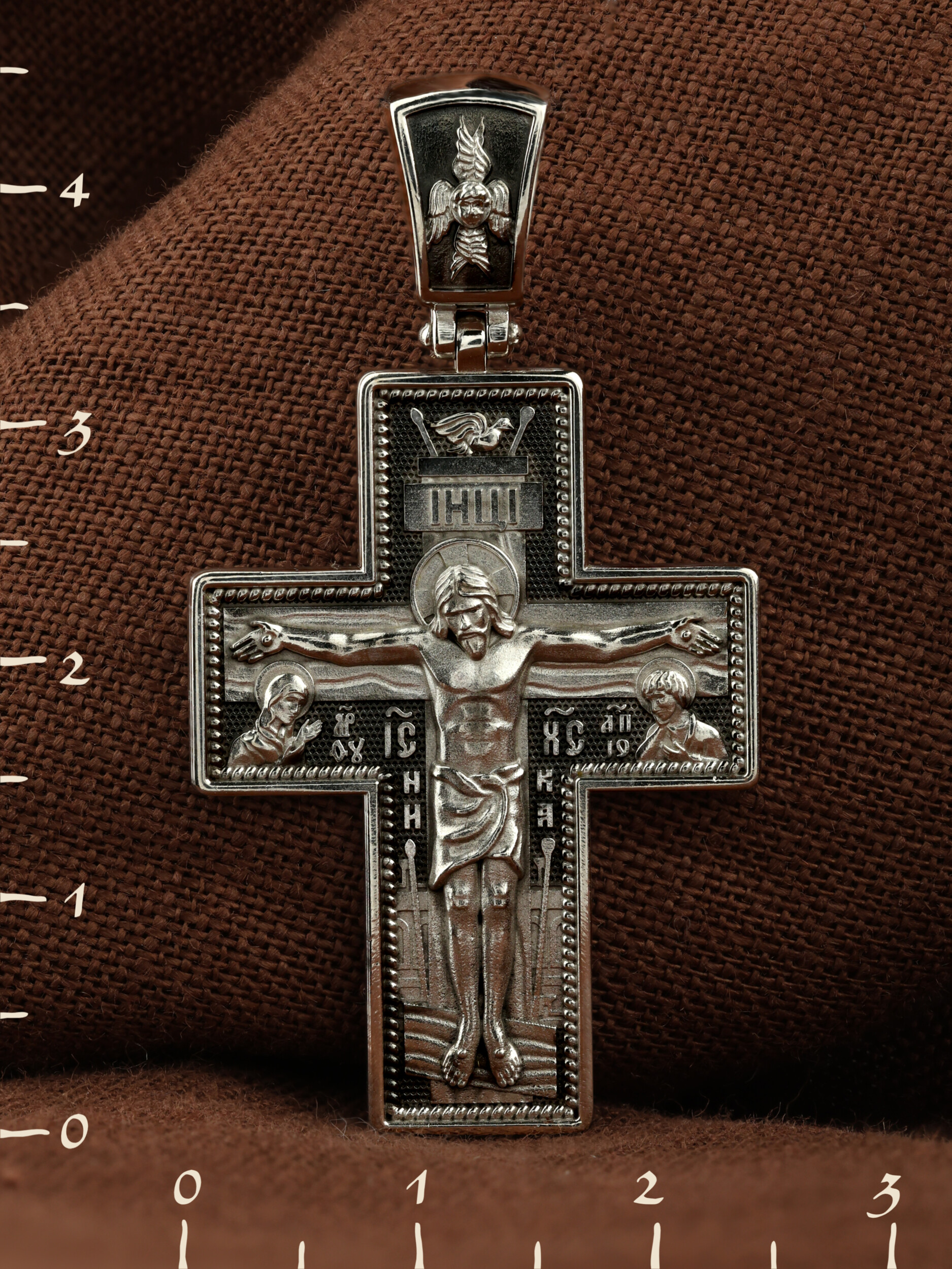На лицевой стороне изображено Распятие Господа Иисуса Христа. С двух сторон Христу предстоят Пресвятая Богородица и св. пророк и Предтеча Господень Иоанн Креститель, которые имеют особое дерзновение перед Богом молиться за всех людей. Иконы, где они изображены молящимися Христу, называются Деисус, что значит «моление».