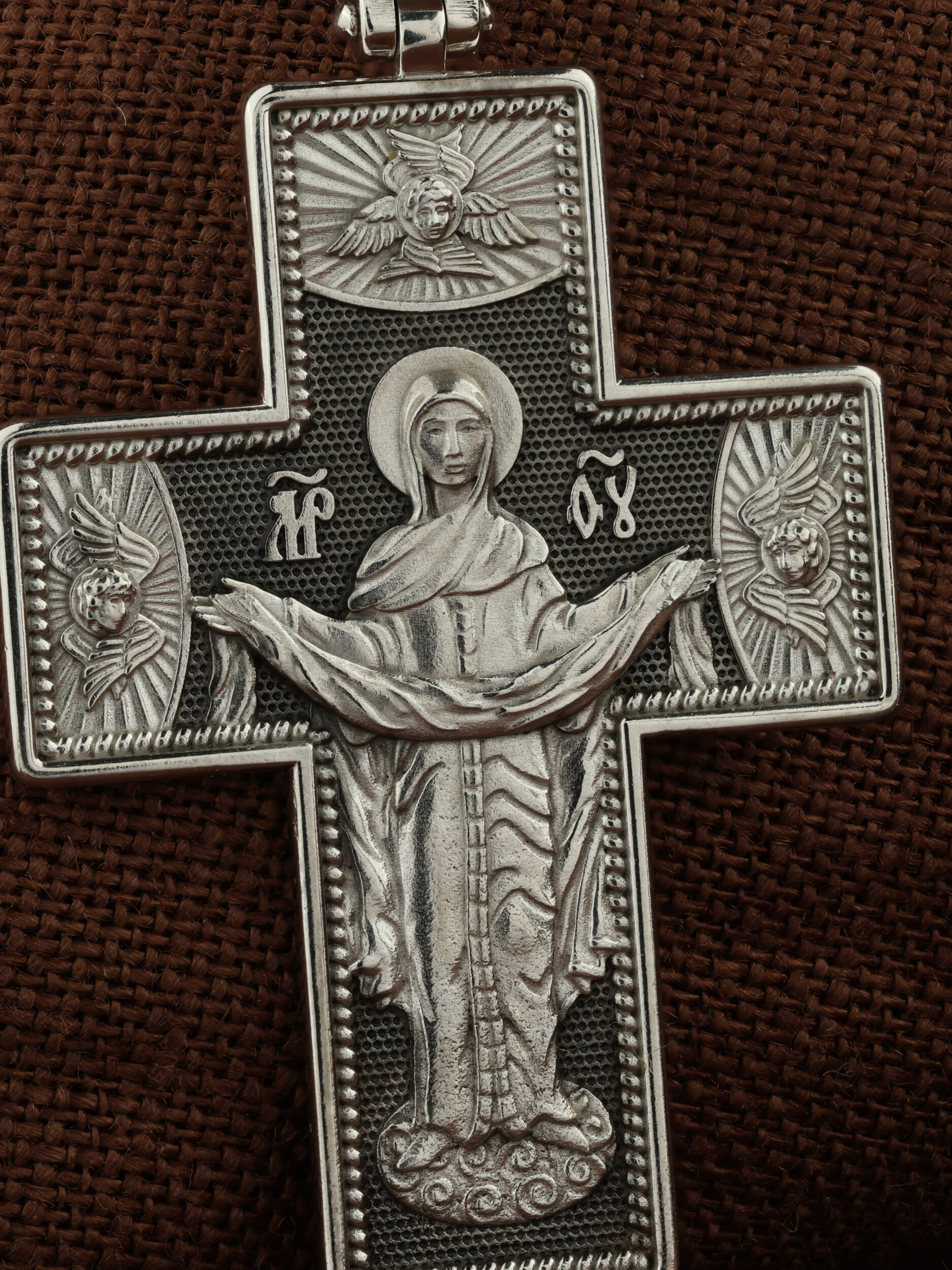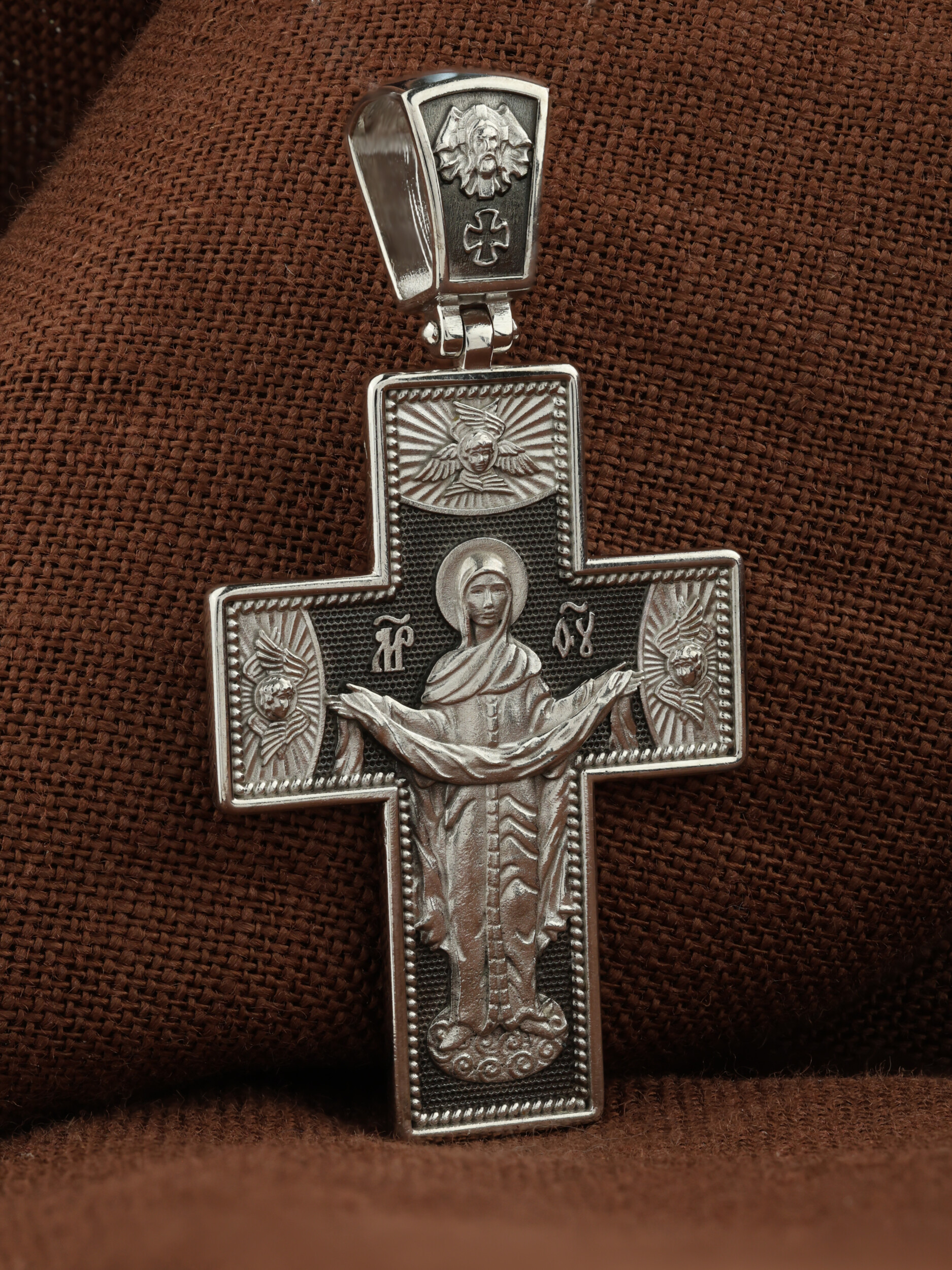 На обороте креста, в окружении крылатых Серафимов, изображена икона Покрова Пресвятой Богородицы. Праздник Покрова Божией Матери является воспоминанием чуда, которое произошло во Влахнернской церкви 1 (14) октября 910 года: Пресвятая Богородица явилась верующим над алтарем храма и распростерла над ними Свое покрывало. В этот день Божья Матерь открыла людям, что Она является Ходатаицей за них перед Богом. Богородица простирает Свой молитвенный покров над всеми православными христианами и умоляет Сына Своего о даровании вечного спасения каждому человеку.