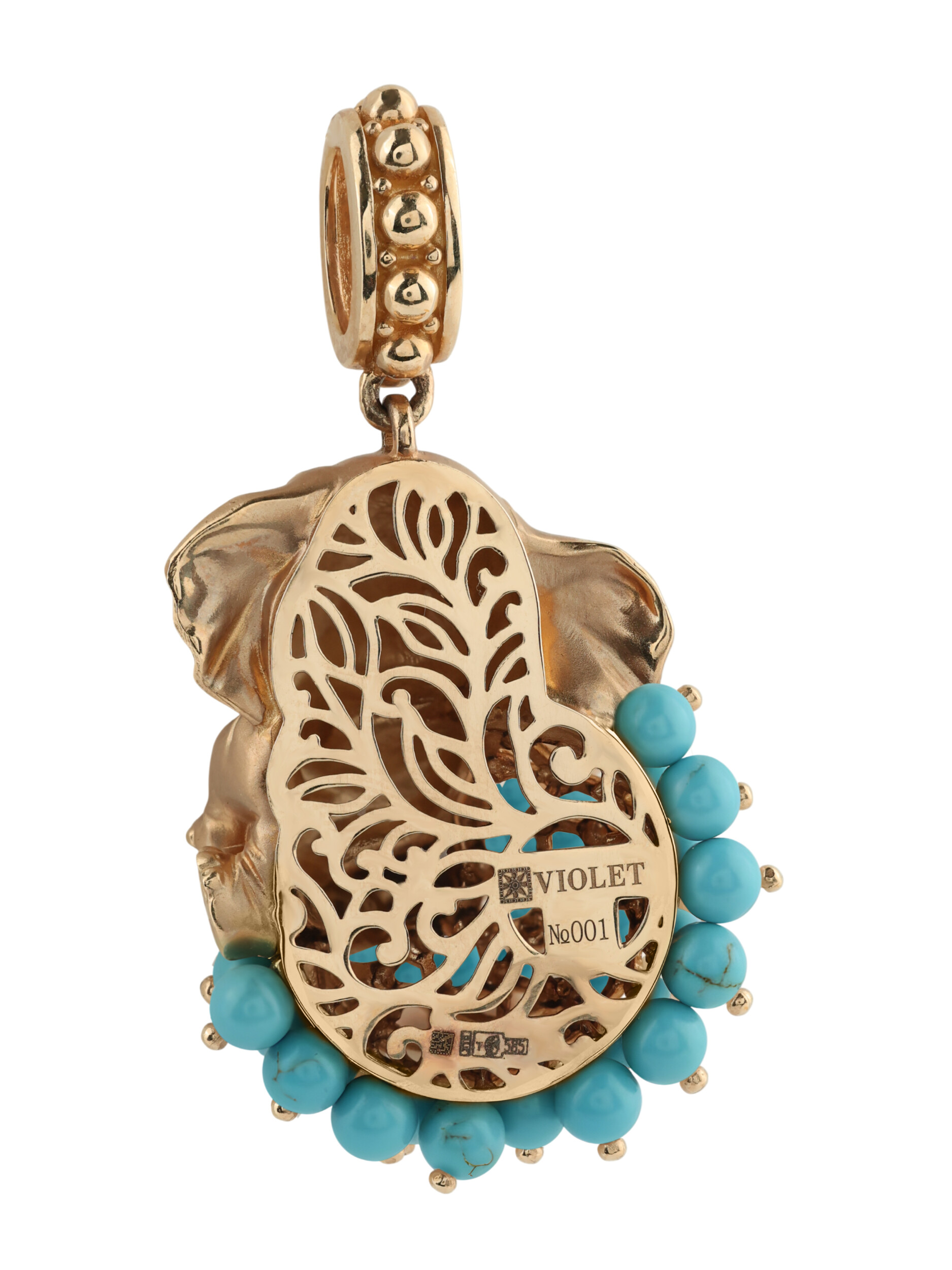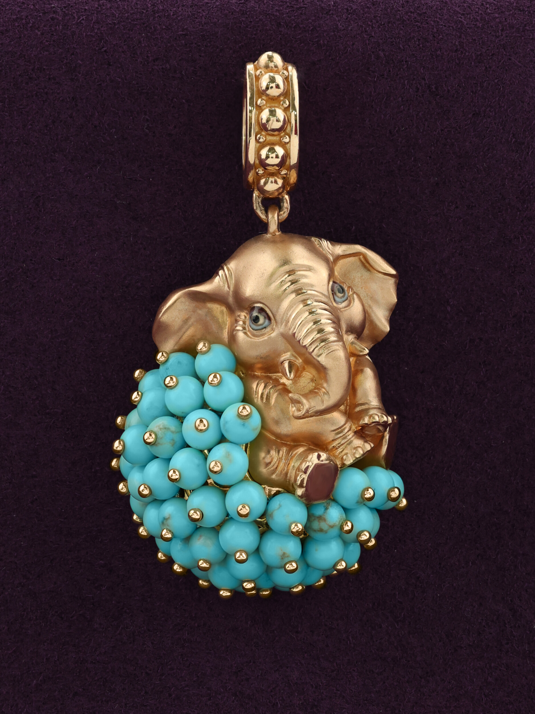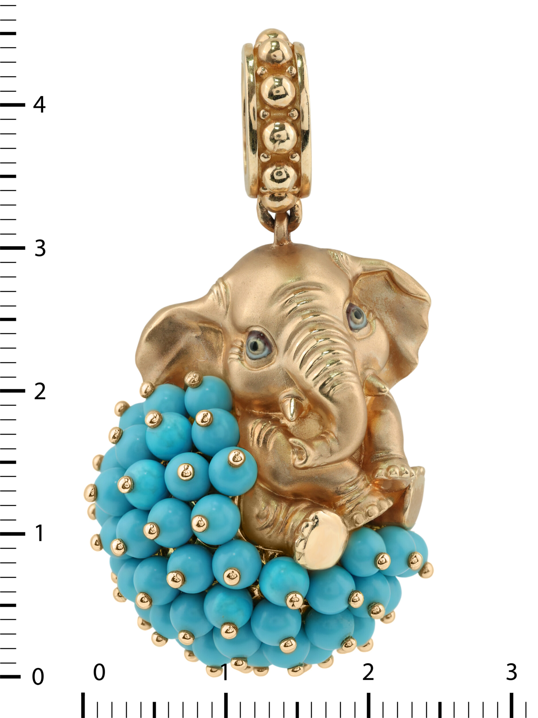 Центральным элементом композиции выступает инкрустация из 46 вставок бирюзы. Камни имеют форму бусин и обладают насыщенным бирюзовым цветом, создавая красивый контраст с теплым оттенком красного золота. Такая ювелирная подвеска универсальна и подойдет как для женщин, так и для мужчин, которые ценят эксклюзивные аксессуары. Украшение входит в коллекцию De luxe Premium — Слонята, отличающуюся своим авторским подходом к формам.