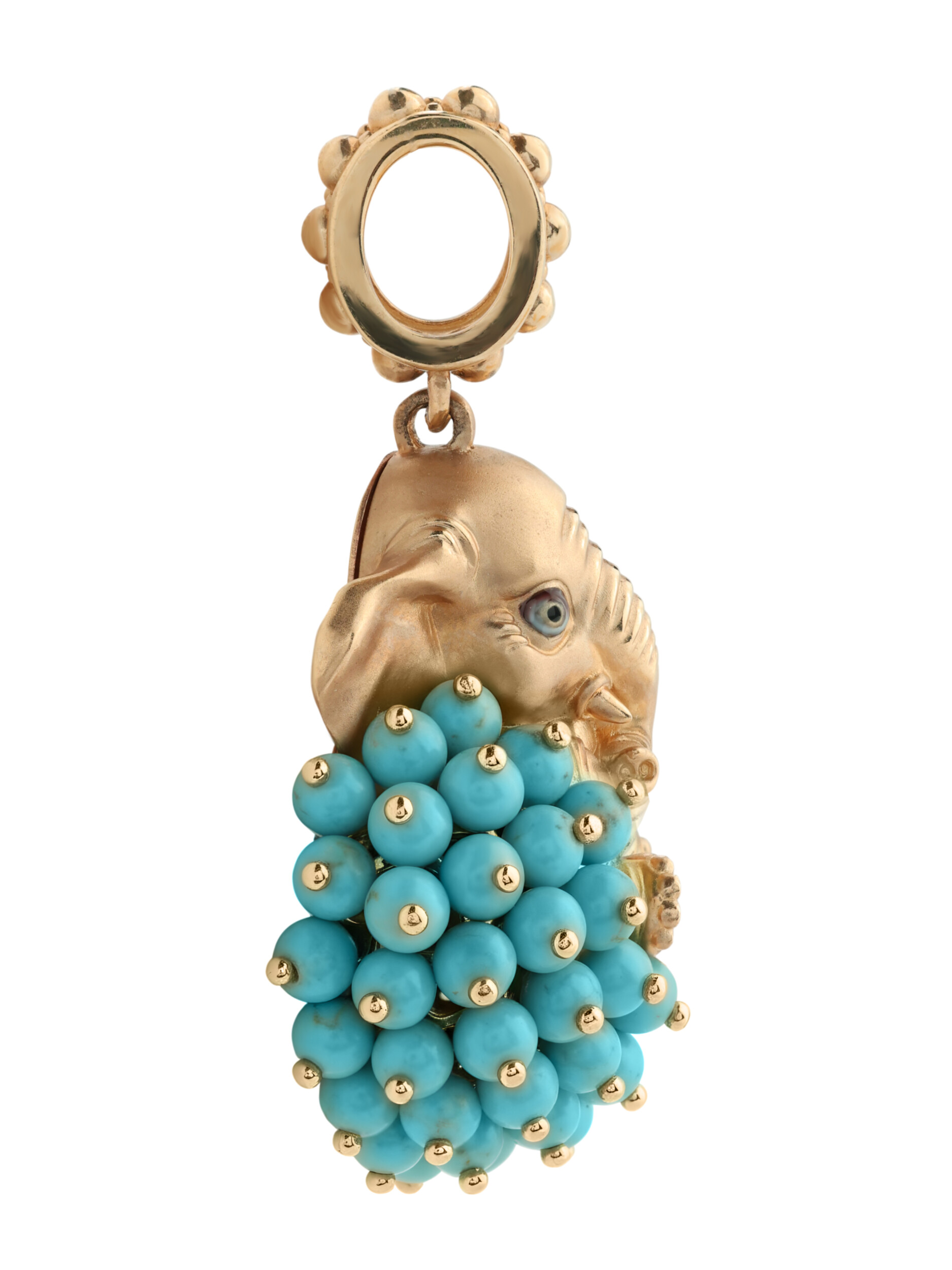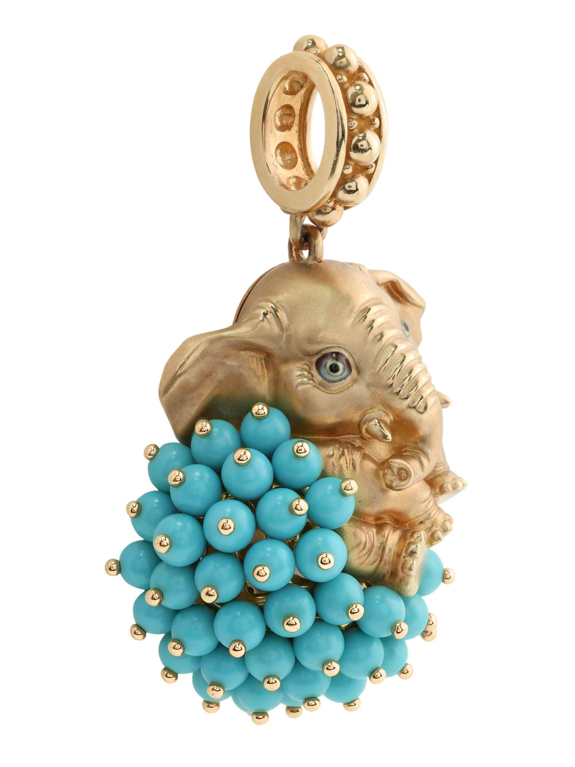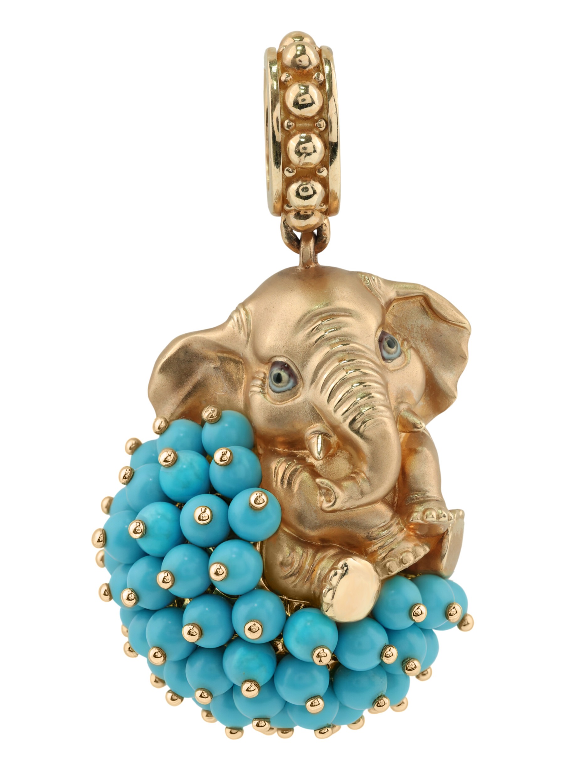 Центральным элементом композиции выступает инкрустация из 46 вставок бирюзы. Камни имеют форму бусин и обладают насыщенным бирюзовым цветом, создавая красивый контраст с теплым оттенком красного золота. Такая ювелирная подвеска универсальна и подойдет как для женщин, так и для мужчин, которые ценят эксклюзивные аксессуары. Украшение входит в коллекцию De luxe Premium — Слонята, отличающуюся своим авторским подходом к формам.