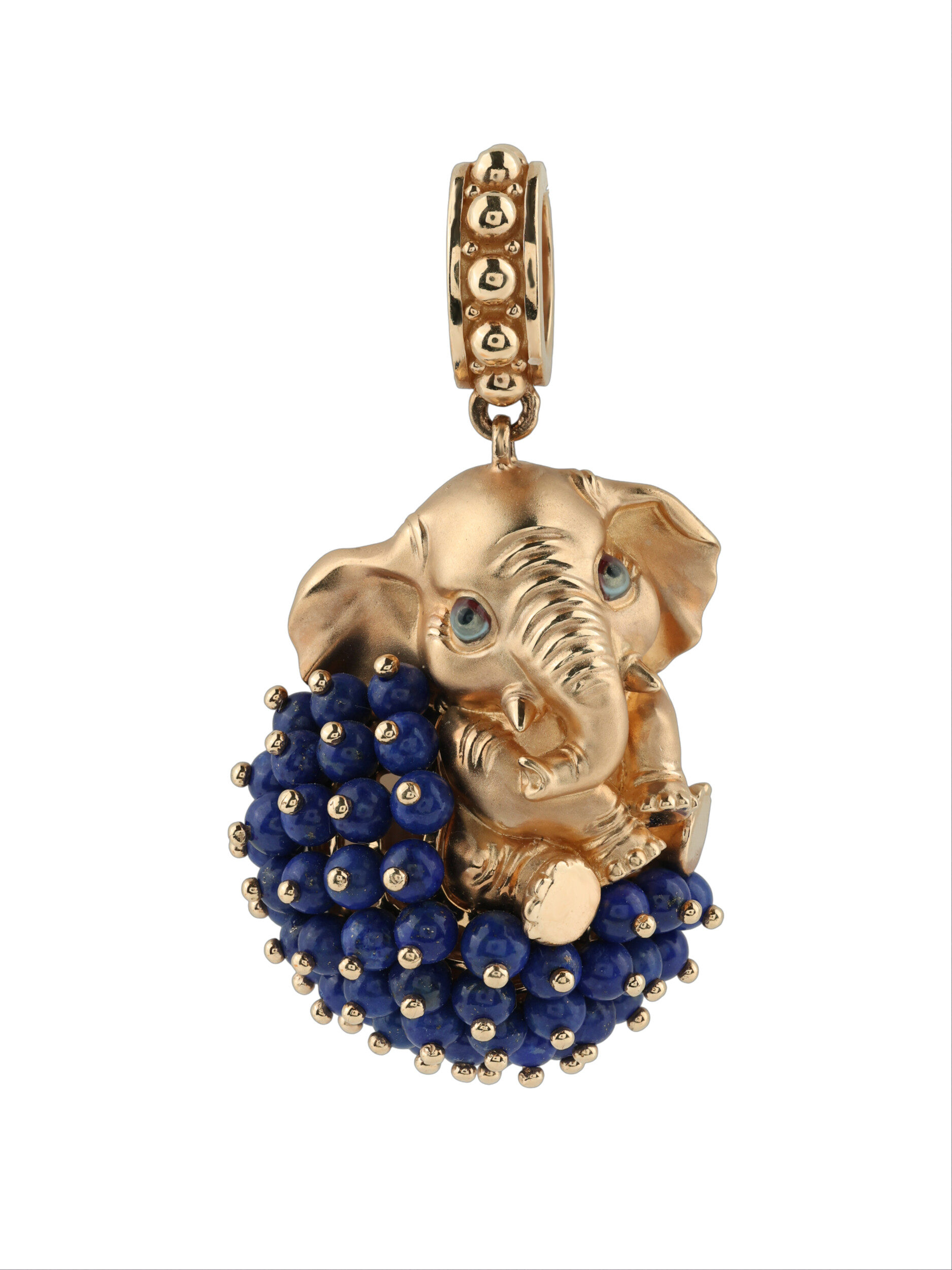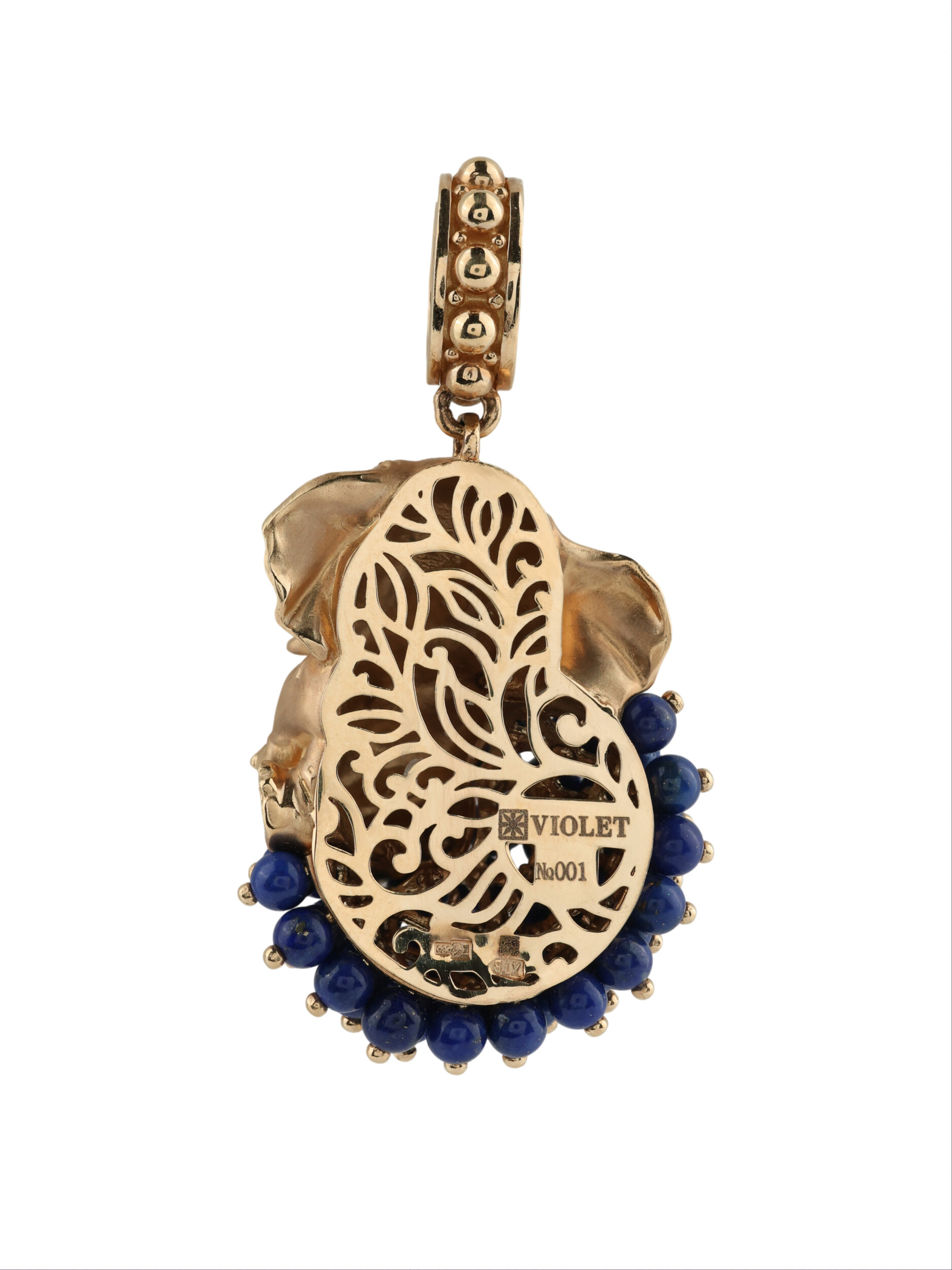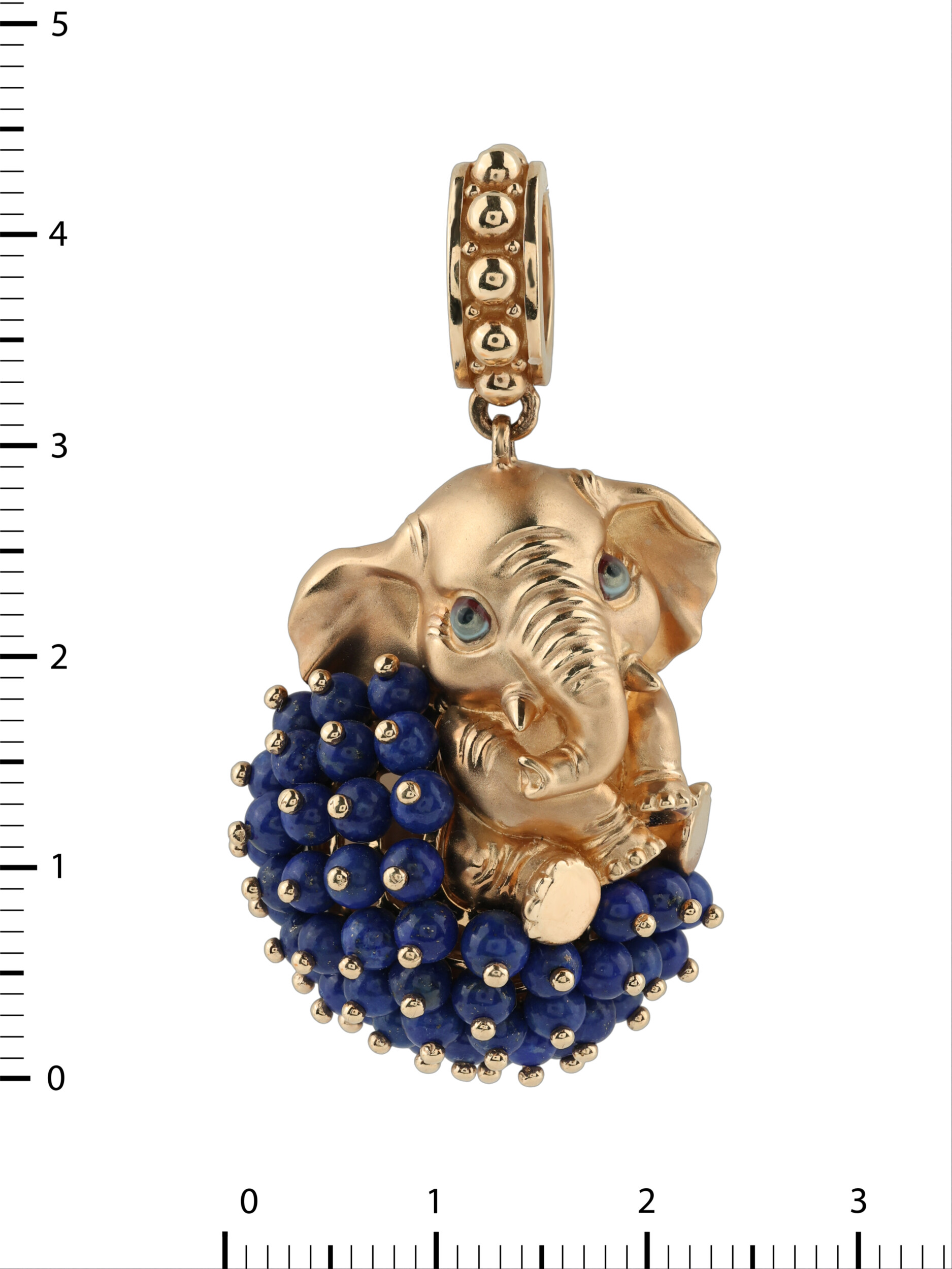 Основную композицию дополняют 46 вставок из натурального лазурита синего цвета. Камни имеют форму аккуратных бусин, которые создают красивый контраст с теплым оттенком благородного металла. Деликатное использование эмали добавляет глубины и выразительности, подчеркивая мастерство исполнения. Яркая игра цвета — сочетание глубокого синего лазурита и теплого красного золота — делает эту подвеску по-настоящему притягательной.