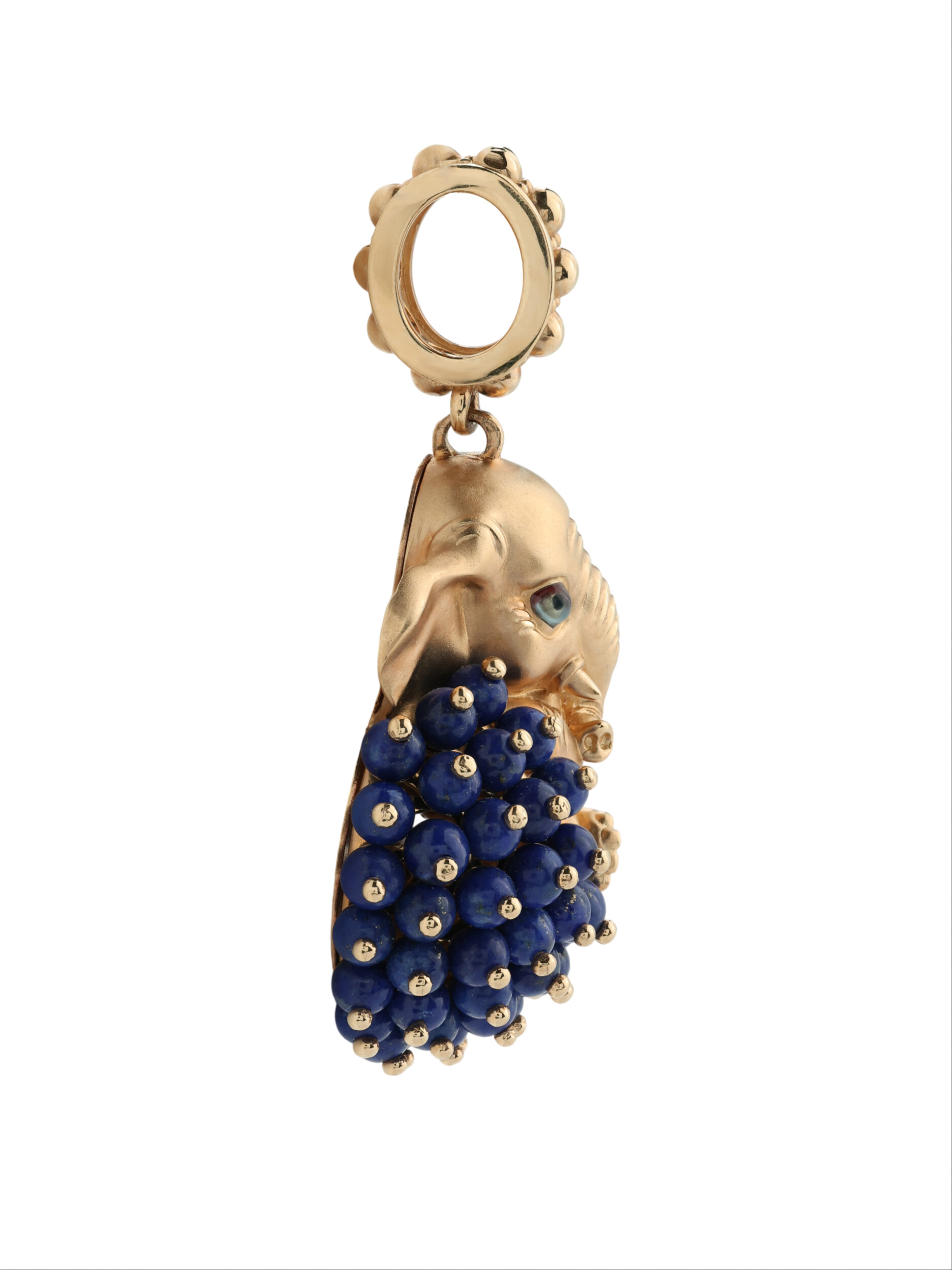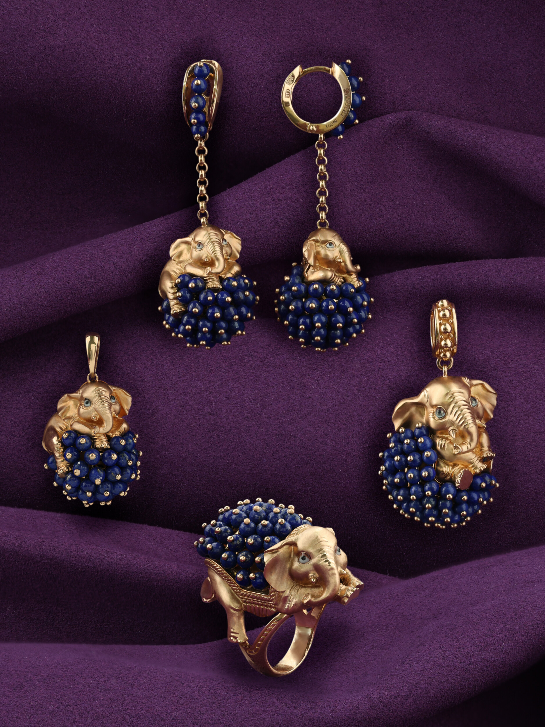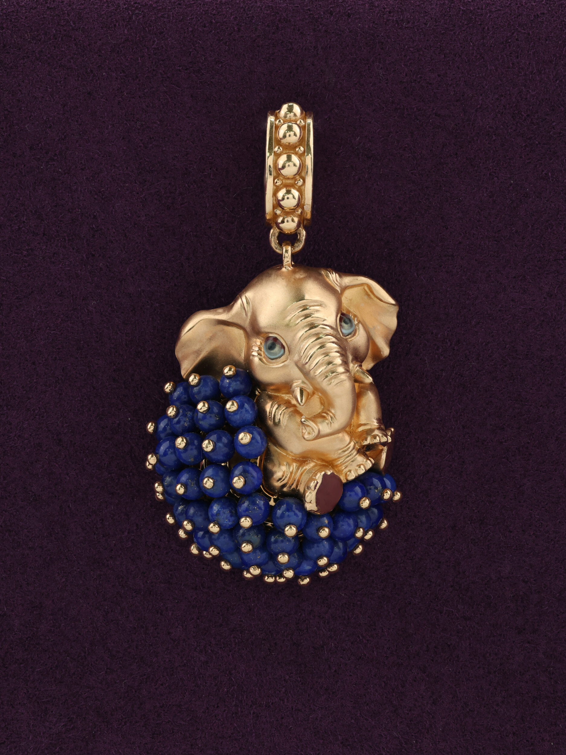 Основную композицию дополняют 46 вставок из натурального лазурита синего цвета. Камни имеют форму аккуратных бусин, которые создают красивый контраст с теплым оттенком благородного металла. Деликатное использование эмали добавляет глубины и выразительности, подчеркивая мастерство исполнения. Яркая игра цвета — сочетание глубокого синего лазурита и теплого красного золота — делает эту подвеску по-настоящему притягательной.
