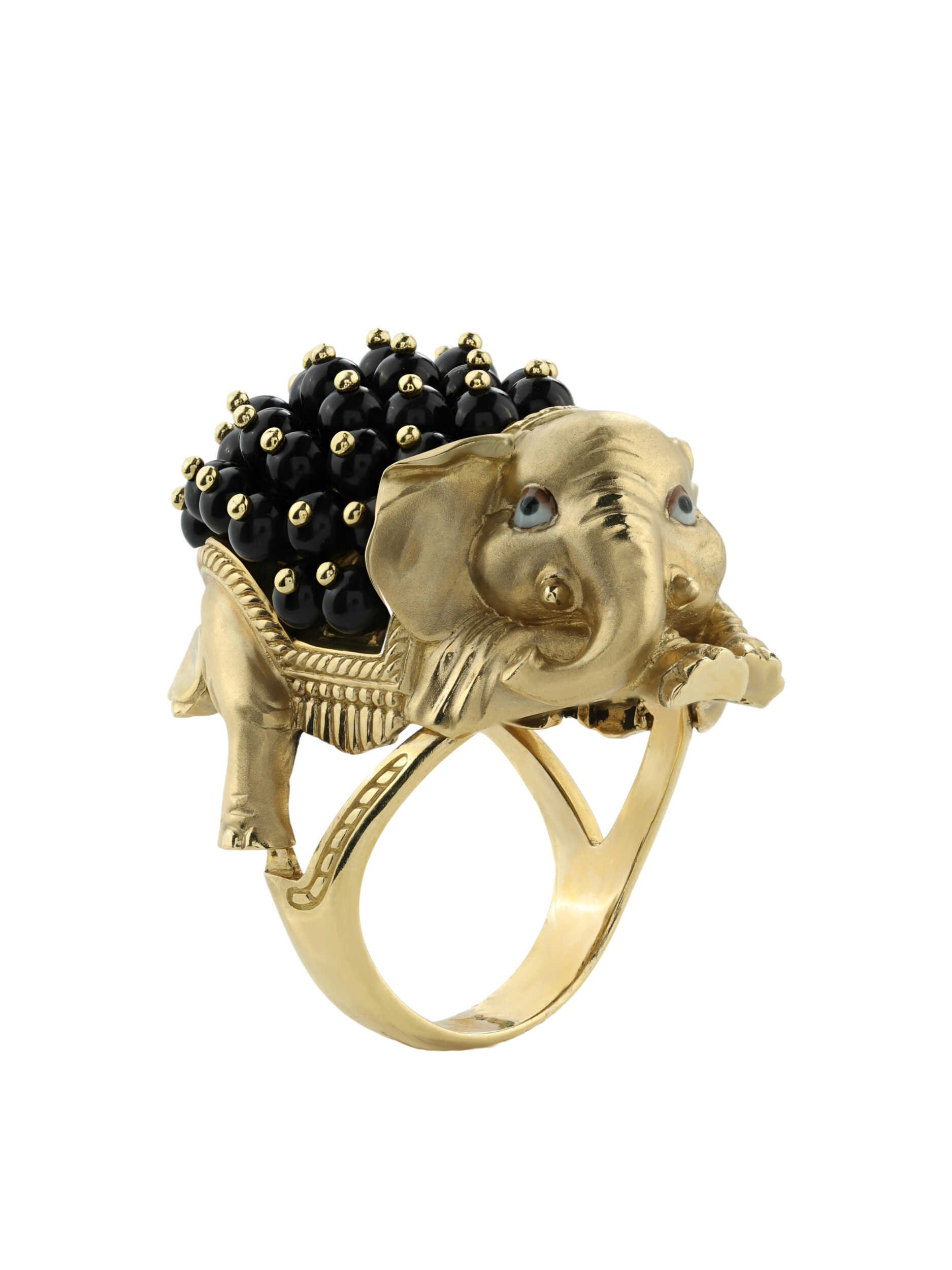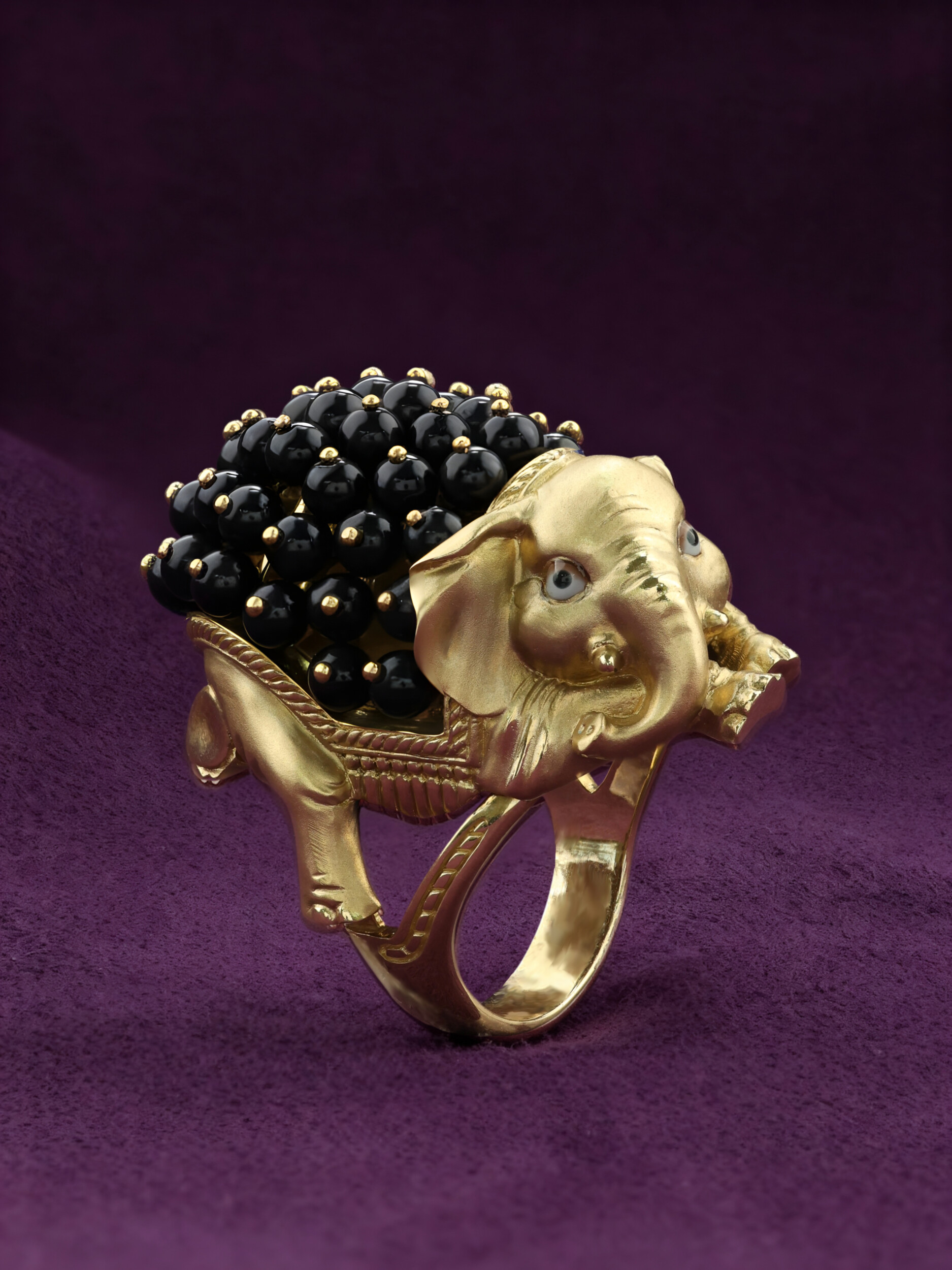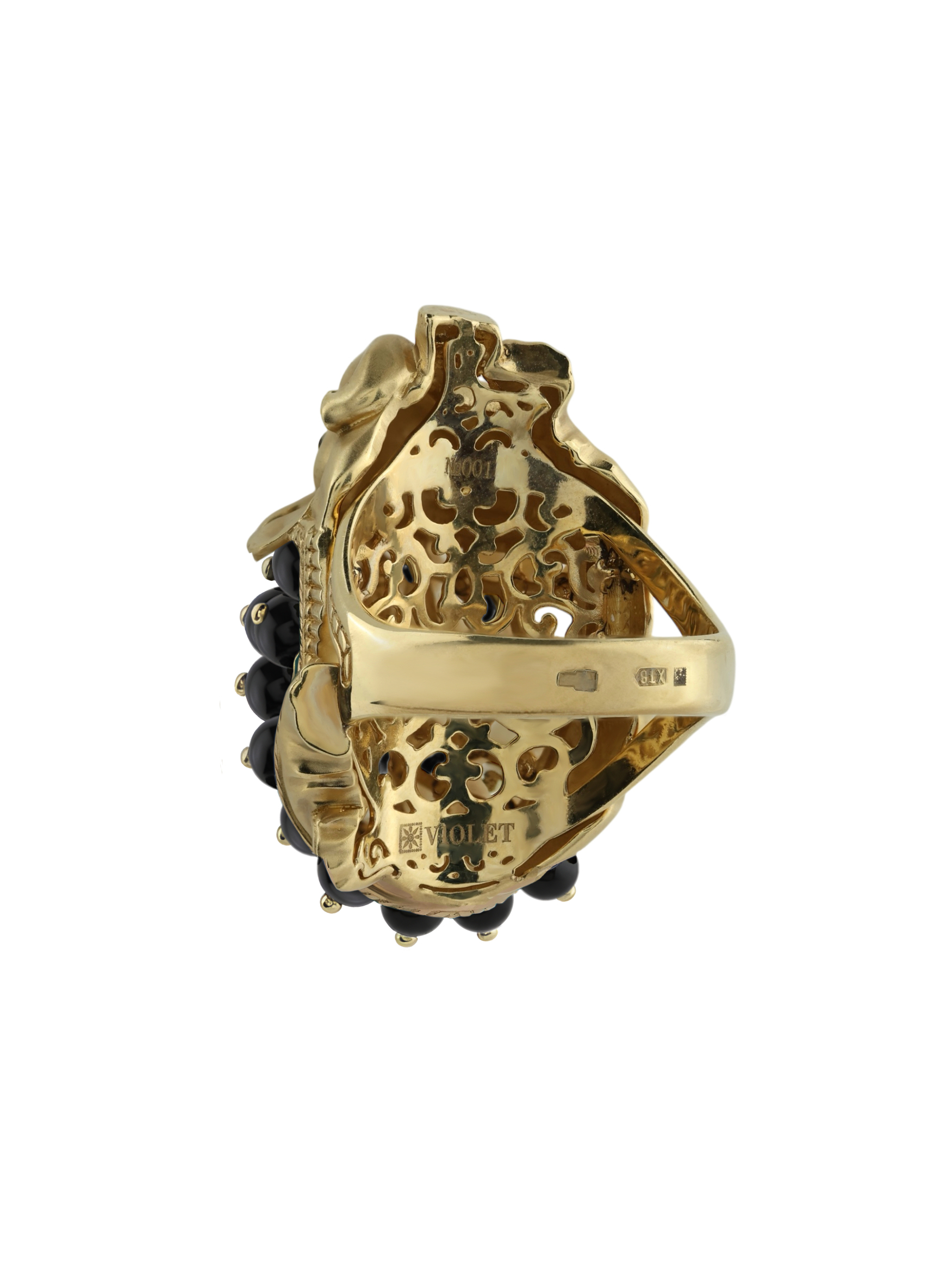 Особую глубину и объем композиции придает инкрустация: 46 вставок черного оникса в форме бусин эффектно контрастируют с сиянием драгоценного металла, создавая выразительный и запоминающийся образ. Это кольцо с дизайном в виде животных станет центральным акцентом вашего стиля, притягивая восхищенные взгляды своей уникальной эстетикой.