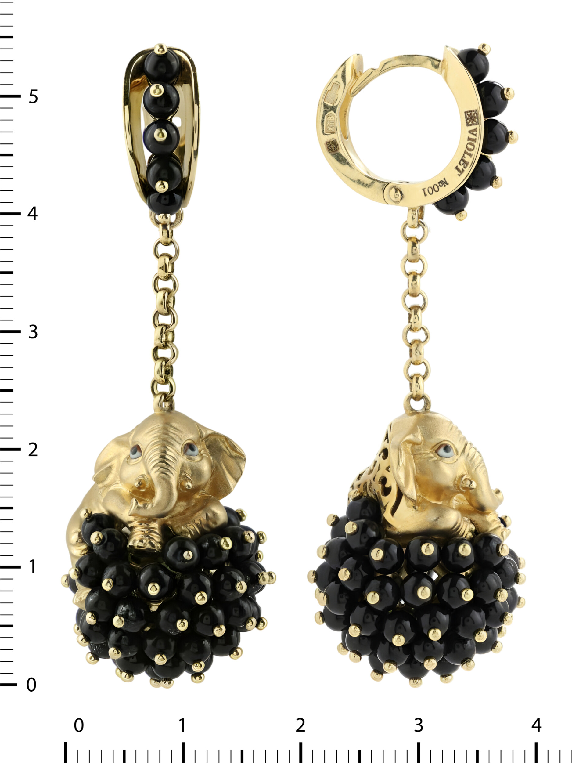 Особого внимания заслуживает богатая отделка: вставки из черного оникса в форме бусин эффектно контрастируют с благородным лимонным цветом золота. В общей сложности в украшении использовано 110 вставок, которые придают изделию объем и выразительную фактуру. Разноцветный акцент, созданный сочетанием эмали, черного оникса и золотого блеска, делает эти серьги центральным элементом любого образа.