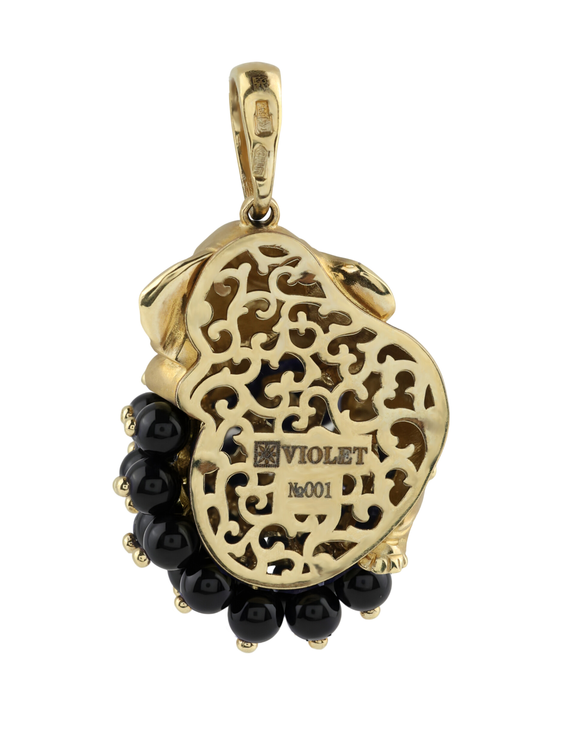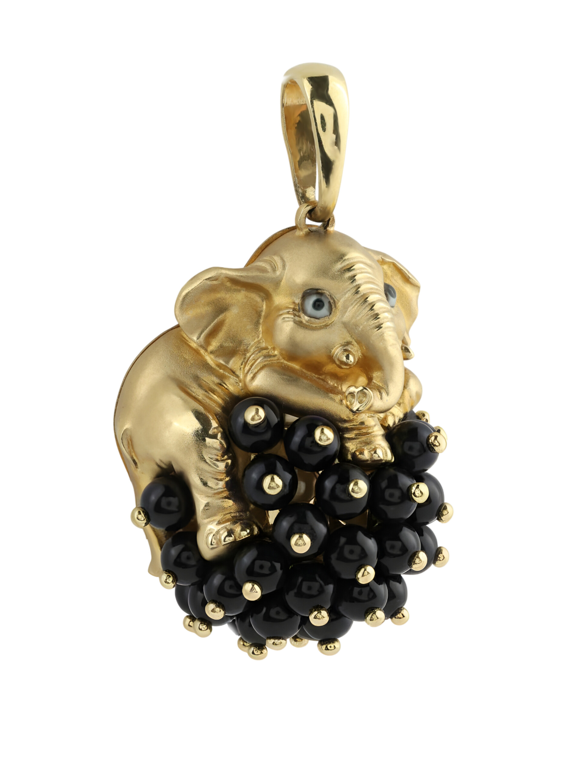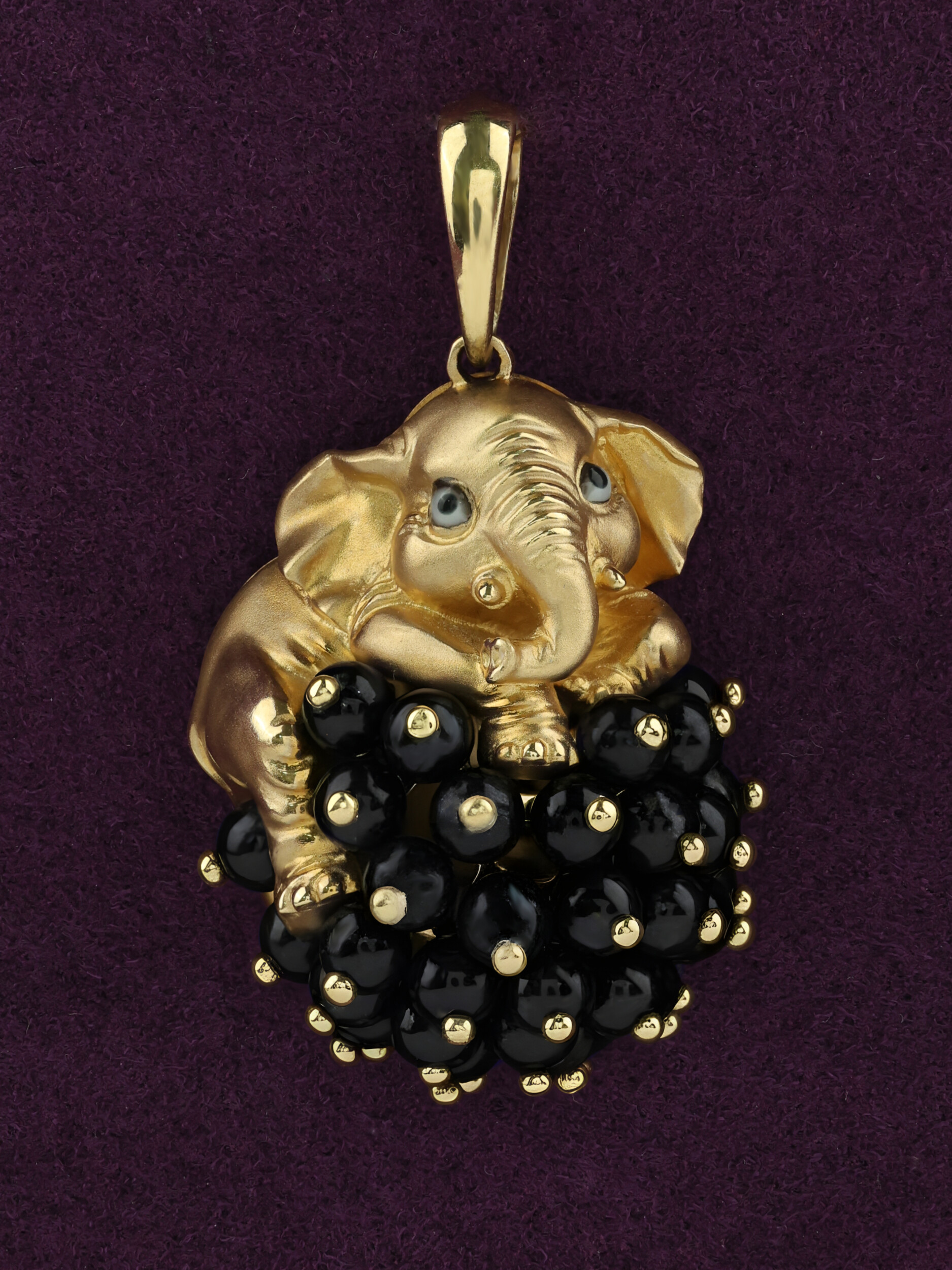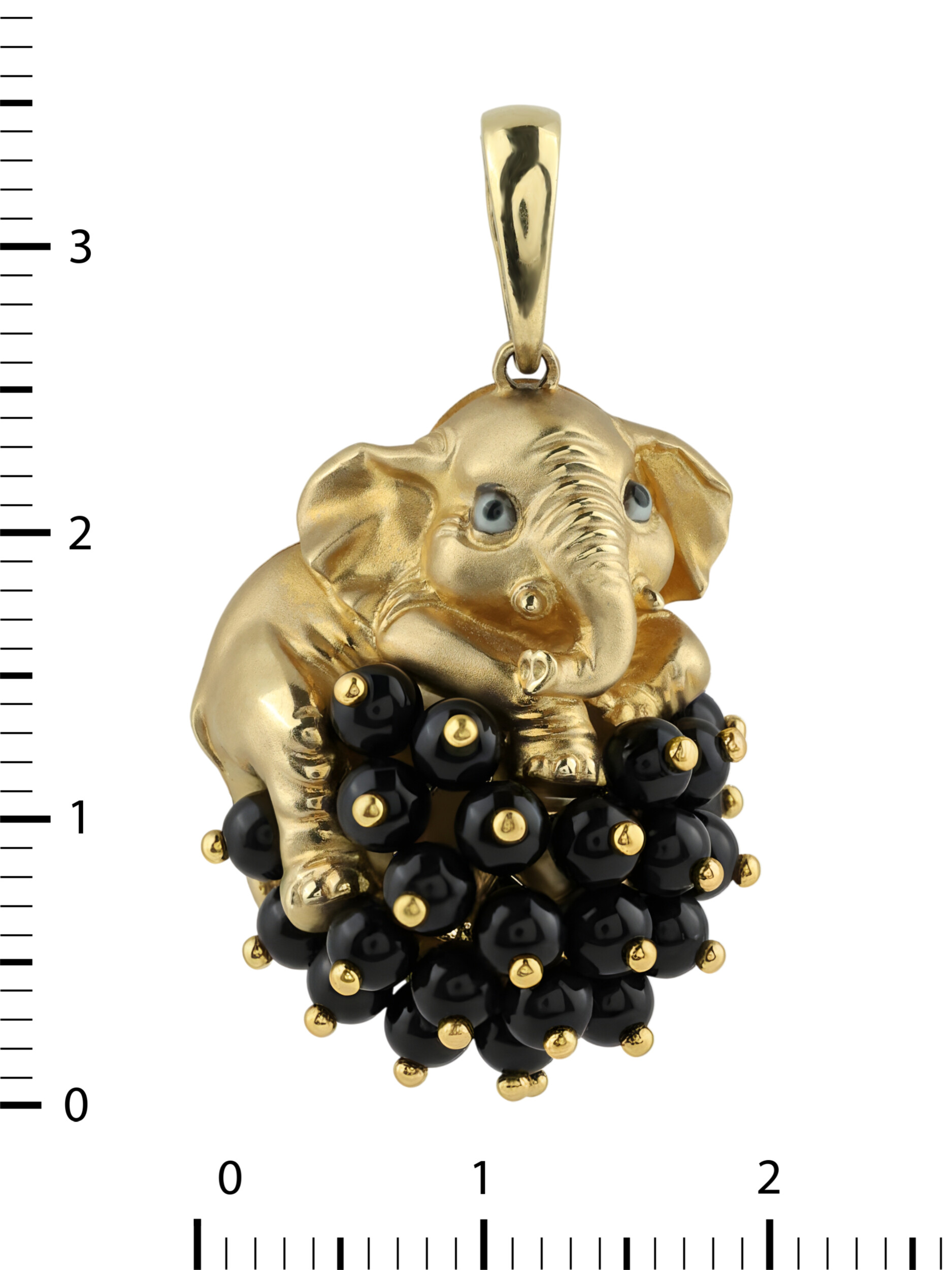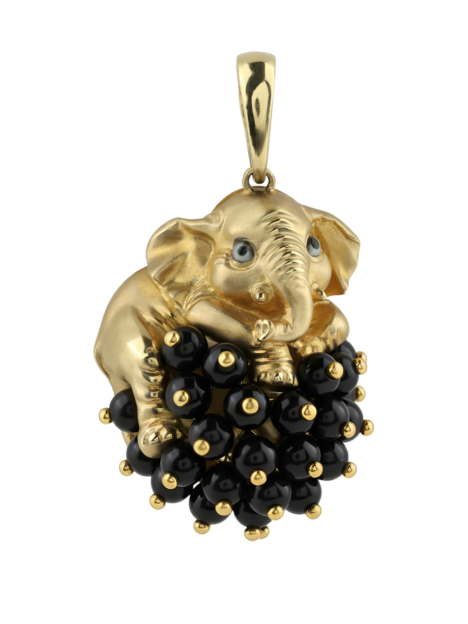 Особую выразительность украшению придает сочетание материалов. Основным декоративным элементом выступают 34 вставки из оникса черного цвета, выполненные в форме бусин. Они создают глубокий, контрастный фон, на котором изящно расположился золотой слоненок. Аккуратные детали эмали придают изделию законченный вид, подчеркивая индивидуальность и художественный замысел ювелирного украшения.