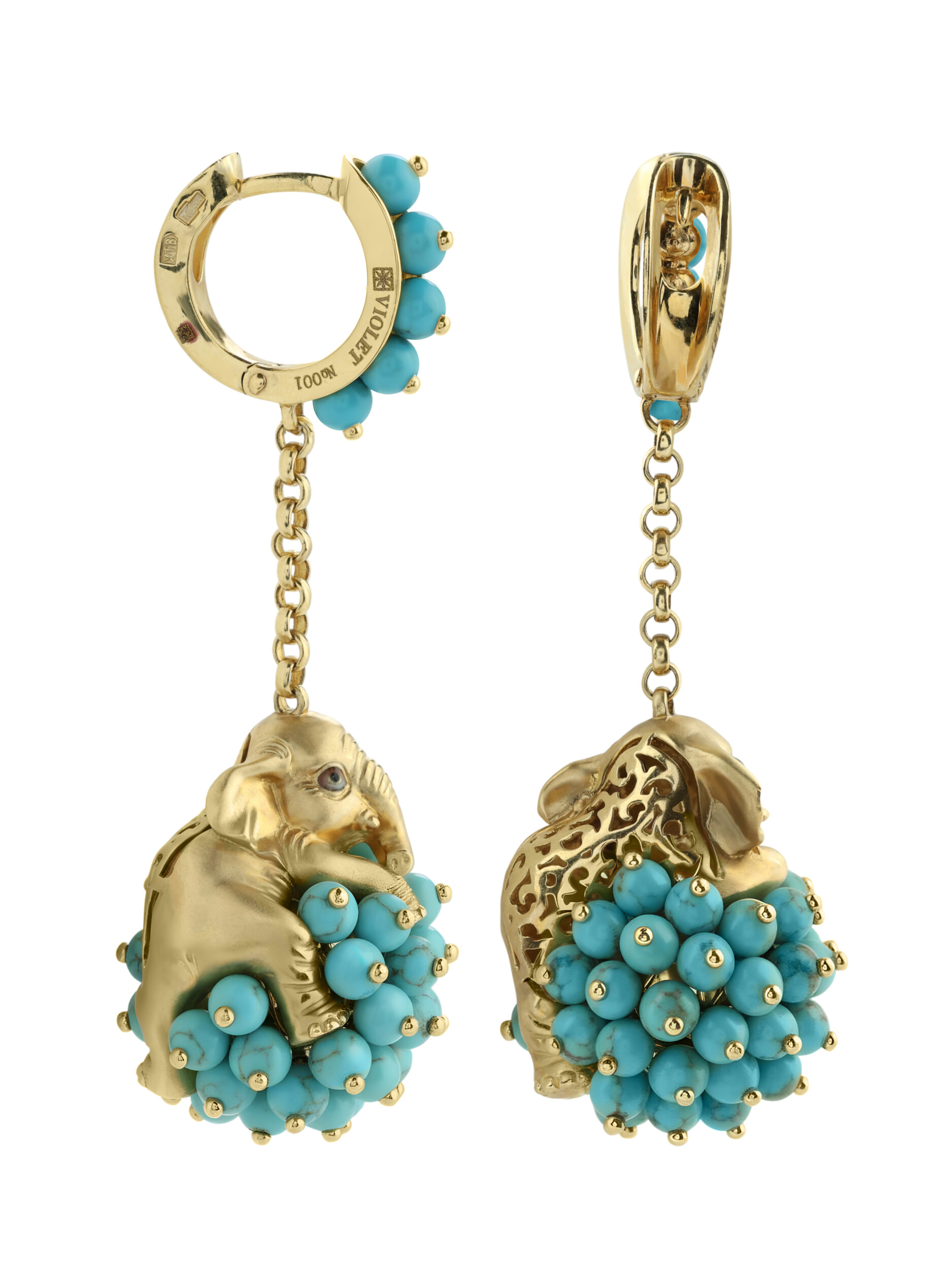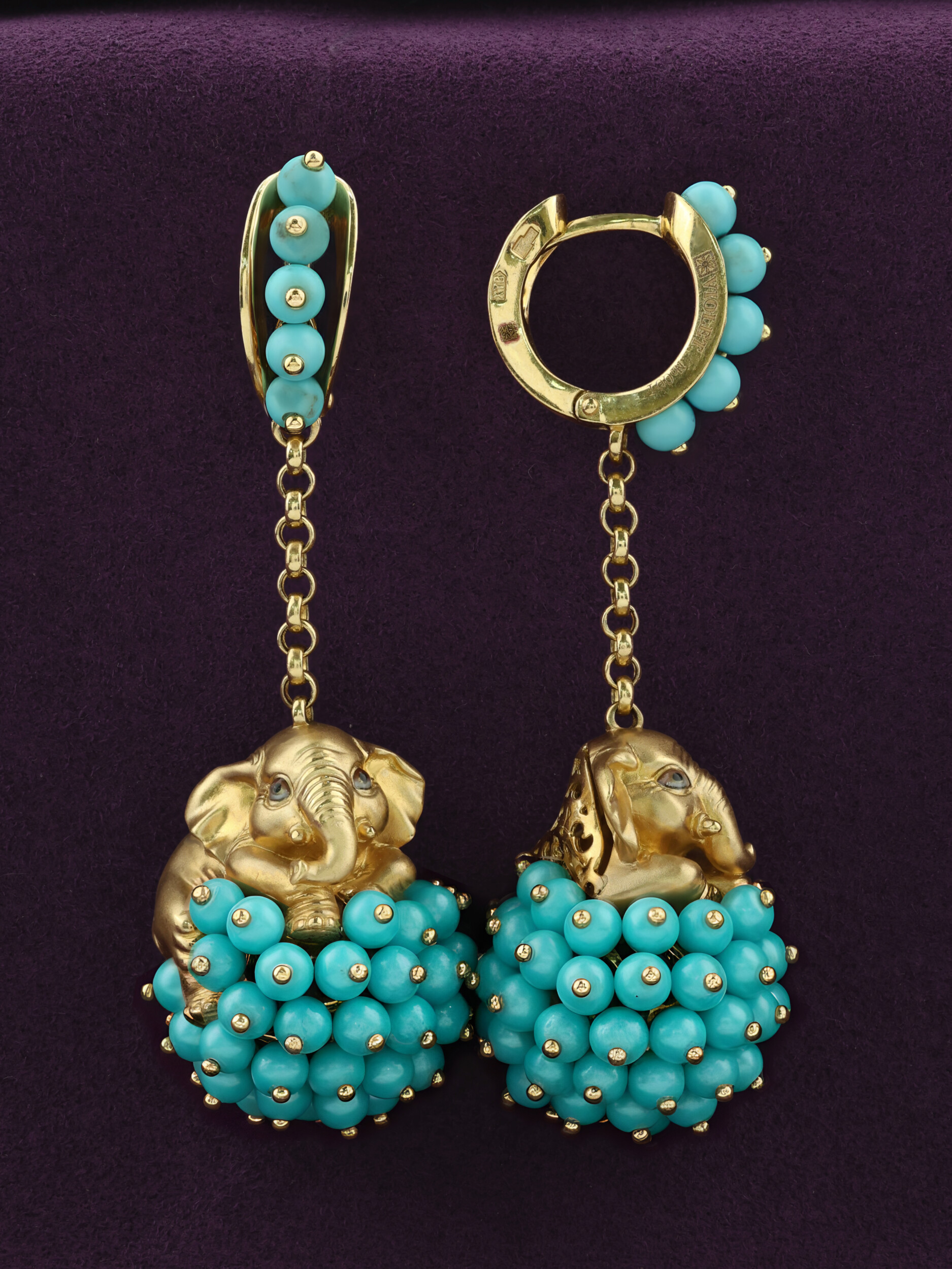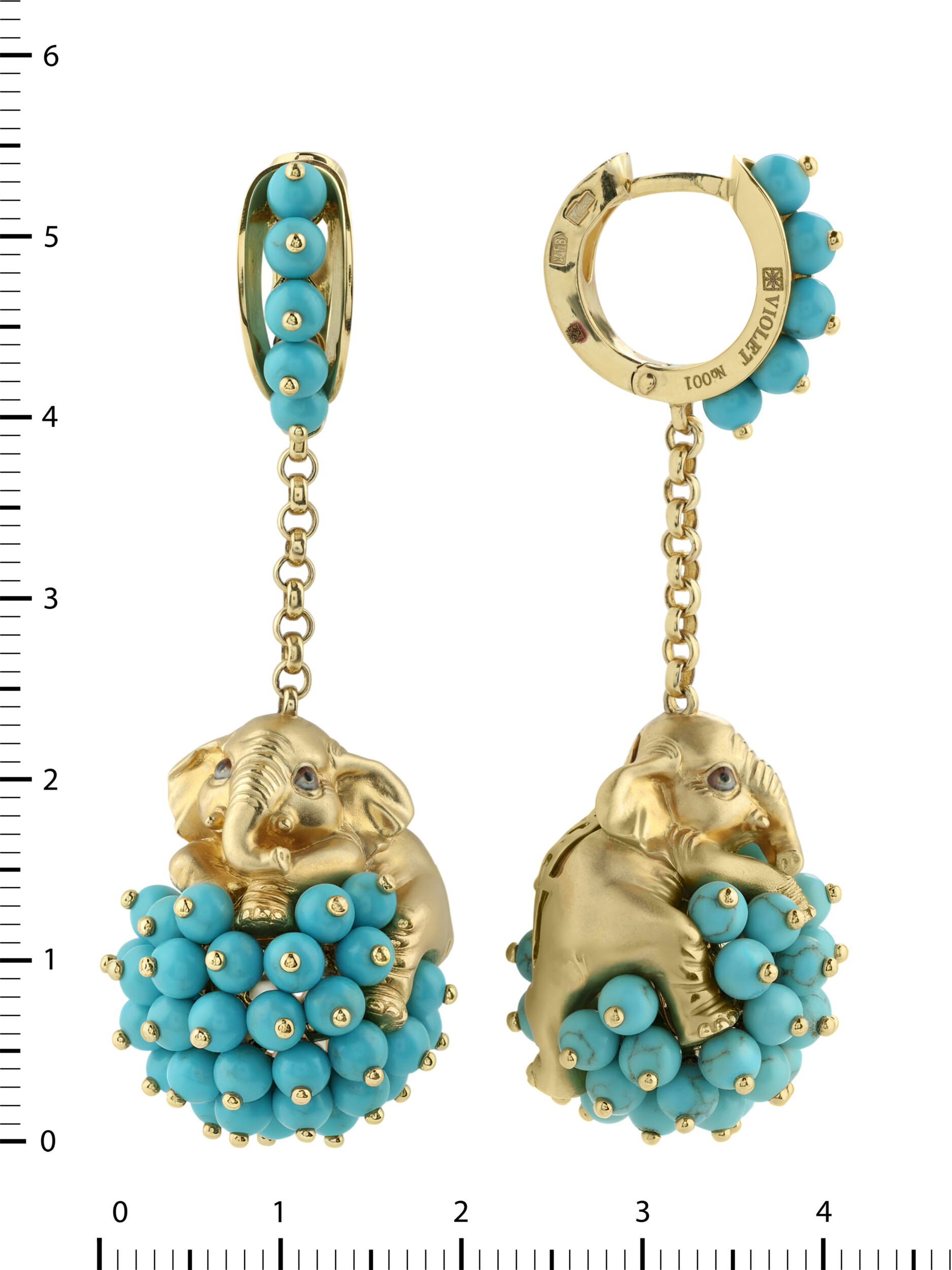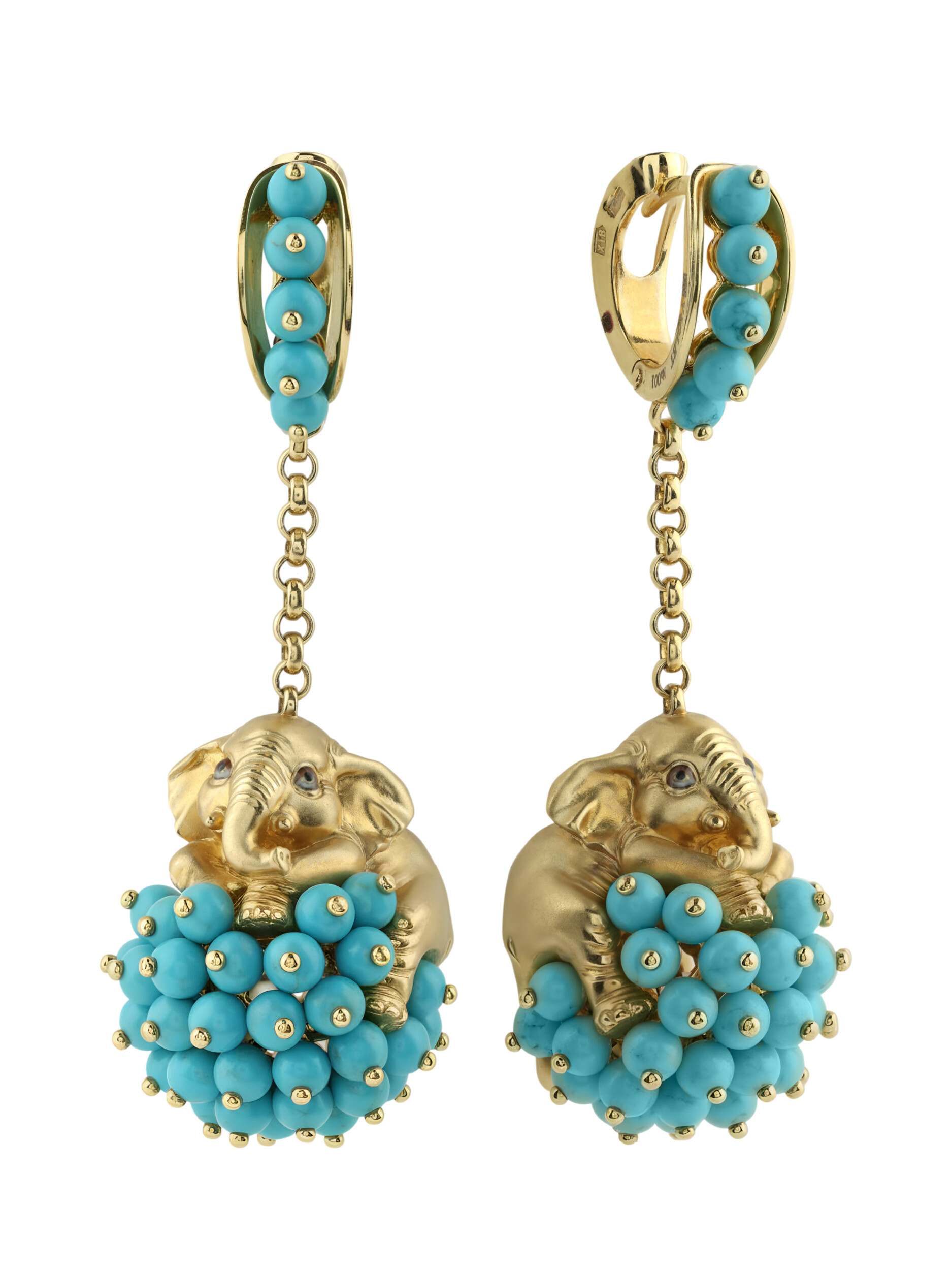 Серьги из коллекции De luxe Premium — Слонята представляют собой удивительный образец ювелирного искусства, где смелый дизайн встречается с благородными материалами. Изделие выполнено из лимонного золота 585 пробы, чей теплый оттенок идеально гармонирует с ярким акцентом вставок. Центральным элементом украшения является искусная фигурка слона, дополненная россыпью из 110 вставок бирюзы в форме бусин. Бирюзовый цвет камней в сочетании с разноцветной эмалью создает выразительный визуальный контраст, делая серьги заметным и запоминающимся аксессуаром.