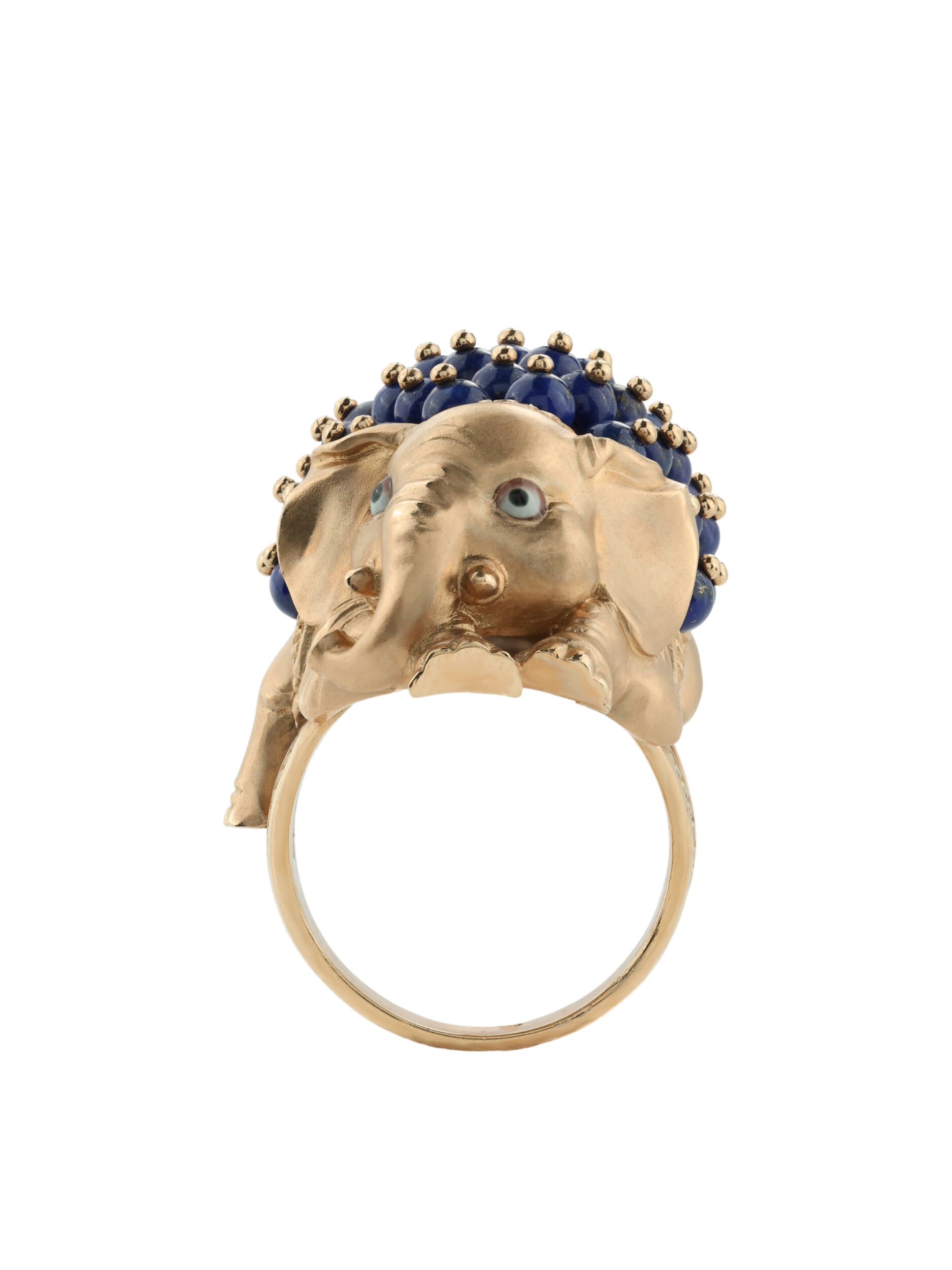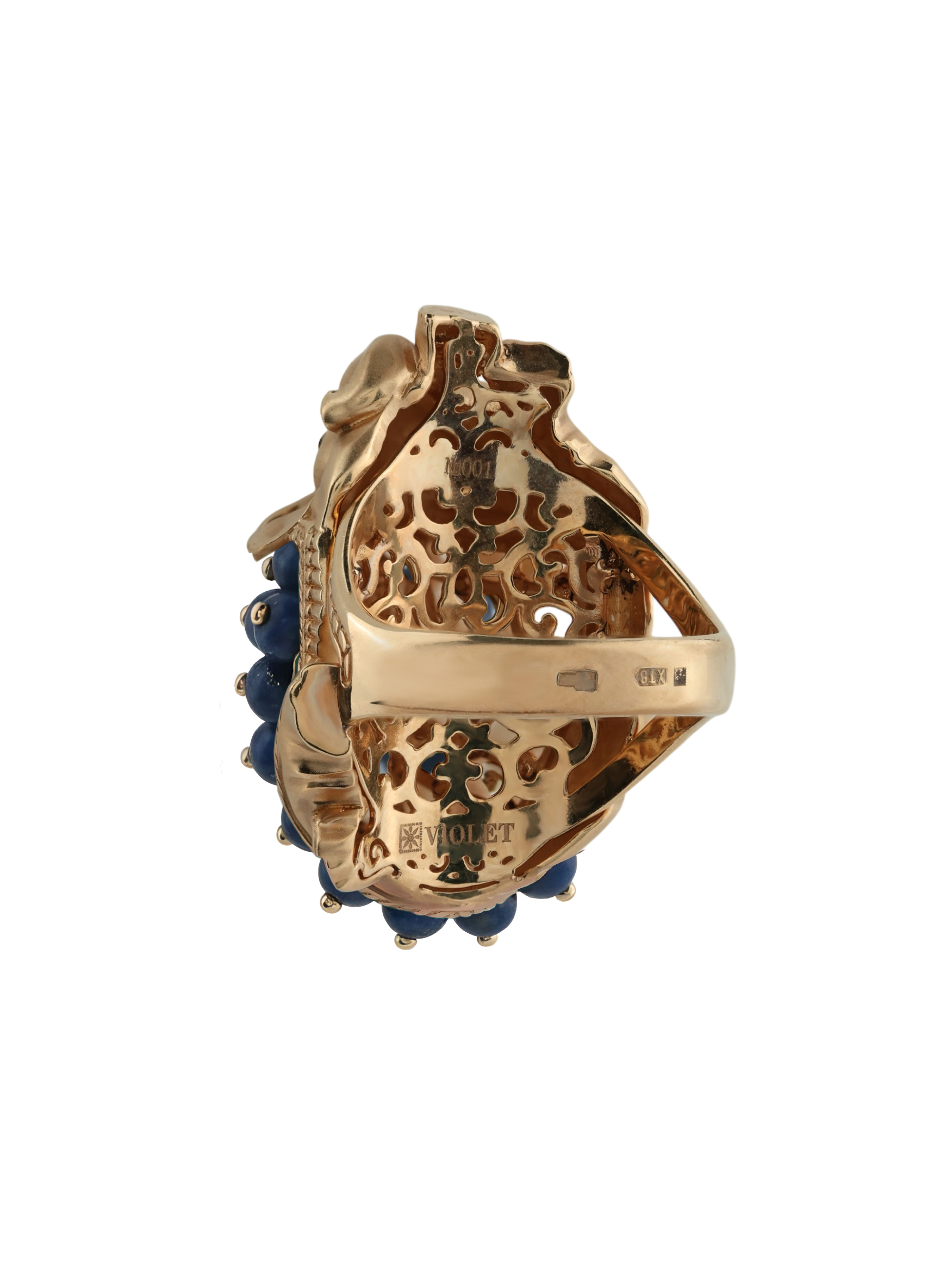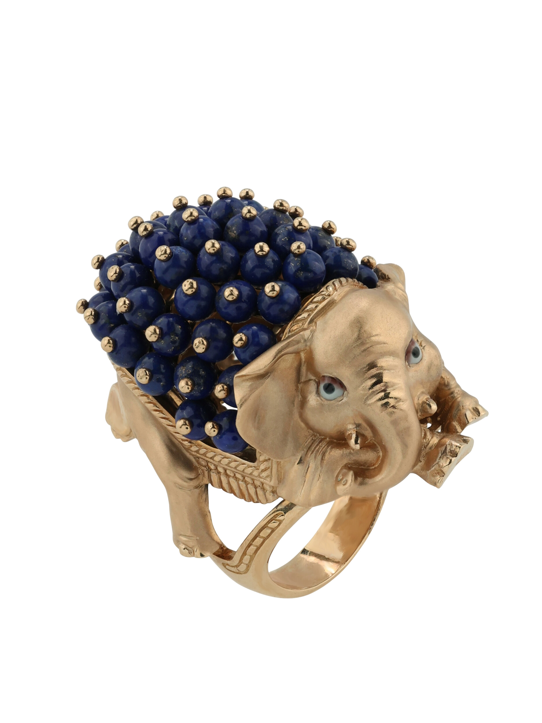 Представляем вашему вниманию уникальное кольцо из коллекции De luxe Premium — Слонята, которое станет главным акцентом любого образа. Это ювелирное изделие выполнено из красного золота 585 пробы и привлекает внимание своим необычным дизайном в виде слона. Мастера уделили особое внимание деталям, украсив спину животного россыпью из 46 вставок лазурита. Глубокий синий цвет натурального камня, имеющего форму аккуратных бусин, гармонично сочетается с теплым блеском металла. Выразительный взгляд слона подчеркнут с помощью ювелирной эмали, придающей изделию особую художественную ценность.