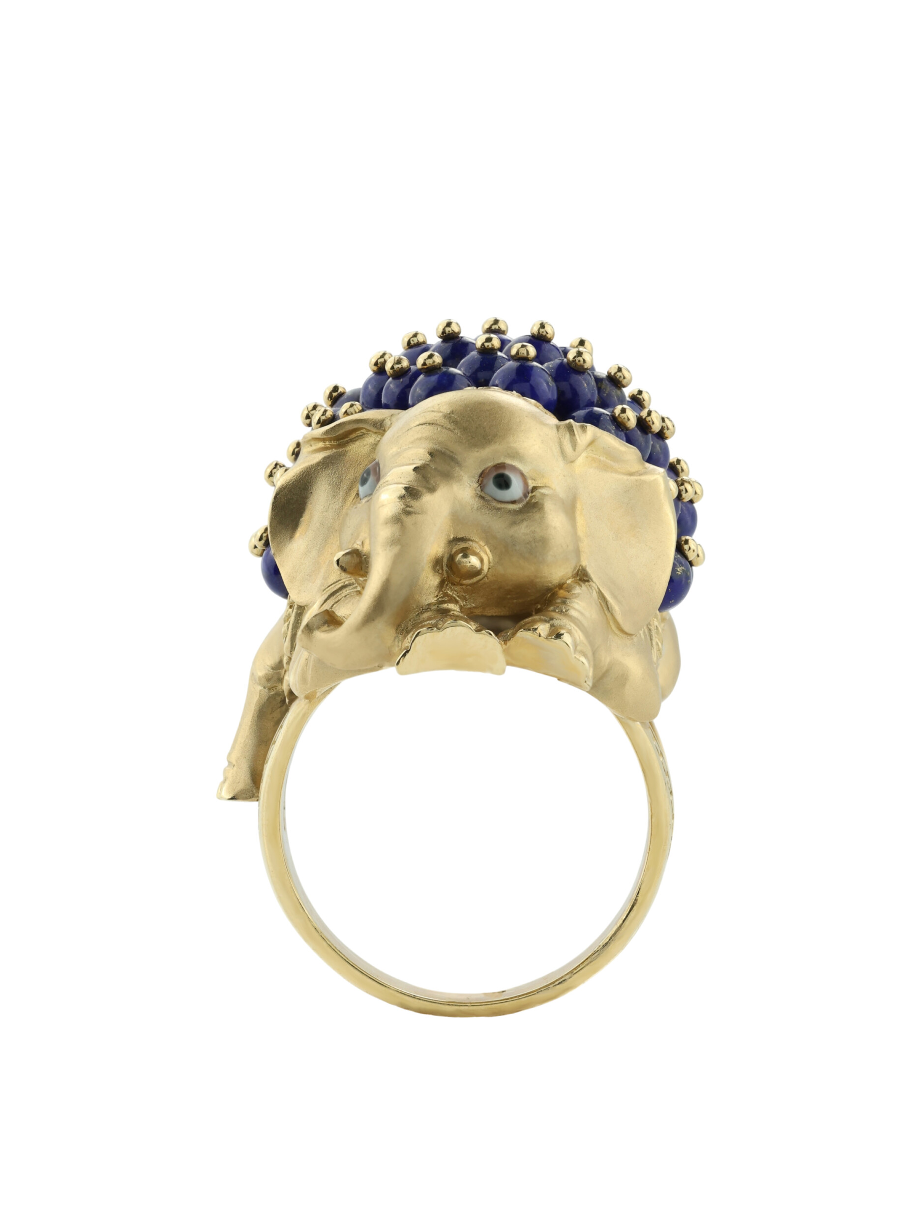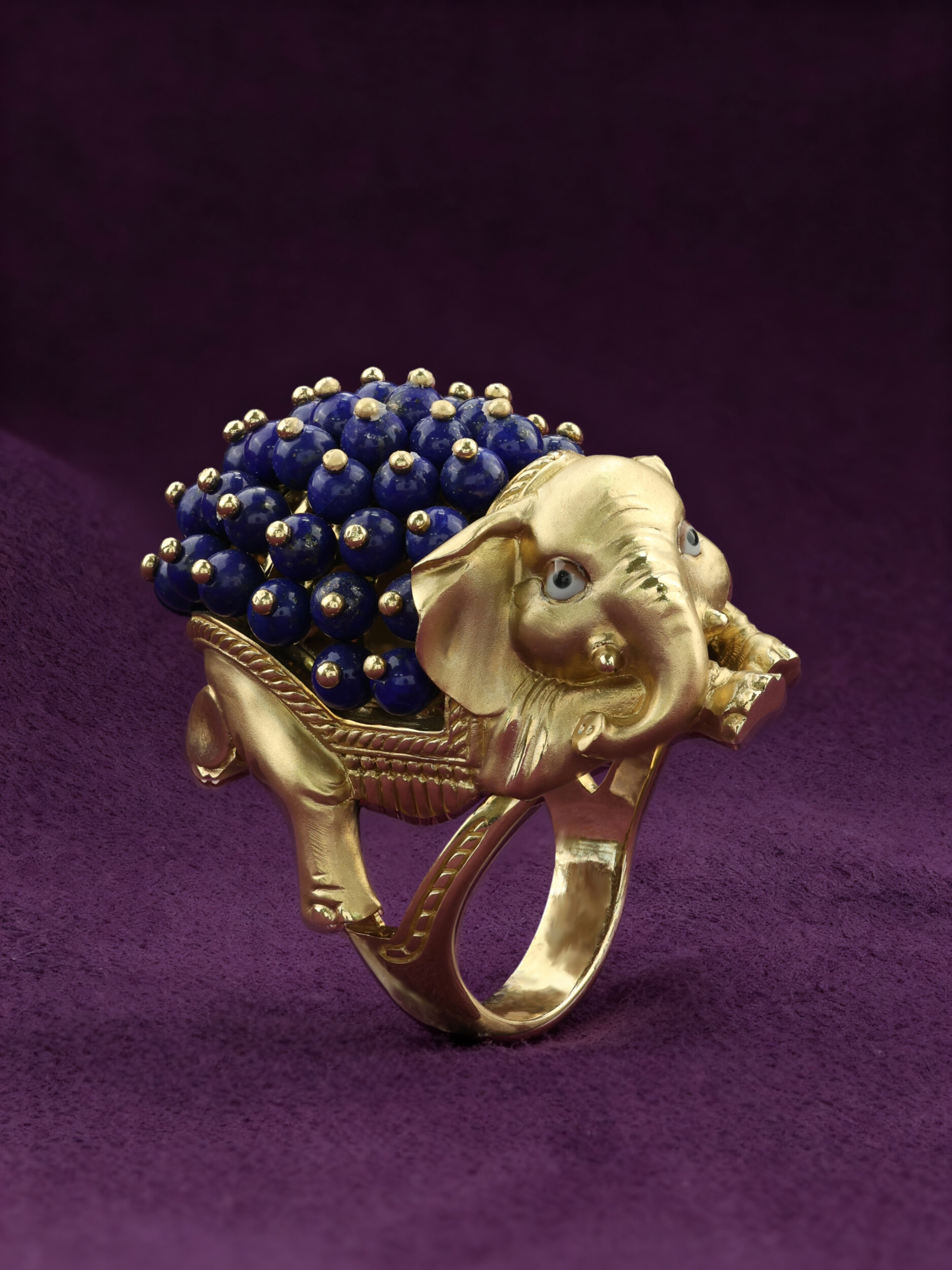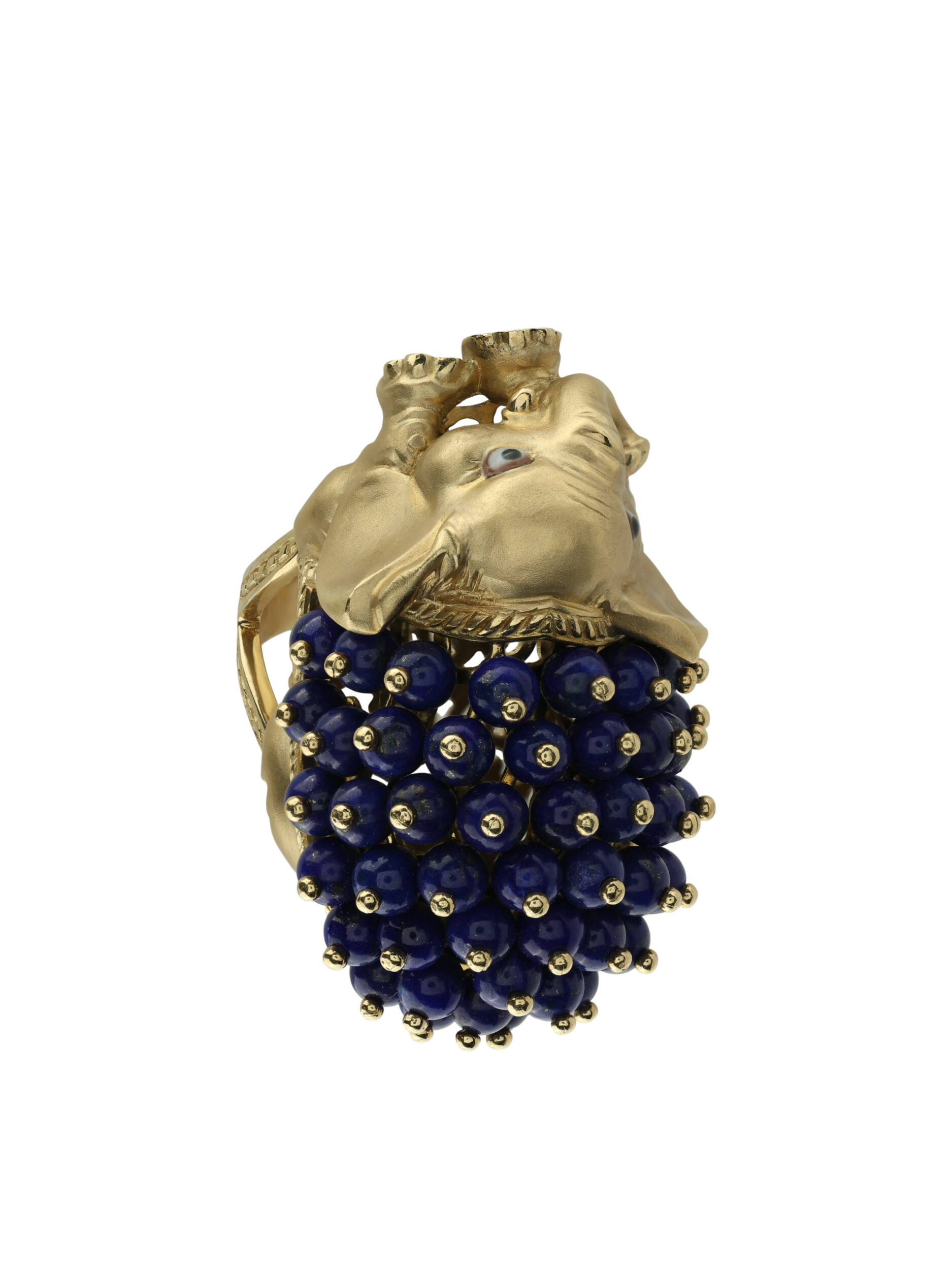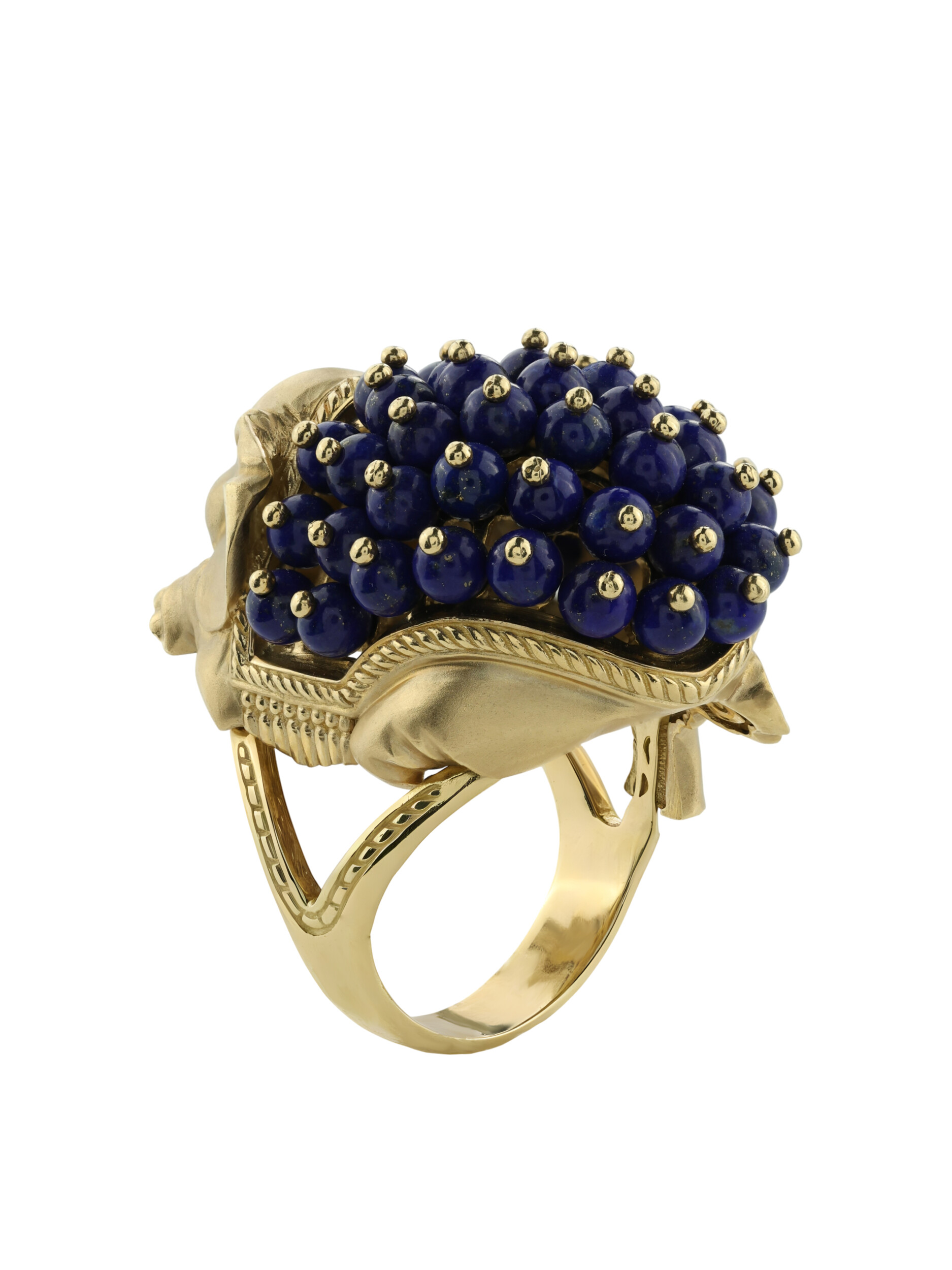 Декоративная часть изделия украшена 46 вставками из лазурита в форме аккуратных бусин, которые создают эффектный объем. Использование эмали в оформлении добавляет яркие акценты, подчеркивая статусность и оригинальность изделия. Такое кольцо станет заметным аксессуаром как для женщин, так и для мужчин, предпочитающих нестандартные и смелые решения в ювелирных украшениях.