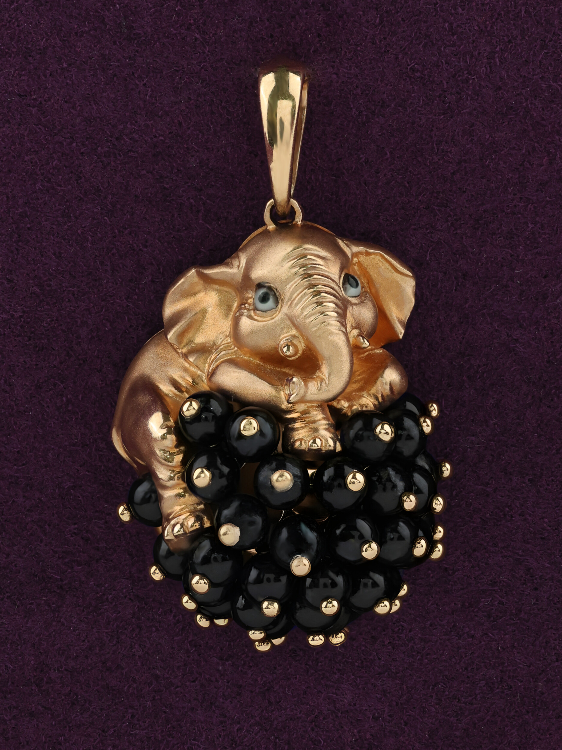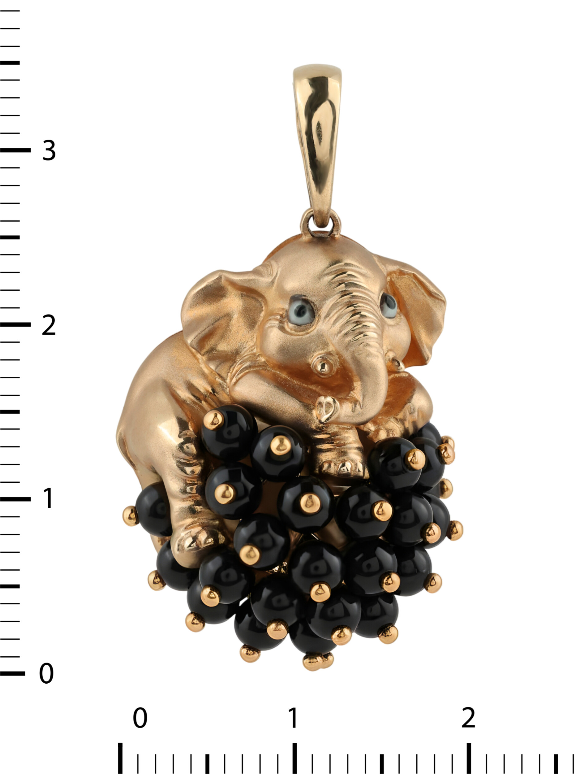 Главная особенность подвески — искусное сочетание благородного металла и контрастных вставок. Основание изделия украшено 34 вставками из черного оникса, имеющими форму бусин, которые создают эффектный объем и глубину. Глубокий черный цвет оникса гармонично дополнен элементами эмали, подчеркивающей выразительные детали декора. Разноцветный акцент эмали в сочетании с черными бусинами придает украшению уникальный и стильный вид.