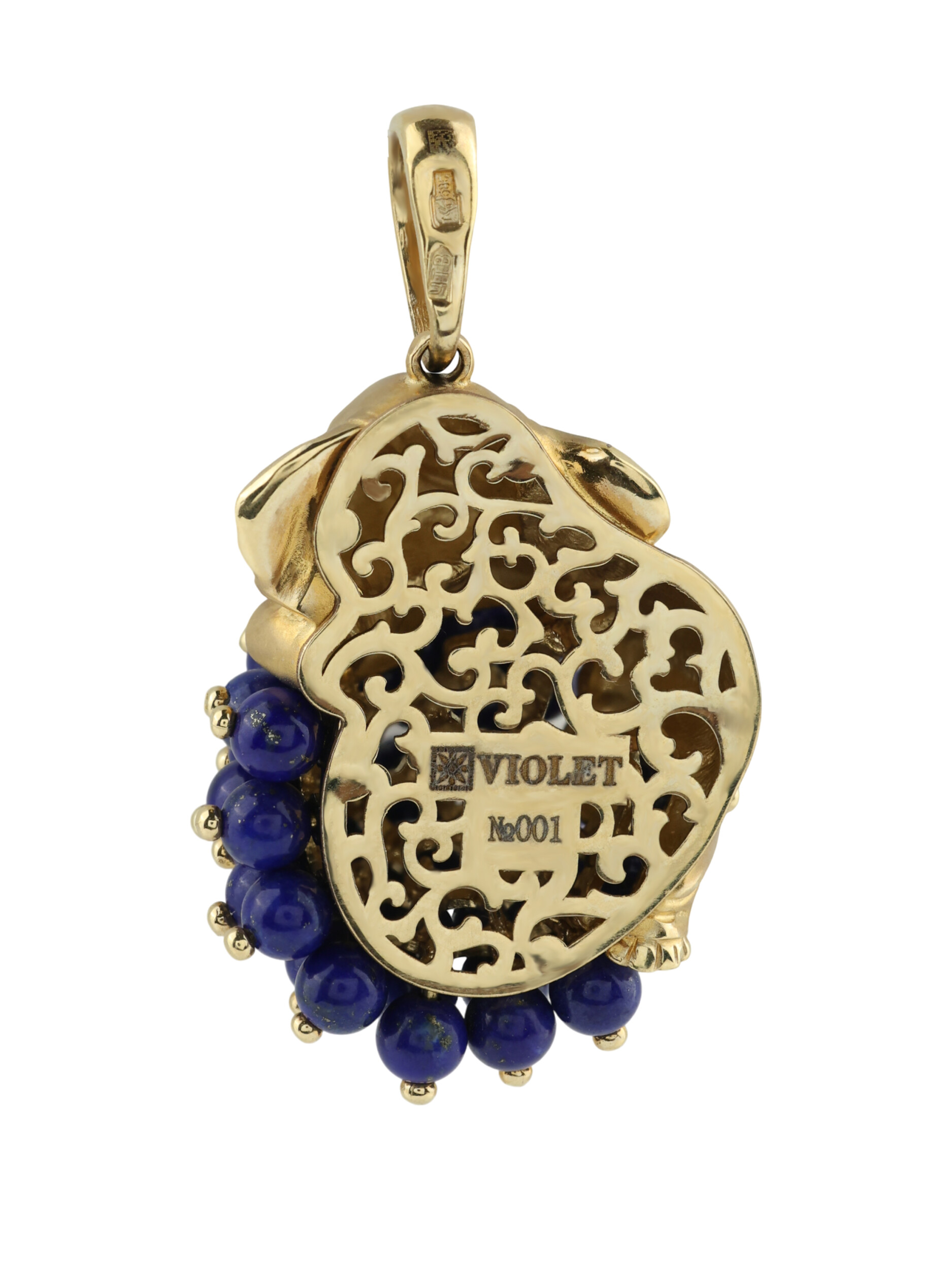В дизайне композиции использовано 34 вставки лазурита в форме аккуратных бусин, которые создают насыщенный синий объем, контрастирующий с золотой поверхностью. Элегантный акцент добавляет деликатная эмаль, подчеркивающая детали образа. Такая подвеска станет ярким завершением образа и гармонично дополнит как женский, так и мужской гардероб. Благодаря универсальному стилю это украшение прекрасно вписывается в различные комплекты, добавляя им ноту эксклюзивности.