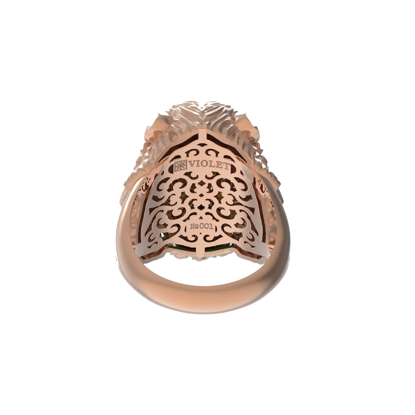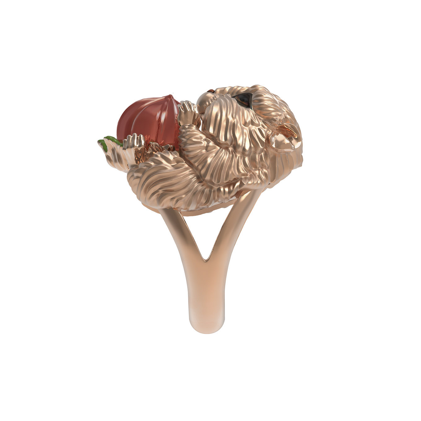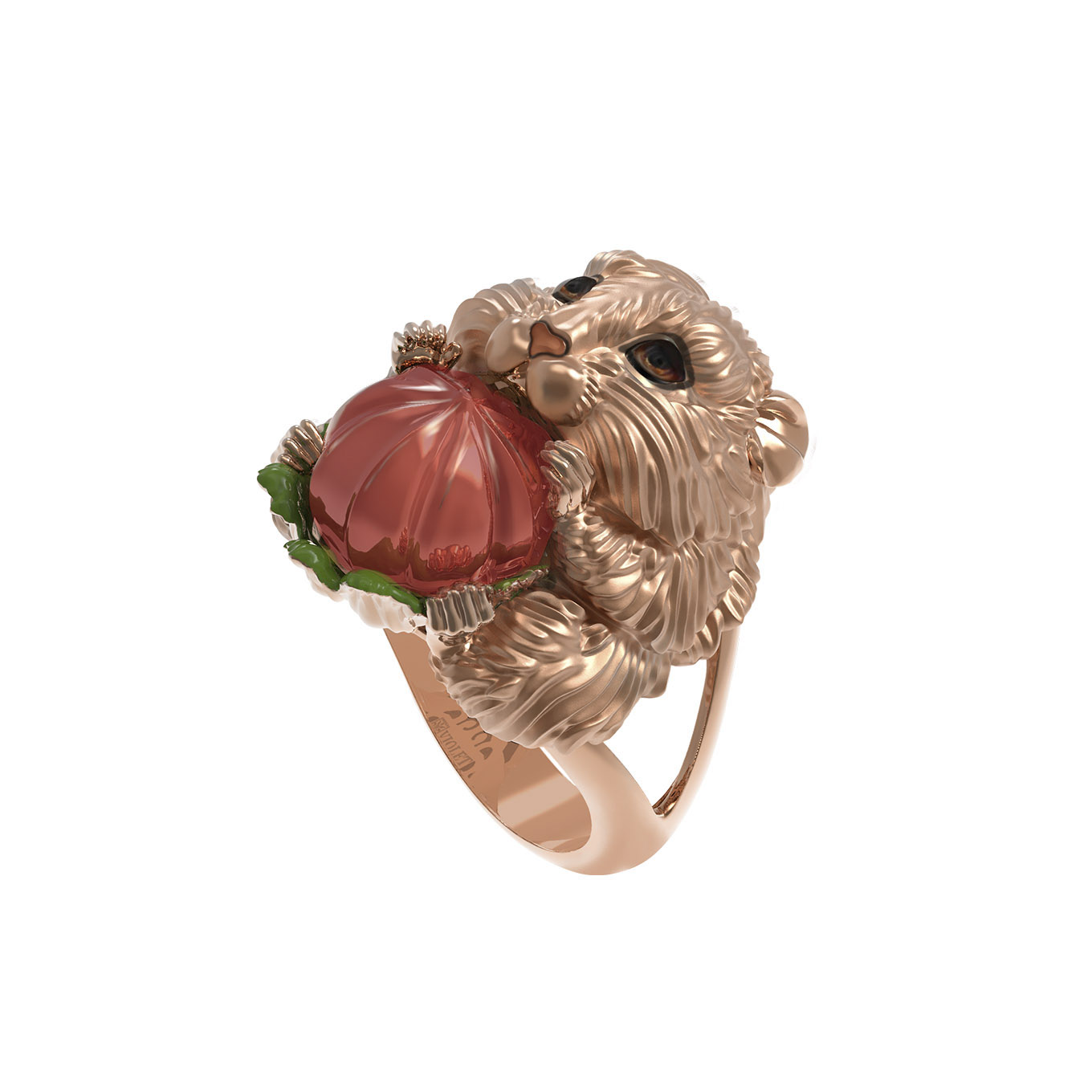 Для создания этого украшения использовано качественное красное золото 585 пробы, которое придает изделию теплое, благородное сияние. В качестве декоративного элемента применена ювелирная эмаль: разноцветные вставки эффектно подчеркивают детали дизайна, добавляя акценты в общую композицию. Такое кольцо с животными станет отличным дополнением к вашему образу или необычным подарком для ценителей эксклюзивных ювелирных изделий.