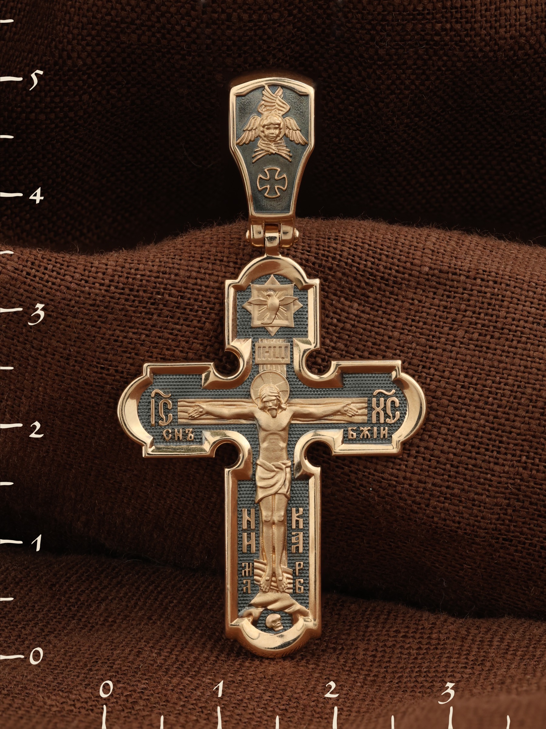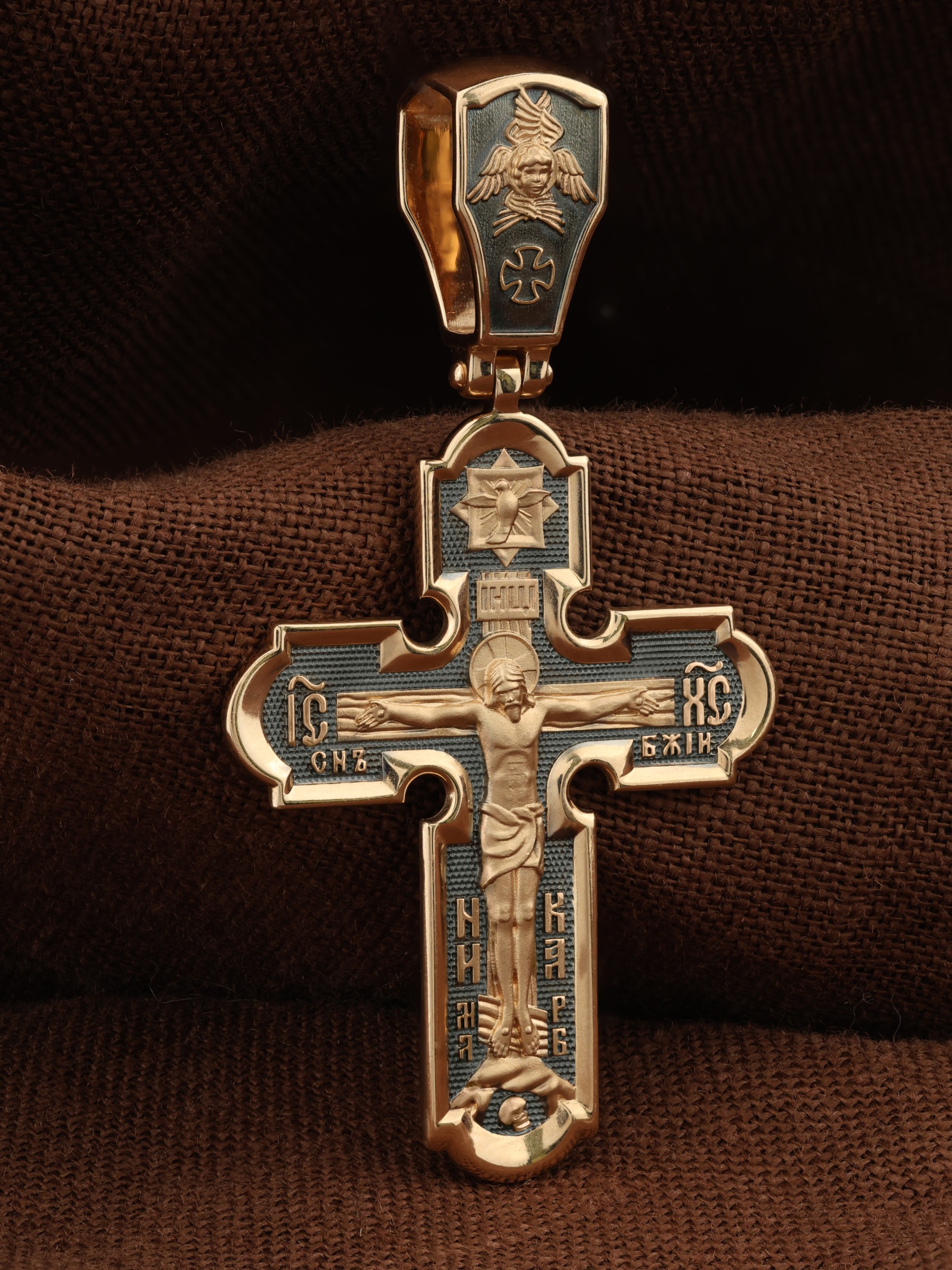 На лицевой стороне креста изображено Распятие Иисуса Христа. Господь представлен свободно покоящимся на кресте с простертыми руками и как бы обнимающим всю Вселенную. Он — Спаситель, искупивший грехи мира, «поправший смертию смерть» и призывающий к Себе «все концы земли». Поэтому рядом с Его образом помещены слова «НИКА» и «Царь Славы». Эти слова характеризуют Господа как Великого Архиерея, победителя смерти. Верхняя перекладина символизирует титло — табличку, на которой, согласно Евангелию, было начертано: Иисус Назорей Царь Иудейский (IНЦI). Также Распятие сопровождается надписями, олицетворяющими Христа. Это святое имя Христа «IC» (Иисус) «ХС» (Христос) и словосочетание «СЫН БОЖИЙ». Крест стоит на горе камней, символизирующих Голгофу, в основании которой различается череп. Это голова Адама. На кулонном кольце помещено изображение серафима.
