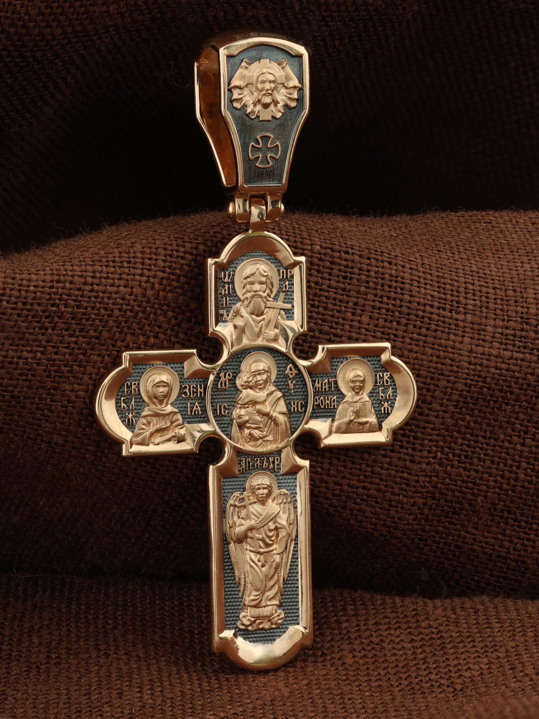 На кресте внизу изображен Ангел Хранитель, слева — Святая Блаженная Ксения, справа — Святая Блаженная Матрона, вверху — пророк, почитающийся в христианстве, Предтеча Господень Иоанн Креститель. На кулонном кольце помещено изображение Спаса Нерукотворного — образ Спасителя, который Он запечатлел на плате и передал для исцеления больному проказой царю Эдессы. Ему придается победное и защитное значение.