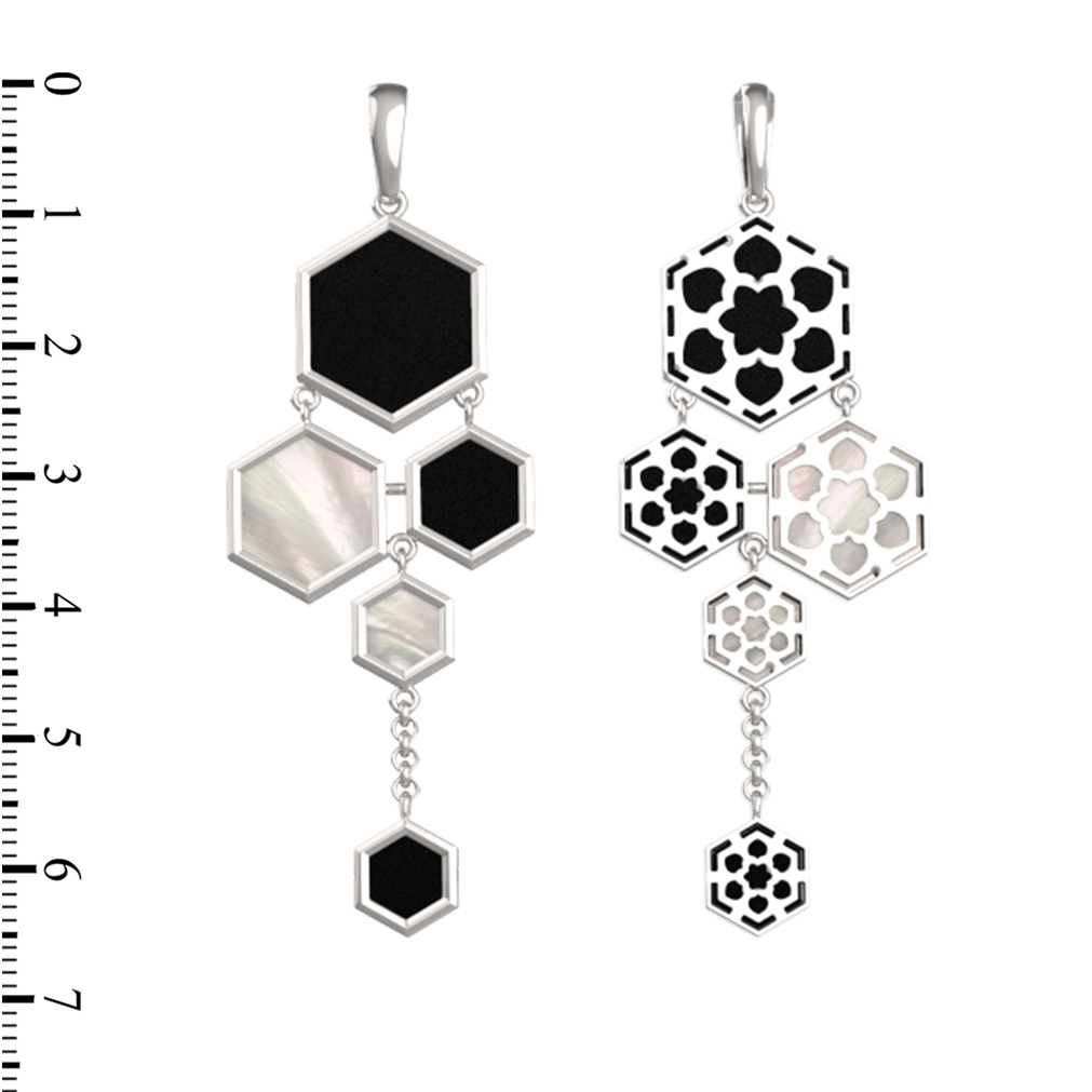 Изысканная подвеска из белого золота 585 пробы — яркий представитель коллекции De Luxe — Молекула, вдохновленной лаконичной красотой природных структур. Ювелиры воплотили концепцию молекулы в геометрических формах: основу украшения составляют вставки в форме шестигранника, которые гармонично переплетаются друг с другом. Контрастное сочетание материалов подчеркивает благородство металла: глубокий черный цвет оникса эффектно дополняет мягкое сияние перламутра.