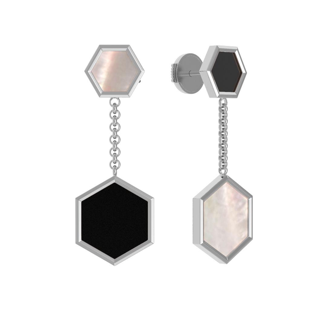 Центральным элементом композиции стали вставки в форме шестигранника. В каждом изделии гармонично переплетаются два противоположных материала: глубокий черный оникс и нежный перламутр. Такое сочетание цветов — перламутрового и черного — позволяет серьгам легко адаптироваться под любой образ, будь то деловой костюм или вечерний наряд. Всего в украшении использованы 2 вставки, образующие изящную подвесную конструкцию на цепочке, которая мягко играет при движении.