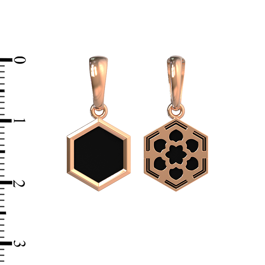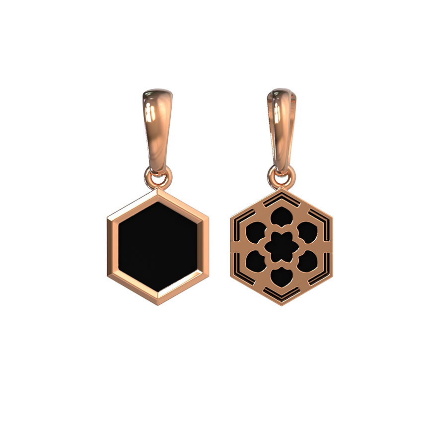 Представляем изысканную подвеску из красного золота 585 пробы, которая станет центральным акцентом вашего образа. Данное ювелирное изделие воплощает в себе лаконичность и глубокий символизм. Центральным элементом украшения выступает вставка из оникса глубокого черного цвета. Форма вставки в виде строгого шестигранника подчеркивает современную эстетику и архитектурную точность линий. Дизайн изделия вдохновлен структурой молекулы, что придает аксессуару интеллектуальный и динамичный характер.