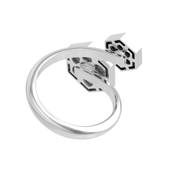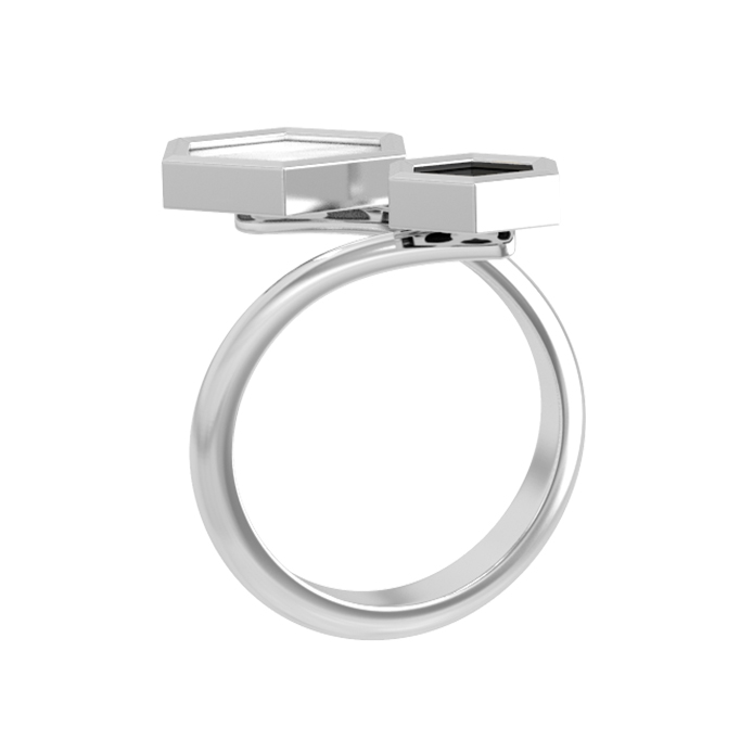 Элегантное кольцо из белого золота 585 пробы — яркий акцент, созданный для тех, кто ценит современный дизайн и лаконичность форм. Вдохновением для ювелиров стала научная эстетика: дизайн Молекула воплощает строгость линий и гармонию геометрии. Центральным элементом украшения выступают вставки в форме шестигранника, которые притягивают взгляд своим контрастным сочетанием фактур и оттенков.