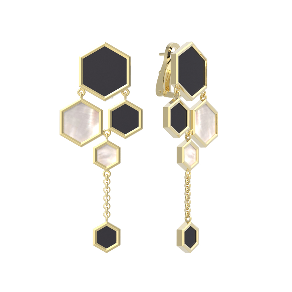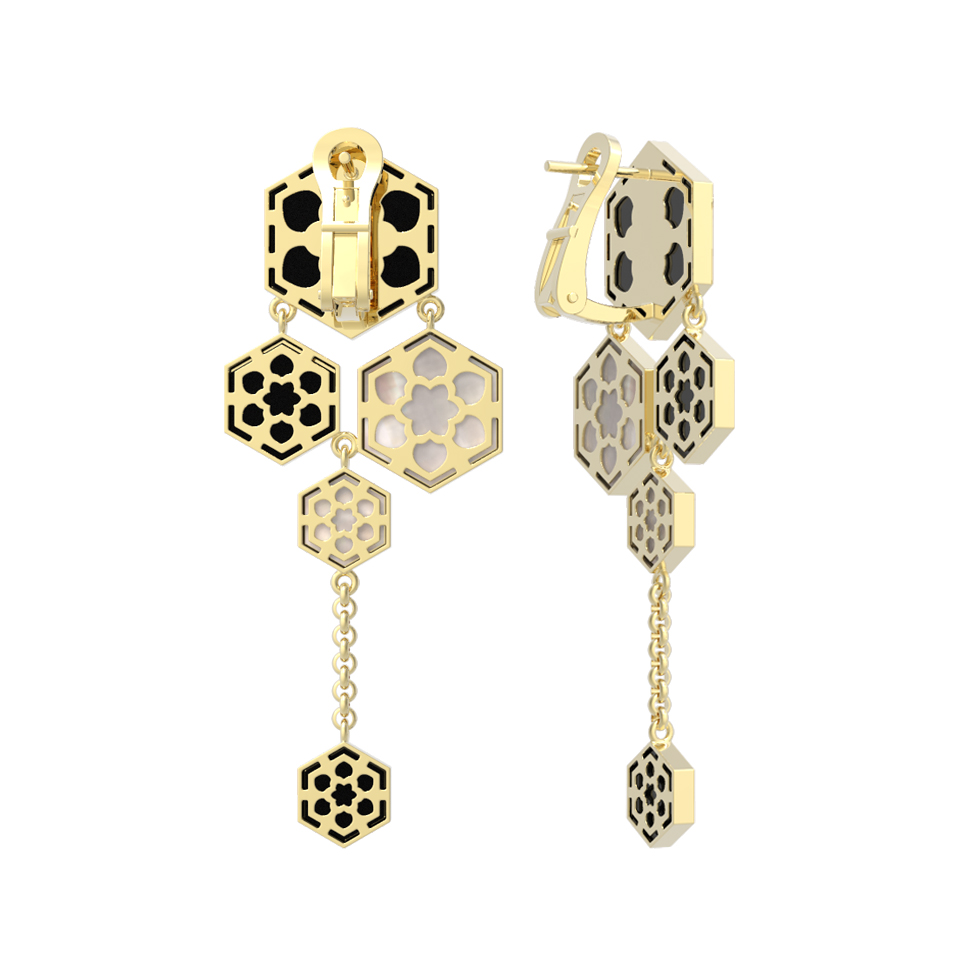 В оформлении ювелирного изделия использовано 6 вставок, чередующихся между собой по цвету и фактуре. Глубокий черный оникс контрастирует с нежным, переливающимся перламутром, создавая выразительный визуальный эффект. Золото лимонного оттенка мягко подчеркивает блеск вставок, делая серьги заметным акцентом вашего стиля. Это украшение станет прекрасным дополнением для создания сложных и статусных комплектов.