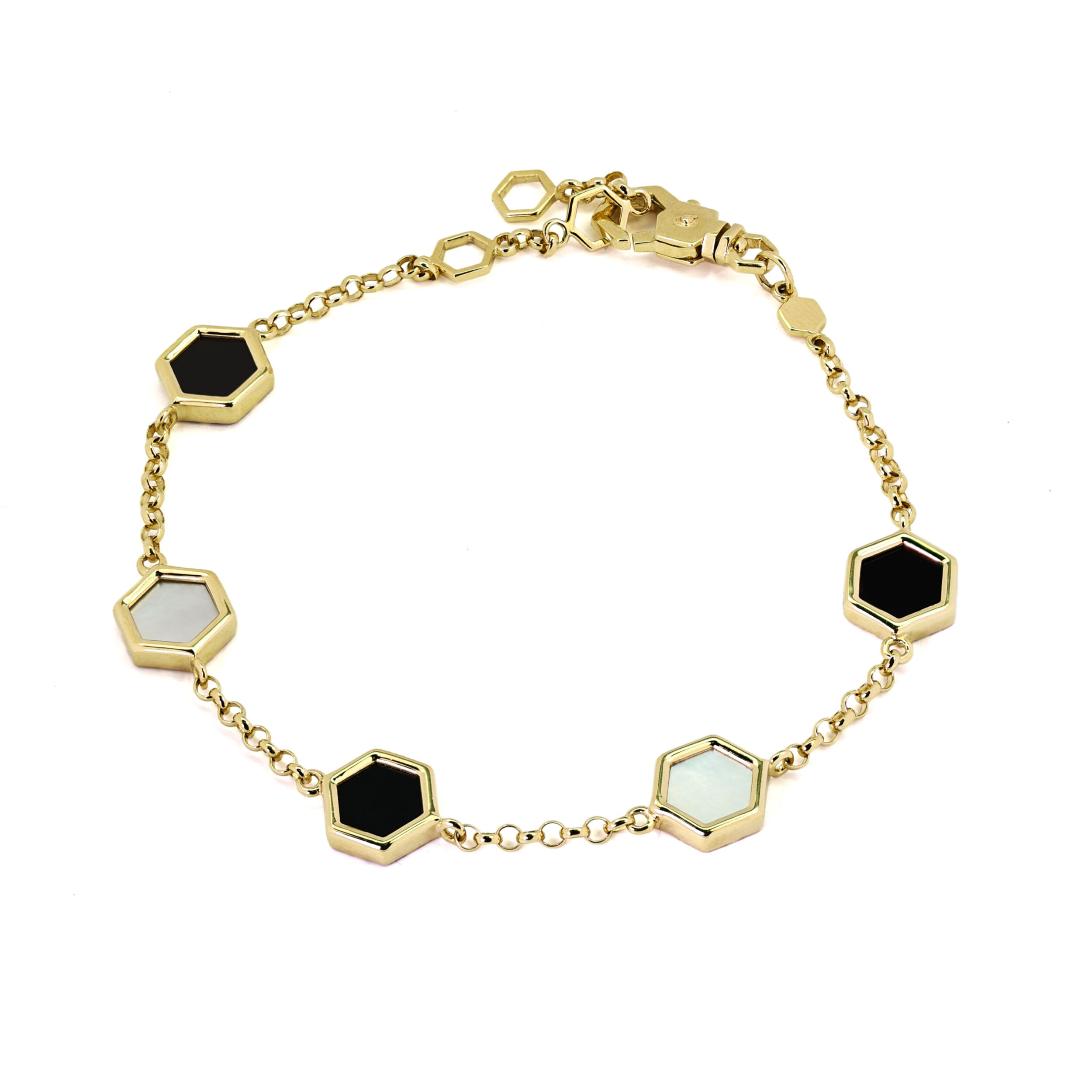 Откройте для себя воплощение современной элегантности в браслете из лимонного золота 585 пробы, представленном в рамках изысканной коллекции De Luxe — Молекула. Дизайн изделия, вдохновленный структурой молекулы, превращает ювелирное украшение в настоящий арт-объект. Акцентная деталь модели — 3 вставки правильной формы шестигранника, которые чередуются по периметру тонкой цепи. Контрастное сочетание черного оникса и нежного перламутра создает эффектную визуальную игру, подчеркивая благородство лимонного оттенка золота.