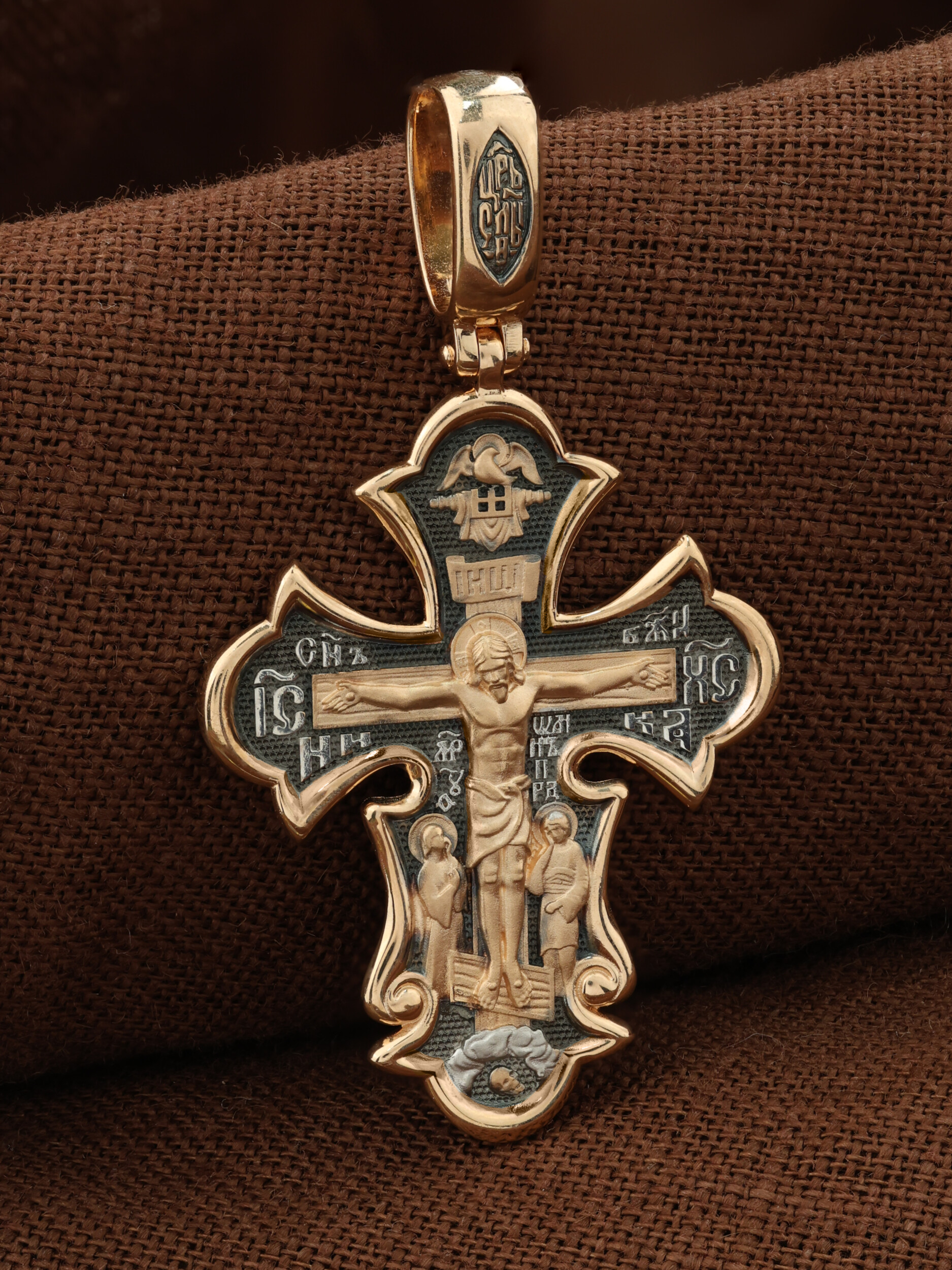 На лицевой стороне креста изображено Распятие Господа и Спасителя нашего Иисуса Христа, отдавшего Себя на смерть, для искупления грехов мира. Крест является символом жертвенной любви всеблагого Бога к падшим людям, всепобеждающим духовным оружием христиан, основанием и средоточием церковной жизни. Верхняя перекладина символизирует титло — табличку, на которой, согласно Евангелию, было начертано: Иисус Назорей Царь Иудейский (IНЦI). Также Распятие сопровождается надписями, олицетворяющими Христа. Надпись «IС» « ХС», что означает Иисус Христос, слово «НИКА», что означает «победитель» и слова «Сын Божий» помещается на разных сторонах поперечной перекладины креста. Над вершиной Распятия помещено изображение Святого Духа в виде голубя. Слева от Распятия изображена Пресвятая Богородица, справа — апостол и евангелист Иоанн Богослов, один из ближайших учеников Иисуса Христа. Возвышение, на котором стоит Крест, символизирует гору Голгофу, на которой произошло Распятие. Под подножием Креста изображена покоящаяся голова (череп) Адама. На кулонном кольце помещена надпись «Царь Славы».
