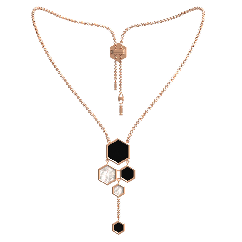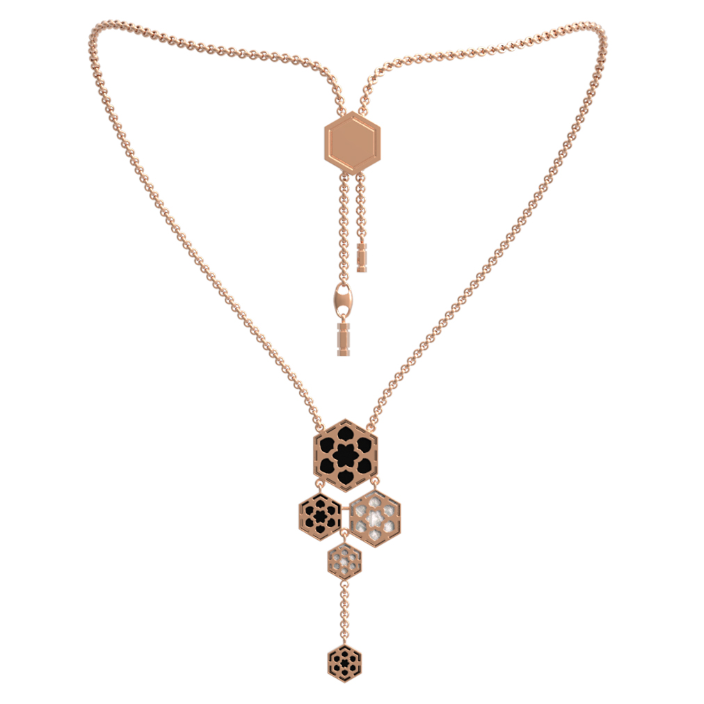 Колье из красного золота 585 пробы из коллекции De Luxe — Молекула воплощает в себе современную эстетику и архитектурную точность. Дизайн изделия вдохновлен структурой молекулы, что придает украшению динамичный и узнаваемый облик. Центральным элементом композиции стали три вставки в форме шестигранника, которые гармонично сочетаются с общим стилем аксессуара.