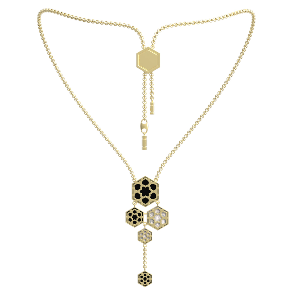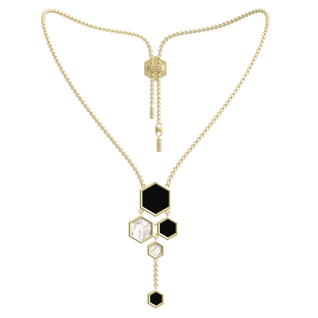 Особое очарование колье придает контрастное сочетание вставок: глубокий черный цвет оникса гармонично дополняется нежным переливом перламутра. Это универсальное ювелирное изделие, созданное как для женщин, так и для мужчин, которые ценят современный стиль и архитектурные формы в украшениях. Тонкая работа подчеркивает насыщенный оттенок лимонного золота, создавая динамичный и цельный визуальный образ.