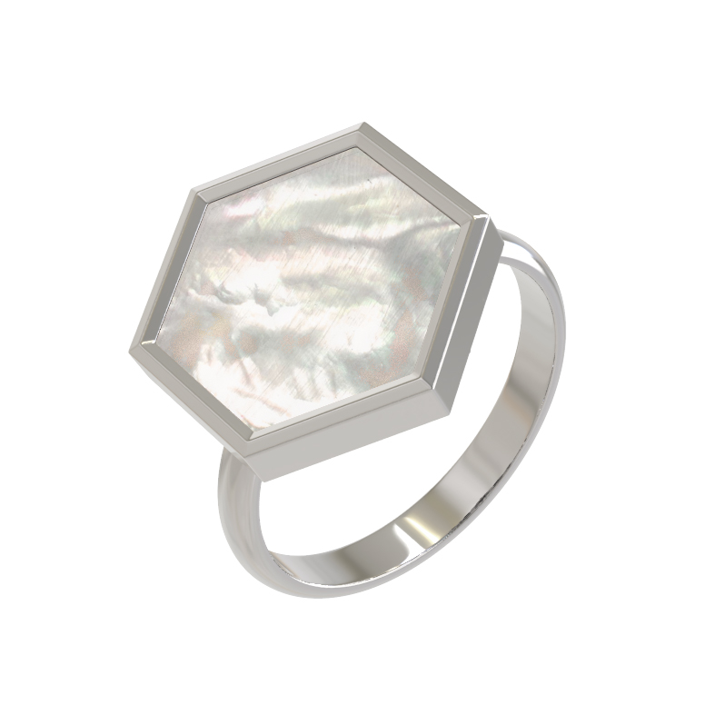 Кольцо из белого золота 585 пробы из коллекции De Luxe — Молекула воплощает эстетику минимализма и архитектурную точность линий. Дизайн изделия вдохновлен структурой молекулы, что выражается в геометрически строгой форме вставок — шестигранников. Это украшение объединяет благородный холодный блеск драгоценного металла и мягкое, переливающееся сияние натурального перламутра. Белый цвет материала подчеркивает чистоту исполнения и лаконичность форм, делая аксессуар выразительным акцентом вашего образа.