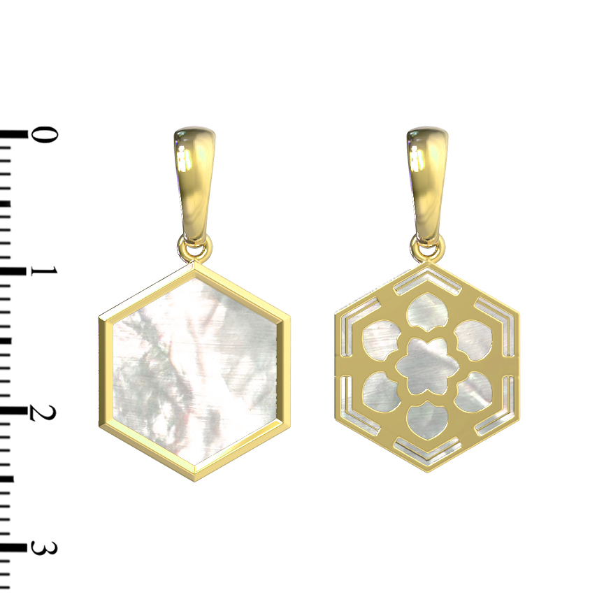 Вставка из перламутра шестигранной формы притягивает взгляд своим мягким переливом, создавая неповторимый контраст с лимонным оттенком золота. Изящная проработка деталей делает это украшение универсальным: лаконичность форм позволяет носить его как женщинам, так и мужчинам. Такая подвеска подчеркнет индивидуальность владельца и идеально дополнит как повседневный, так и вечерний наряд.