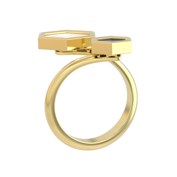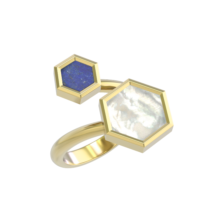 Кольцо из лимонного золота 585 пробы из коллекции De Luxe — Молекула воплощает современный взгляд на ювелирное искусство. Дизайн модели вдохновлен эстетикой молекулы, где строгие геометрические формы обретают новое звучание. Центральным элементом украшения стали вставки в форме шестигранника, выполненные из натурального лазурита глубокого синего цвета и перламутра с его неповторимым мягким сиянием.